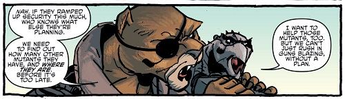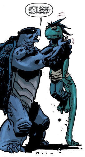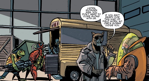 L’équipe se préparait à partir au combat, chargeant la fourgonnette. Lorsque tout était prêt, Hob partit voir leur nouveau compagnon, lui proposant de rester se reposer. Mais Mutagen Man avait envie de les aider. Ayant entendu la discussion entre Slash et lui un peu plus tôt, il voulait venir en aide à ses semblables, bien qu’il ignorait encore qui étaient les deux mutants retenus.
