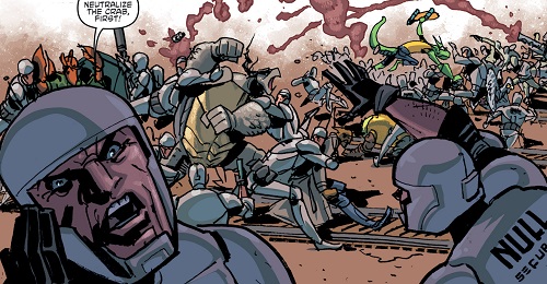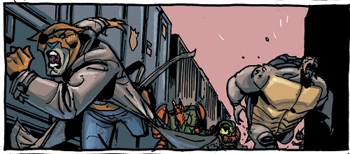 C’est alors que le chat sortit son arme à feu et tira sur la femme à la peau rouge. Déçu, il s’attendait à une réaction des soldats, des tirs peut-être, ou au moins un combat. Rien. La main de madame Null se levait de son corps au sol. Touchée par plusieurs tirs, elle souffrait, mais allait très bien – elle était immortelle. Entendant les ordres, les soldats fondaient sur les mutants au signal de leur supérieure. Aussitôt, Herman était aveuglé par des gaz et Old Hob électrocuté par des tasers. Pigeon Pete était de nouveau mis dans un sac. Seul Gecko semblait s’en sortir, esquivant les soldats et montant sur le wagon d’un train. Slash était dépassé ; une montagne de soldats se jetait sur lui. Les rêves de rébellion mutante de Hob semblaient s’évanouir. Terrorisé, il demandait à son ami chélonien de prendre la fuite et de revenir avec des renforts… Slash repoussait les soldat avant de prendre ses jambes à son coup.