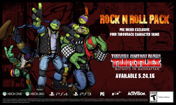 Pour la pré-commande du jeu, deux DLC et un posters ont été proposés aux fans. Le premier est le pack Samouraï, permettant aux acheteurs qui prirent le jeu à travers les plateformes de téléchargement (PlayStation®Store, Xbox Games Store et Steam) d’obtenir des tortues vêtues d’armures de samuraï. Les deux autres offres concernent la boutique GameStop, proposant un DLC Rock N’Roll Pack (inspiré des figurines Rock N’Rollin’ Turtles de 1990) et un poster exclusif du jeu.