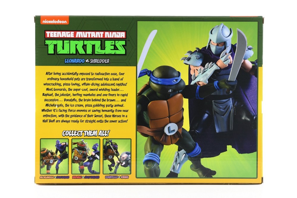 Avec l’arrivée de cette série dans les magasins début de 2019, ces figurines étaient vendues à travers des double-packs. Leonardo partageait sa boîte avec Shredder.