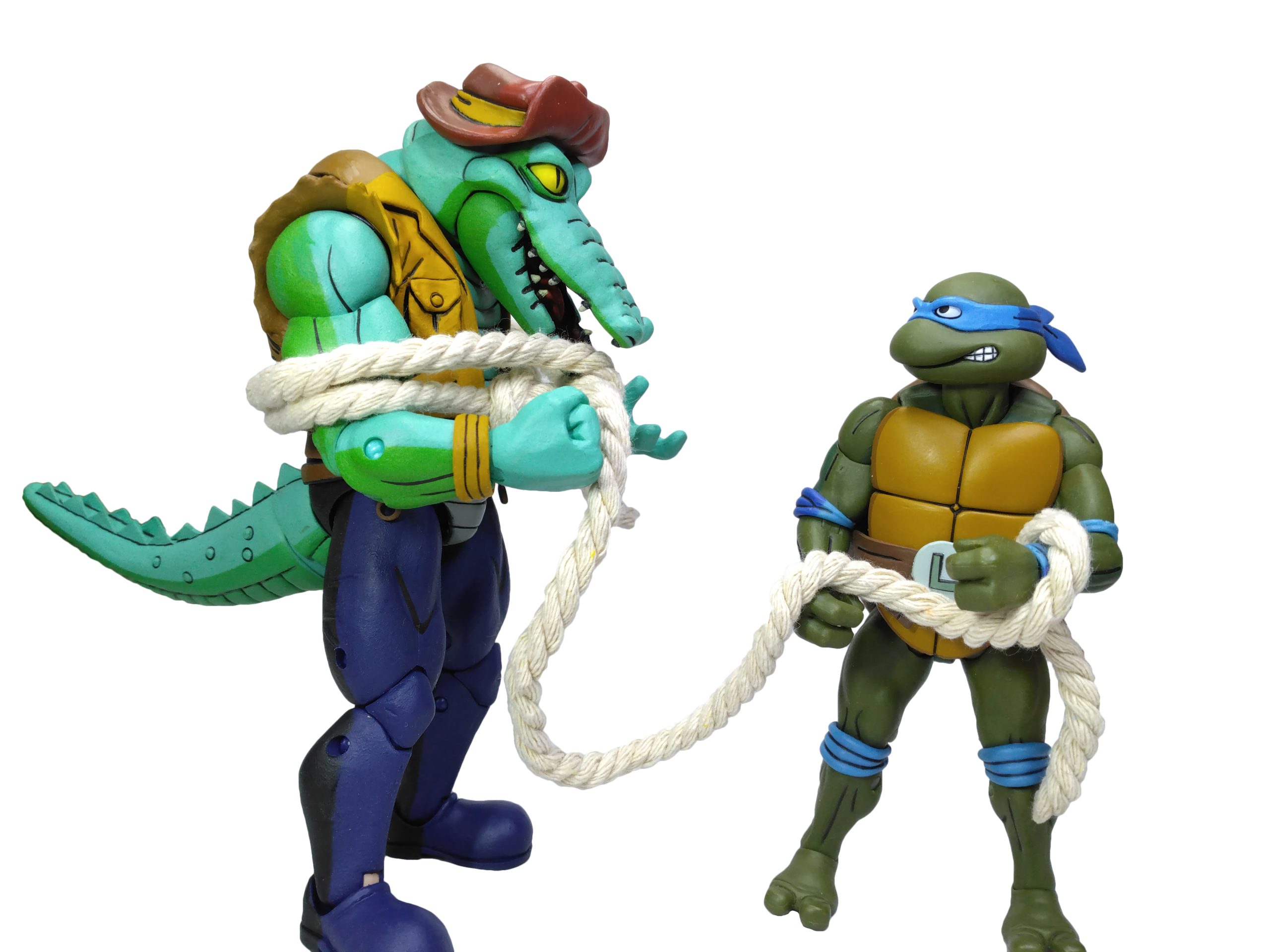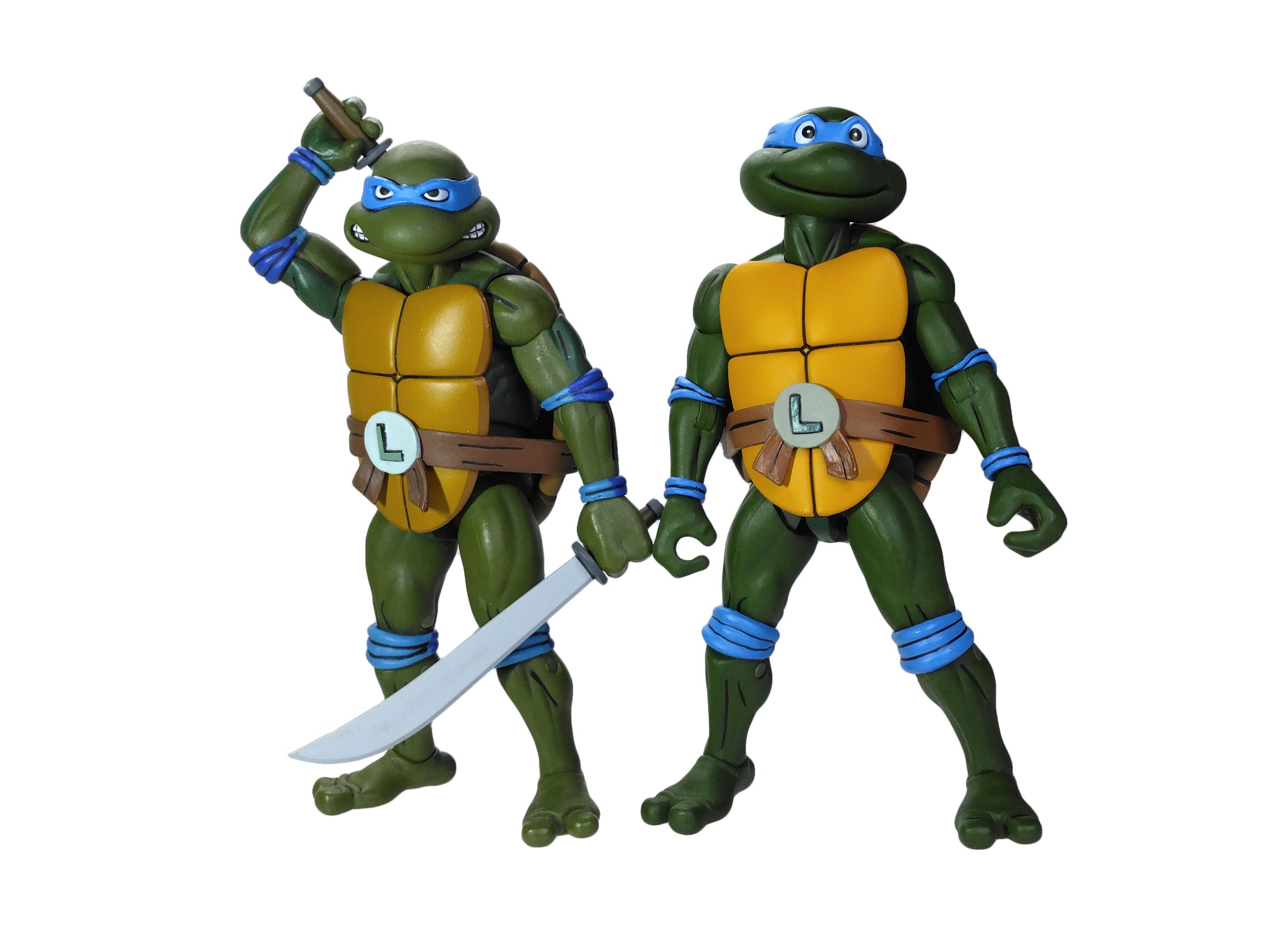 La figurine de Leonardo a été sculptée par Trevor Zammit. Une nuit, alors que l’artiste avait travaillé plus de neuf heures sur la figurine du Gremlin Georges, il voulut réaliser une tortue du dessin animé de 1987. Après neuf heures de travail supplémentaires et au lever du soleil, la tortue était prête. Il la montra à Randy Falk, à la tête des productions du fabricant. Ce dernier adora et voulut lancer une production de ces figurines, dont la licence venait d’être acquise. Zammit commença le travail de sculpture de cette gamme en février 2015. Le premier modèle sortit à l’occasion du pack exclusif Arcade game de NECA pour le San Diego Comic Con 2016.