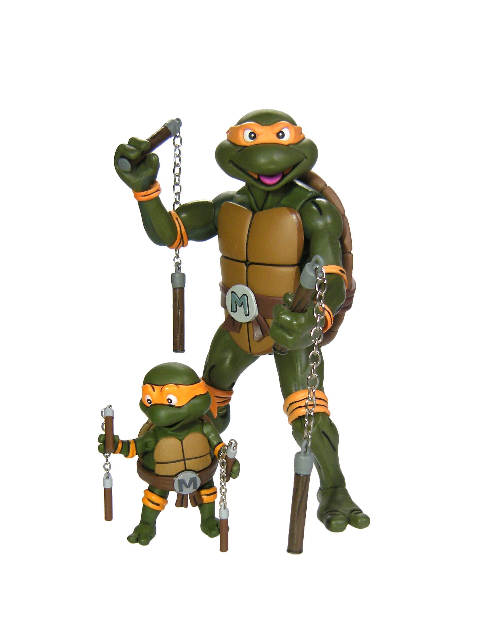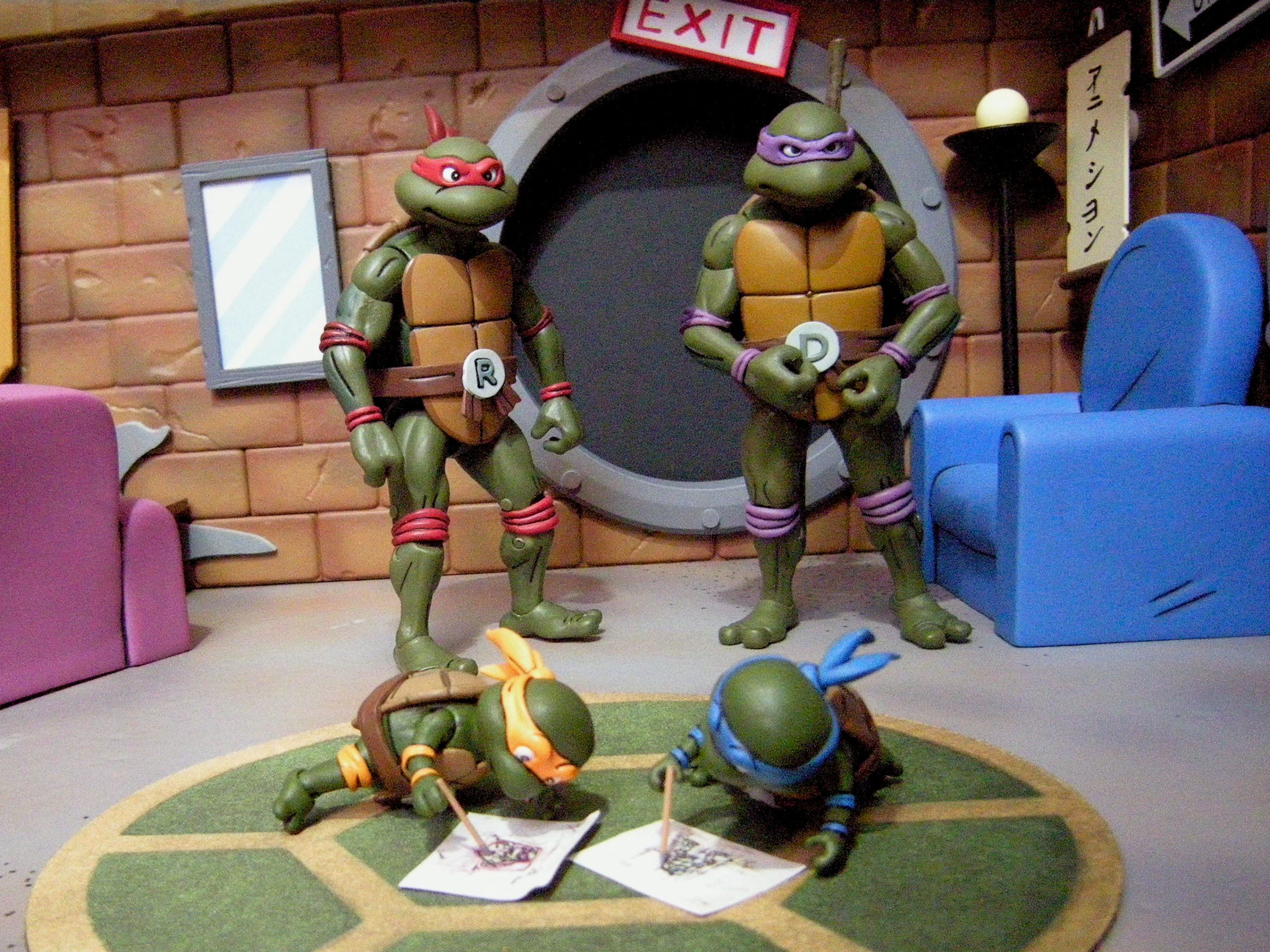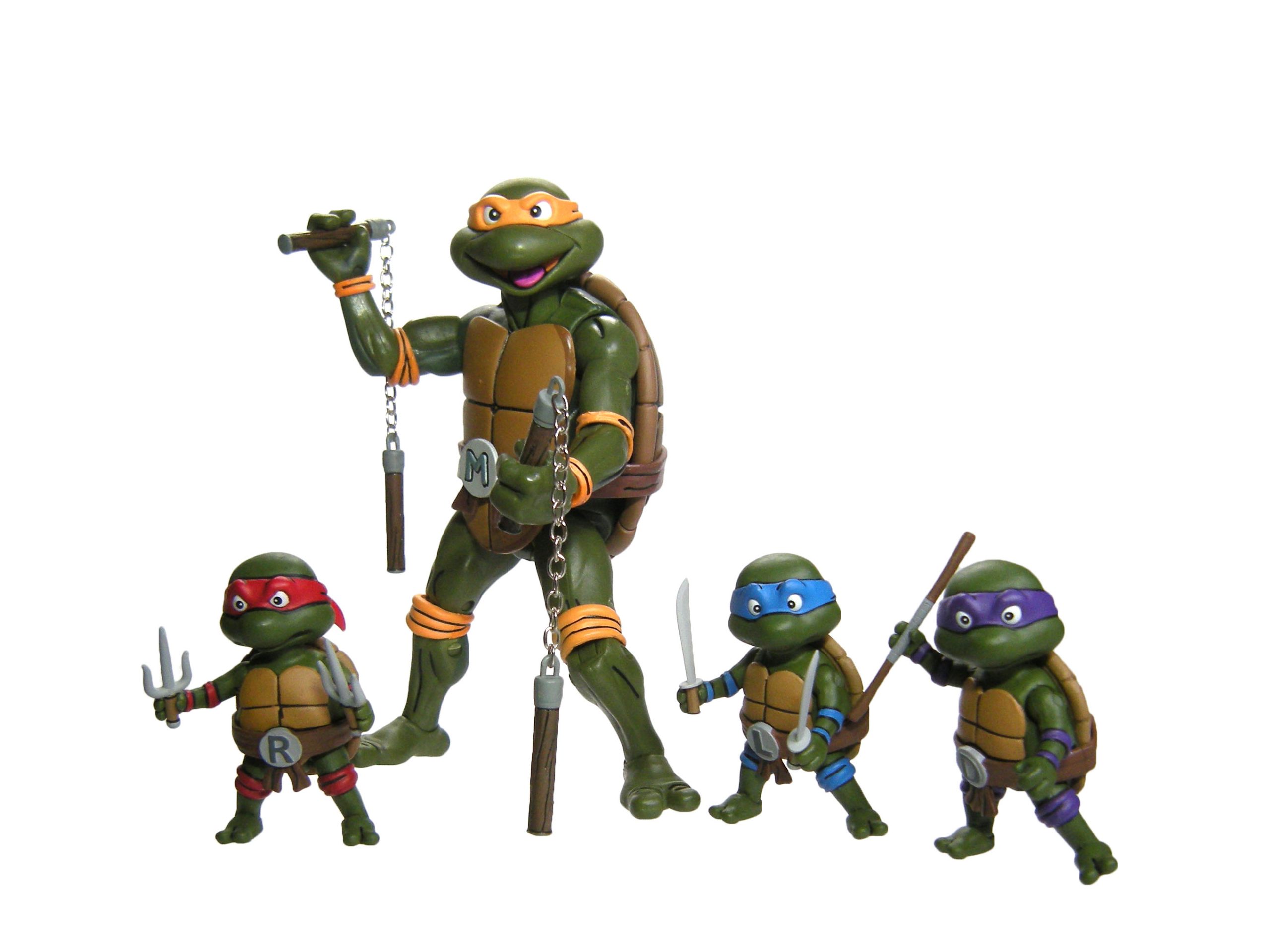 Par deux fois, les tortues sont redevenues des enfants. Premièrement après que Shredder ait empoisonné des pizzas, touchant Leonardo et Michaelangelo. Leurs frères eurent fort à faire pour combattre leurs ennemis et veiller sur les petits mutants turbulents (Retour à l’enfance, S4 E13). Le pire était à venir, lorsqu’une expérience de Donatello fonctionna mal et transforma toutes les tortues en enfants. Toutes, sauf Michaelangelo. Pour couronner le tout, Krang avait un plan sournois pour se débarrasser de la pègre de New York (Tortues sitting, S6 E4).