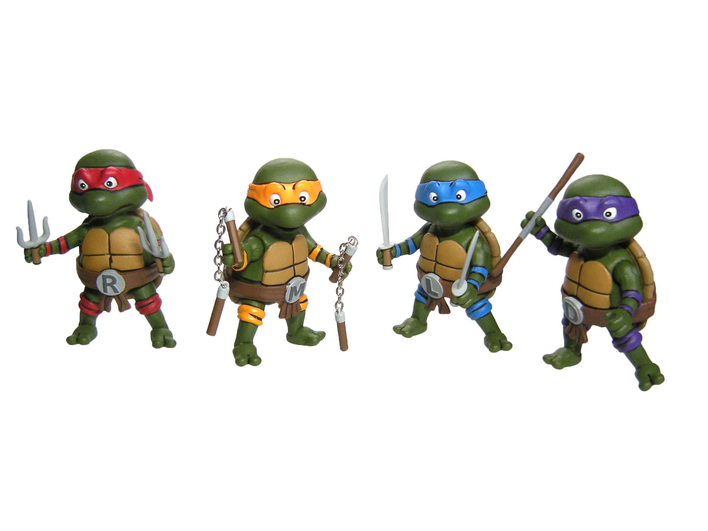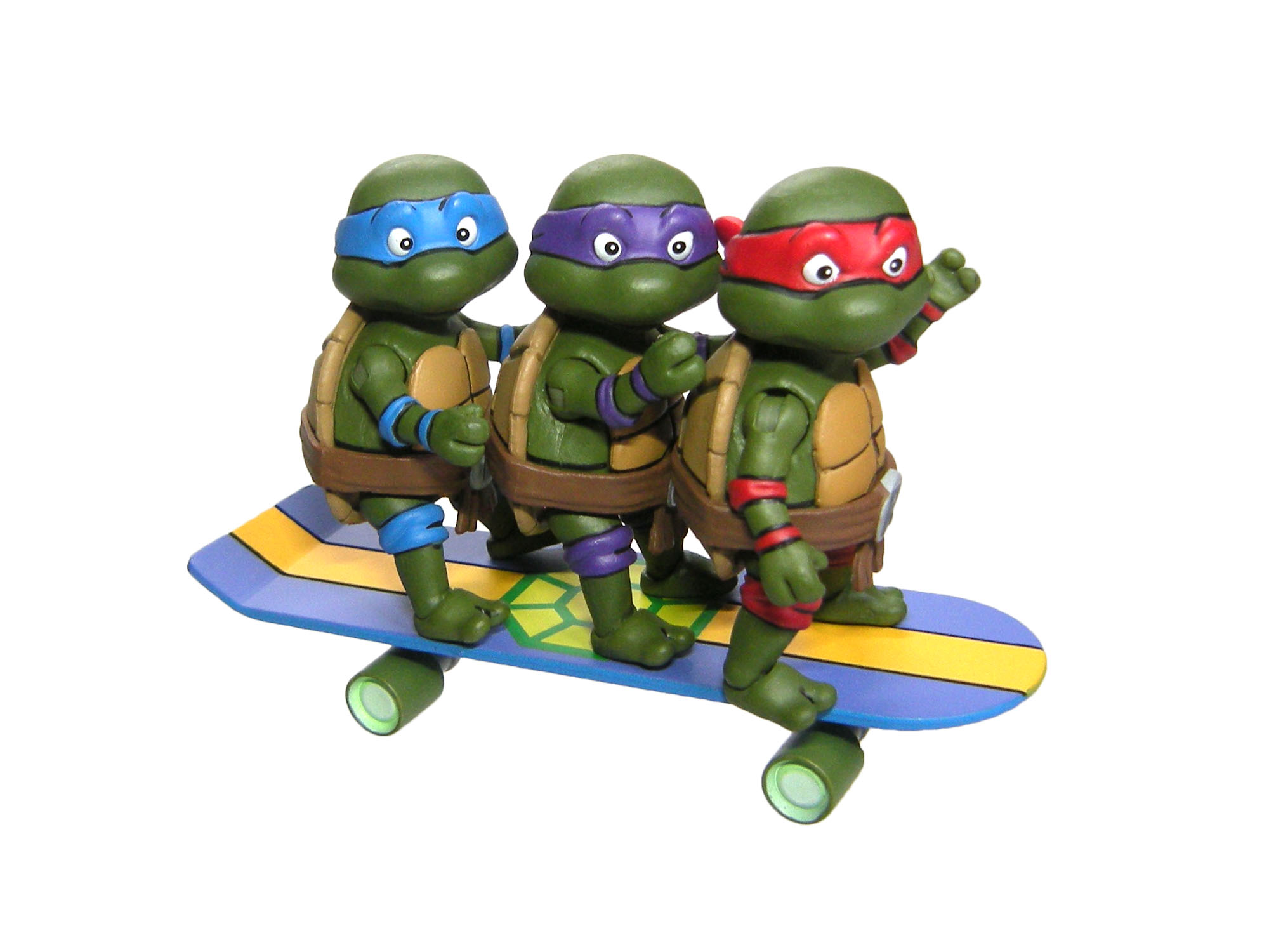 Les quatre tortues ont été sculptées informatiquement, à l’aide du logiciel Zbrush, par l’artiste Brodie Perkins. Il a partagé quelques visuels de son travail sur les réseaux sociaux. Les petites tortues ont été présentées par NECA lors de la Comic Con de San Diego, en février 2022. Le fabricant n’avait pas pour autant précisé ses plans pour la sortie de ces figurines à travers le pack d’accessoires.