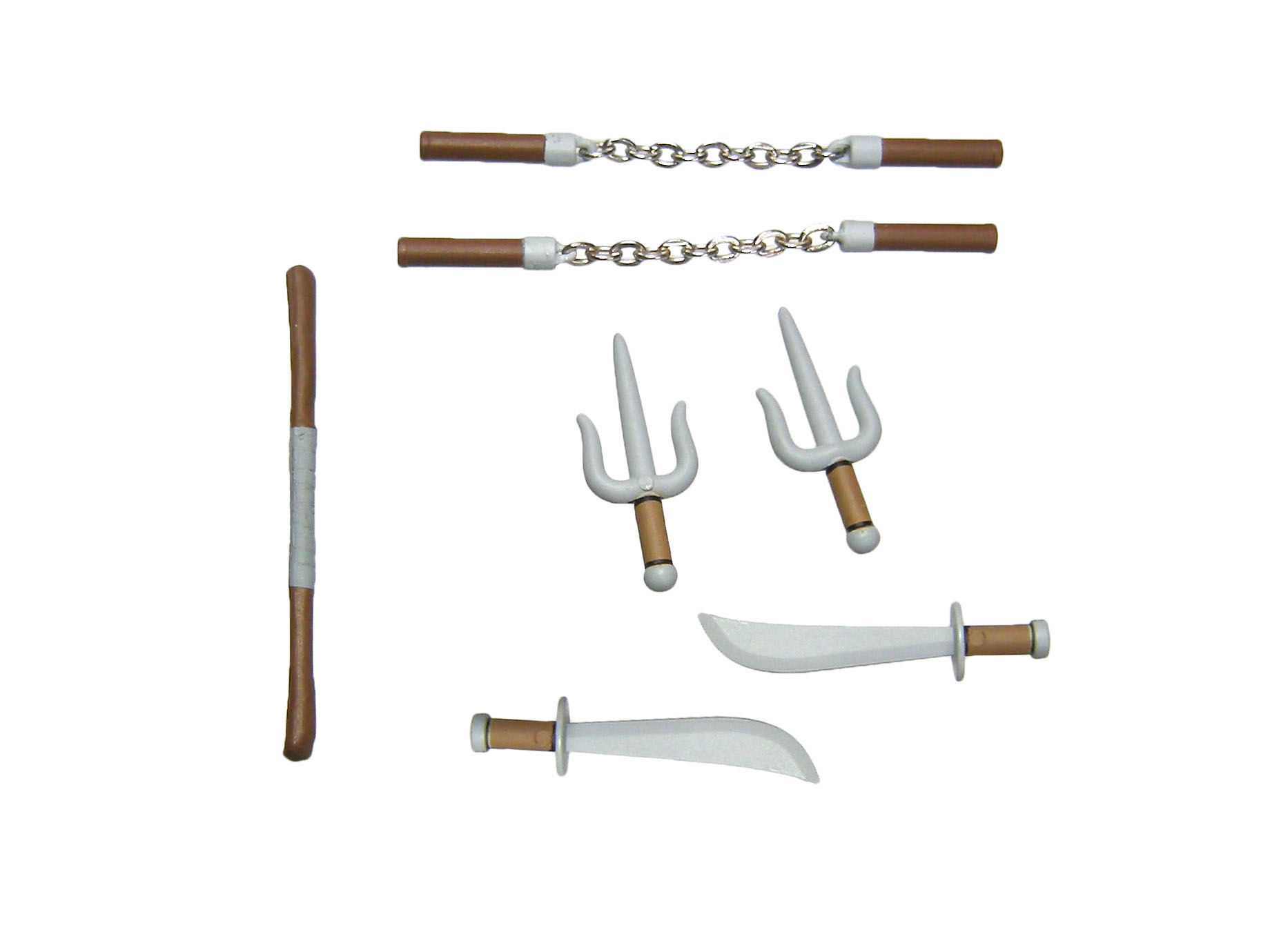 Les petites tortues sont toutes accompagnées de leurs armes respectives, en plus petit. Ce n’est pas sans rappeler les armes des Mini univers de Playmates Toys, sortis à partir de 1994. Les armes sont très bien sculptées. Les manches en revanche sont légèrement plus épais que l’écart des doigts des tortues. Il faudra donc un petit peu forcer pour les placer entre leurs petites mains.
