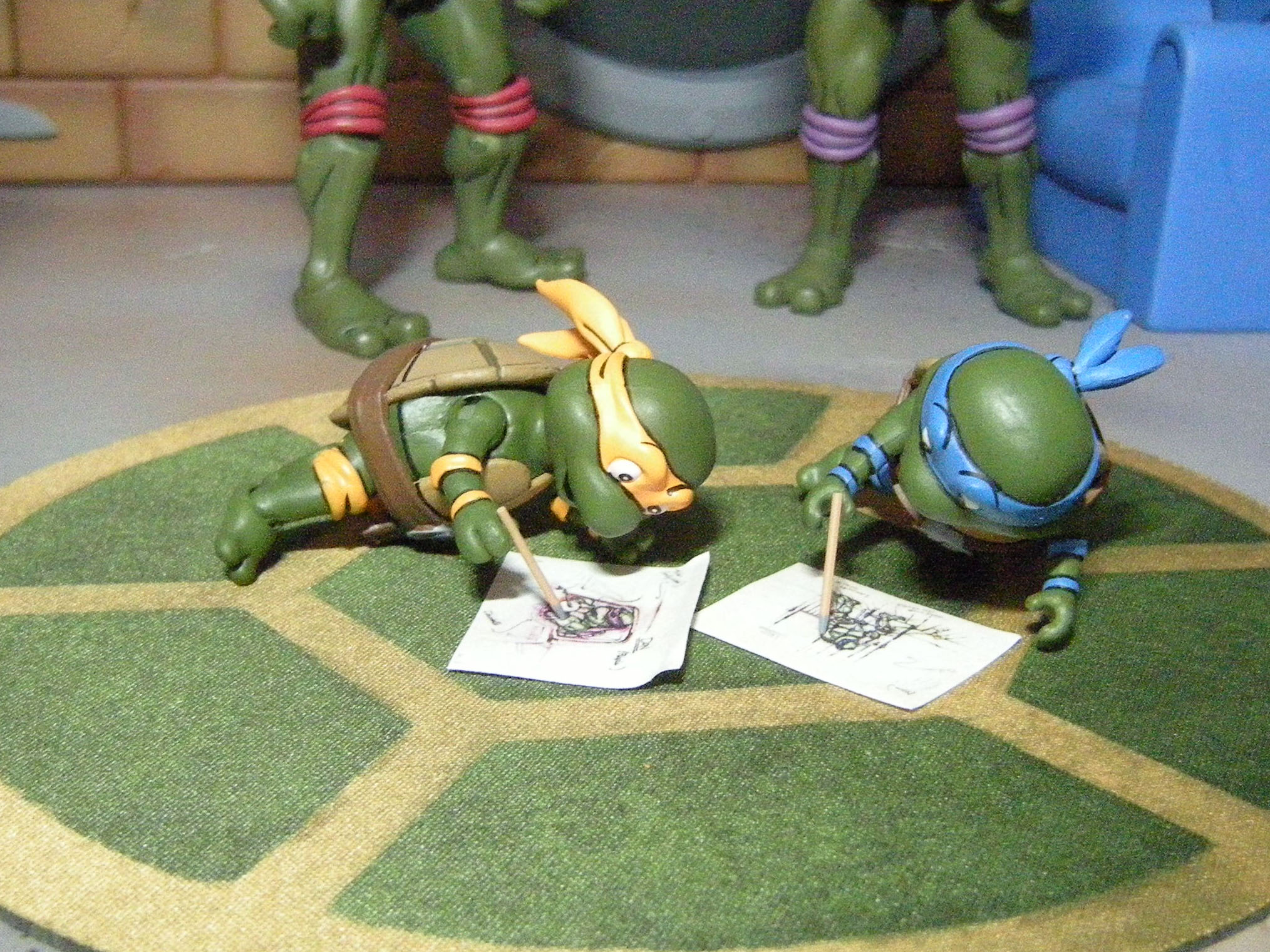 Hélas, aucun autre accessoire n’accompagne ce pack. C’est assez dommage, il y avait du potentiel pour proposer plus. Je pense notamment à la scène où Leonardo et Michaelangelo dessinent dans le repaire sous les yeux de leurs frères (image de présentation ci-dessus). Ajouter un crayon et du papier ou un carnet aurait été une bonne idée. Ici, j’ai repris les crayons de la figurine April farm house du film de 1990. Hélas, les crayons sont très étroits et tiennent mal entre les mains des petits mutants.