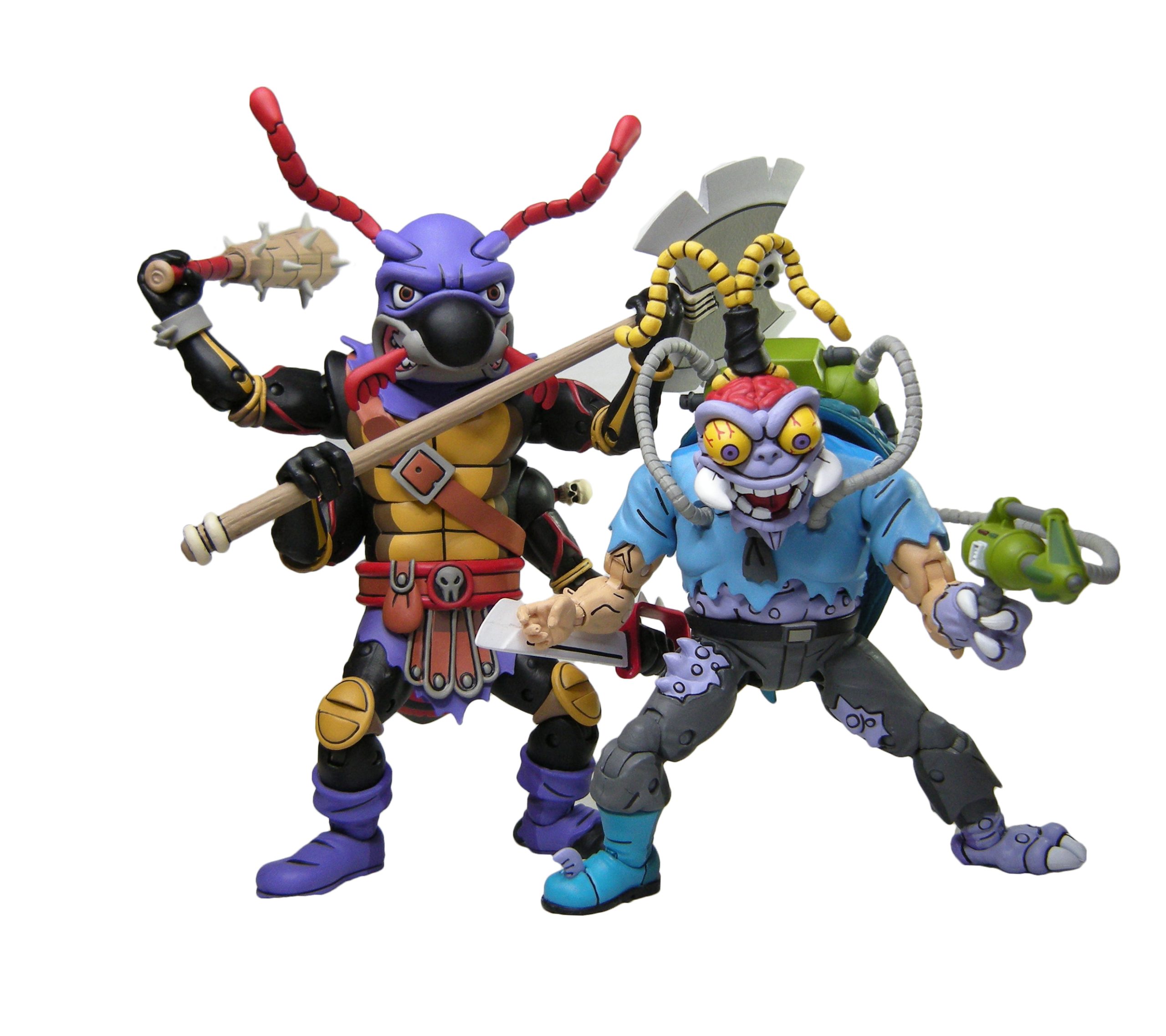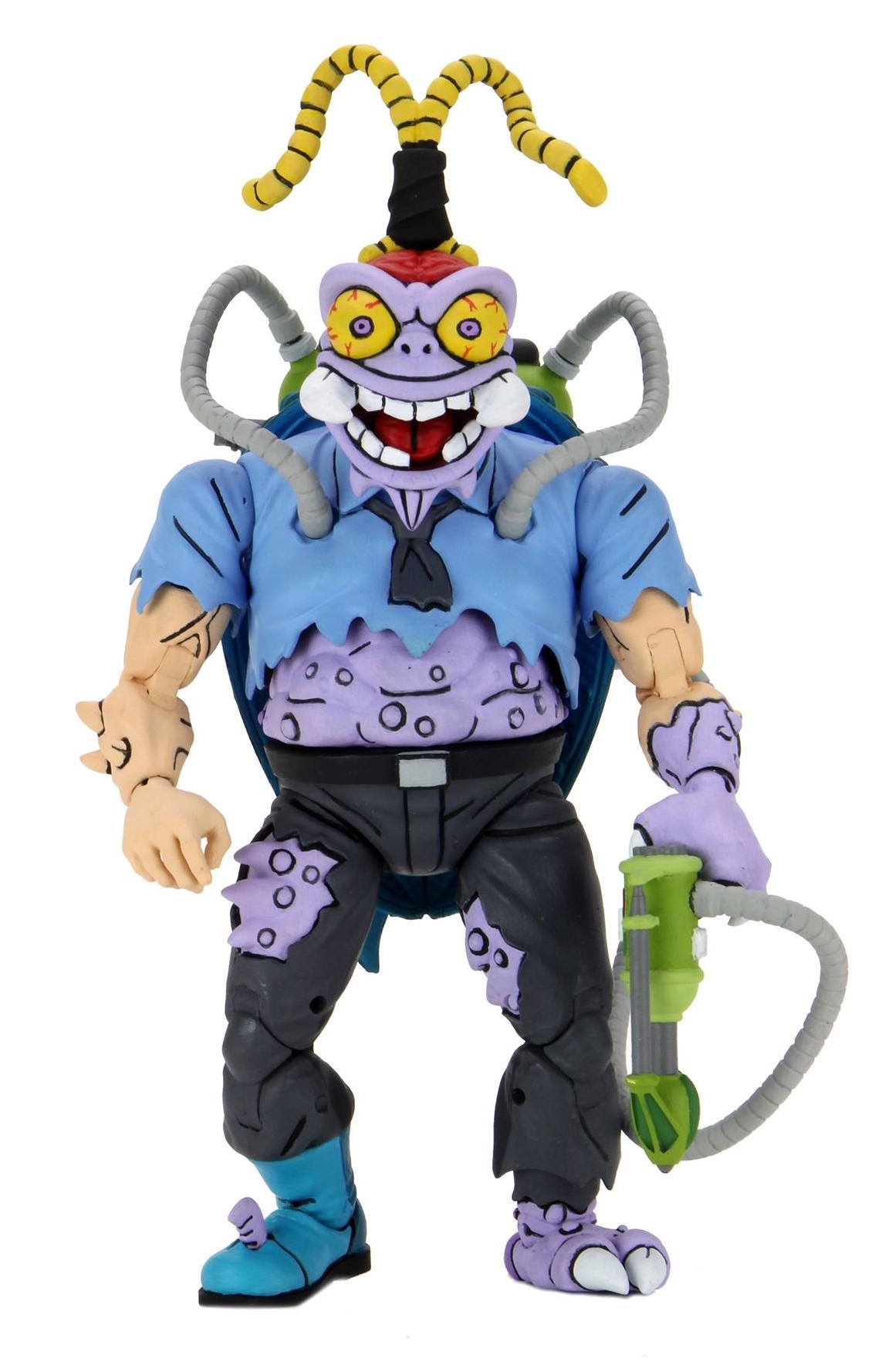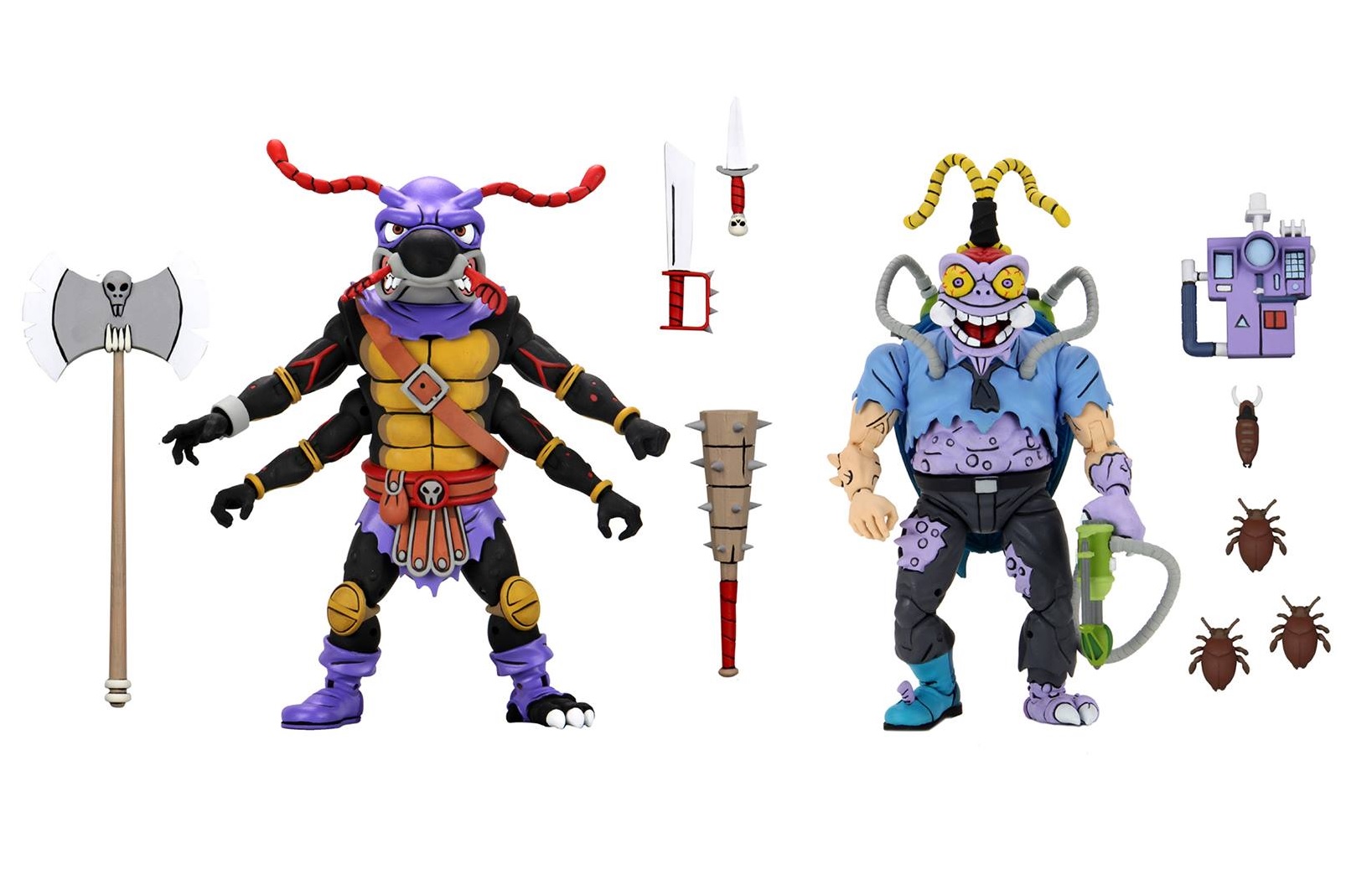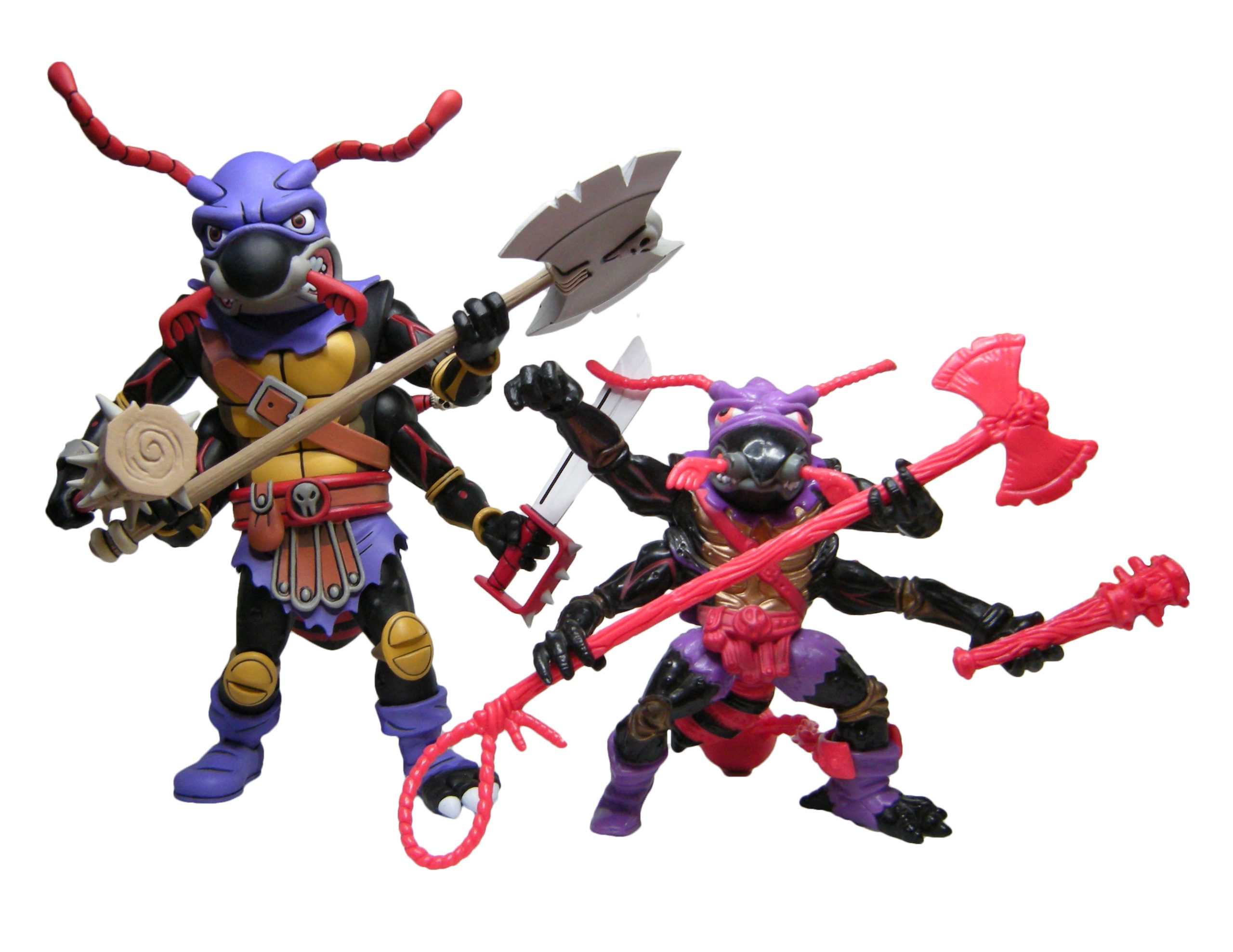 This creepy, crawly twosome are loyal servants of Krang and Shredder. They would delight in dicing up the Turtles for their masters… and if they happen to destroy any purveyors of pest control in the process, so much the better! Antrax comes with extra hands and battle axe, knife, club, and sword accessories. Scumbug comes with gas gun, net launcher, bugs, fission detector, extra hands.