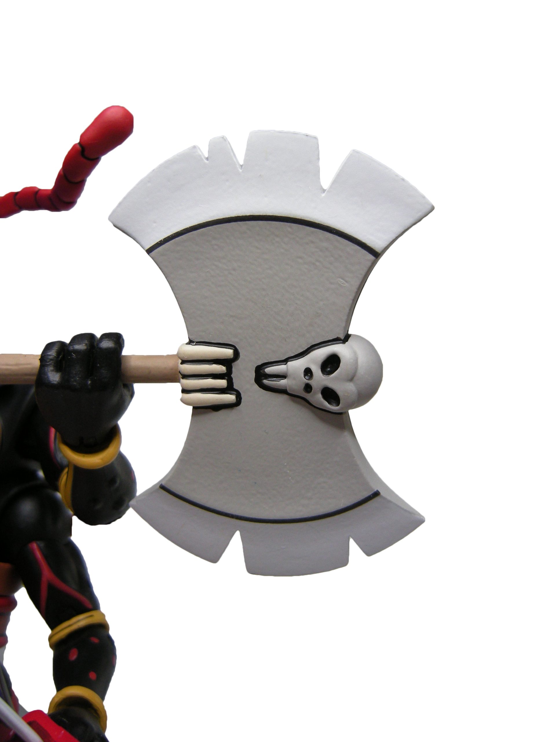 Enfin la hache est assez impressionnante. Mais bien trop épaisse, disproportionnée à l’image du reste de la figurine. Les finitions sont très sympas, comme avec cette tête de mort ou encore les dents qui lient le manche à la lame.