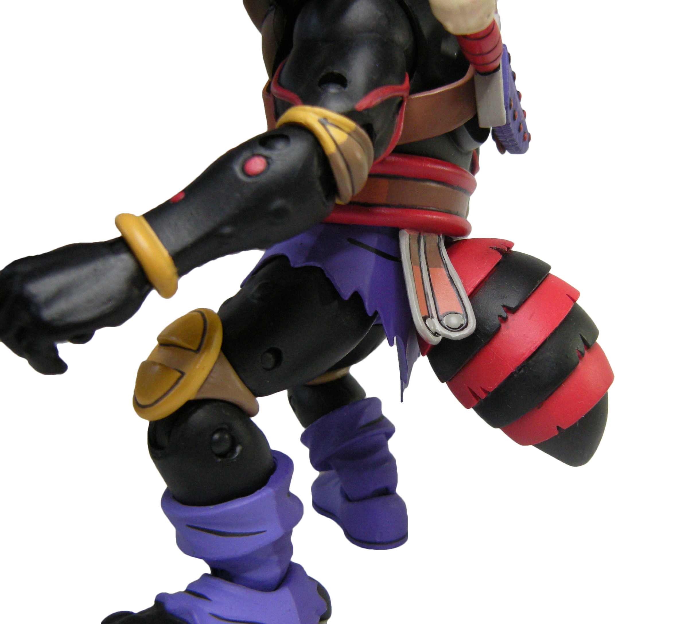Le reste du corps est très intéressant. Tous les détails sont présents, comme les nombreux reliefs du buste de la fourmi, la cagoule se terminant avec de larges crans, les veines sur ses muscles. Nous retrouvons comme toujours l’utilisation de deux plastiques différents, un rigide pour son corps, et un plus souple pour certaines parties des vêtements d’Antrax, comme le pagne et les ceintures. Le pagne violet est dissocié des lanières de cuir qui pendent. La ceinture transversale est quant à elle dissociée de la ceinture de la taille. Elle présente un fourreau pour ranger le couteau d’Antrax dans le dos.
