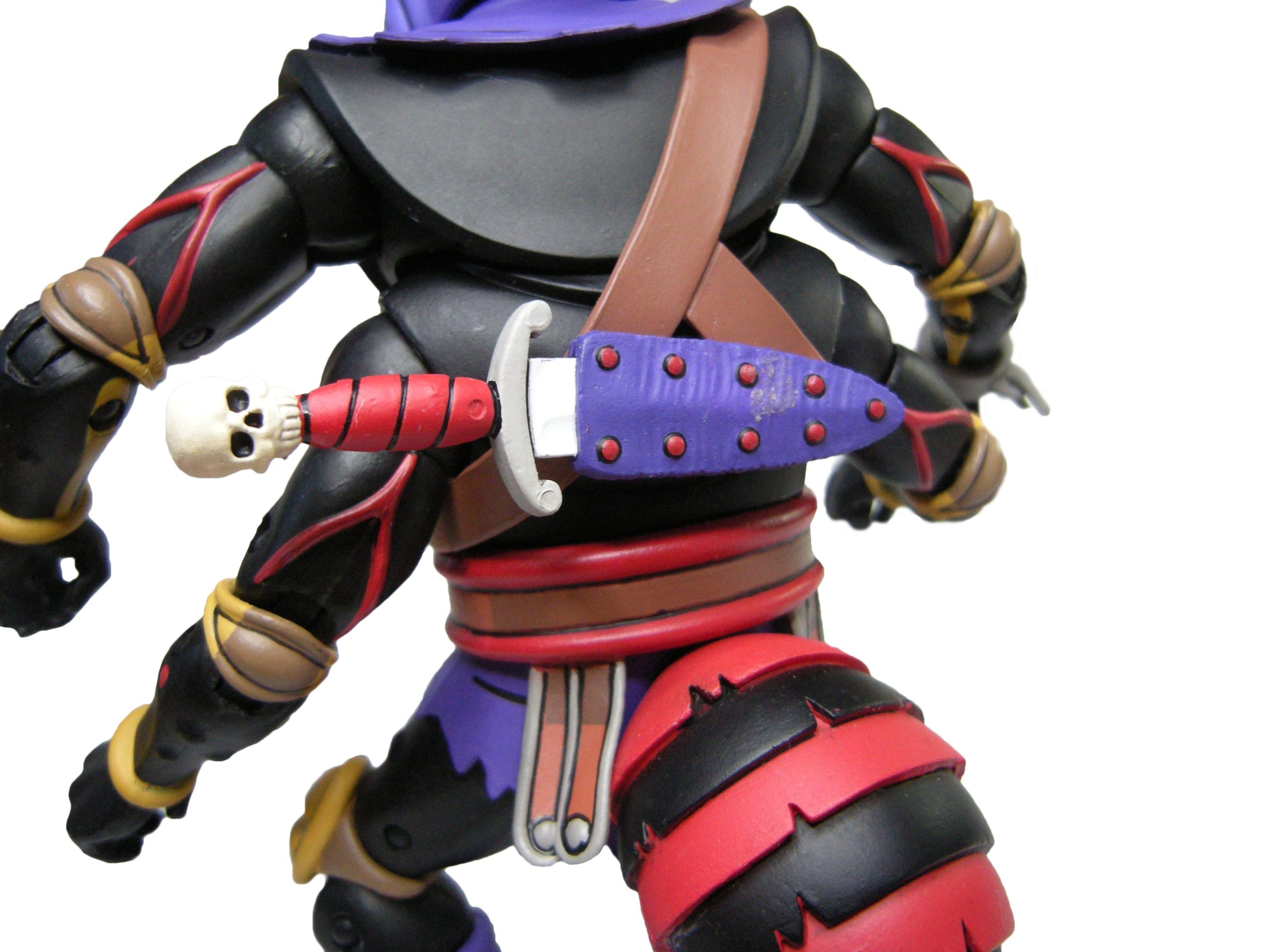 Nous retrouvons donc la hache, très grande et surmontée d’une tête de mort, mais aussi une massue avec pics et un couteau. Seul le boulet que l’on pouvait retrouver sur le jouet de Playmates Toys n’a pas été fait. À cela, le fabricant a ajouté une dague.