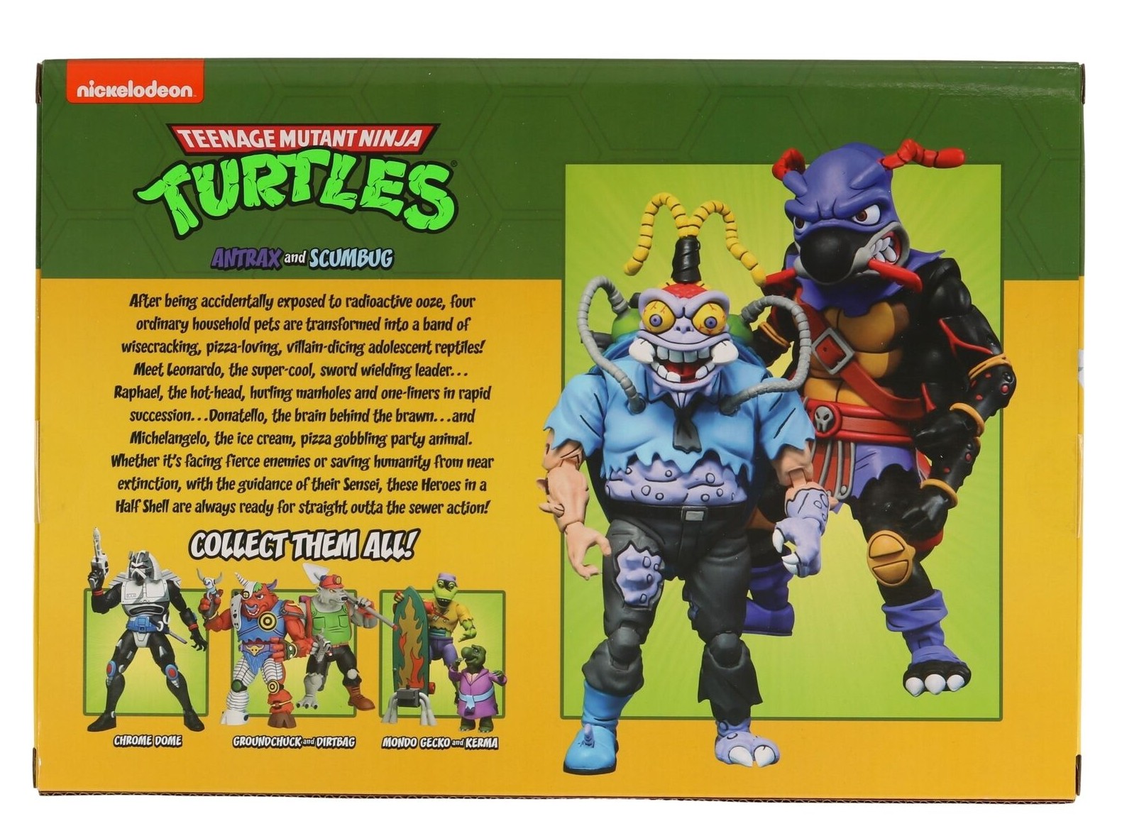 Les figurines sont visibles à l’avant grâce à une fenêtre en plastique. À l’arrière, NECA a détaillé les figurines de la septième wave ainsi que les suivantes, Wingnut et Screwloose ainsi que de Dirtbag et de Groundchuck, ironiquement sortie un mois plus tôt. Comme ils ne mentionnent pas à leur tour les packs d’Ace Duck / Mutagen Man et d’Antrax / Scumbug, c’est un indice de plus pour penser qu’ils ne font pas partie de la même wave.