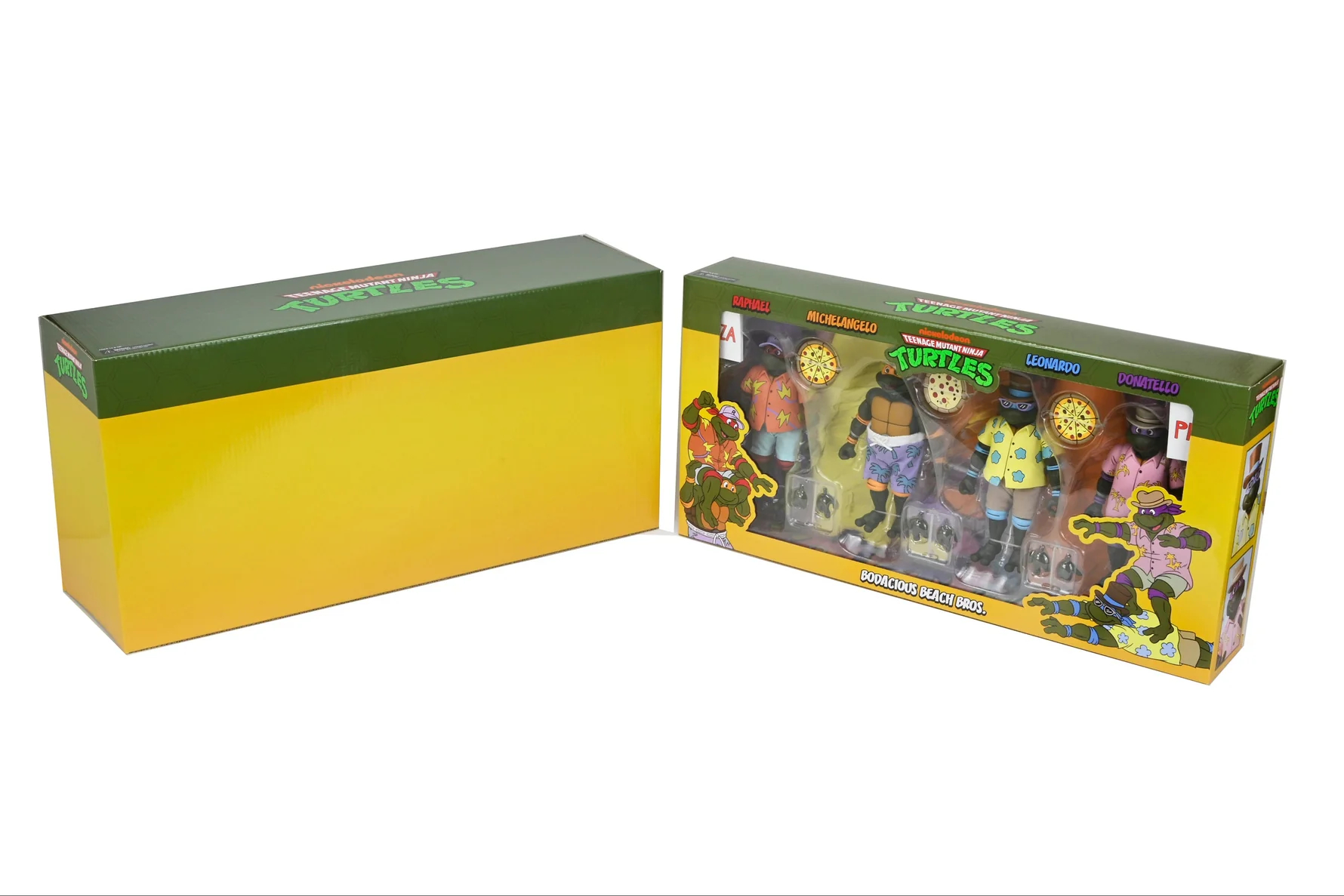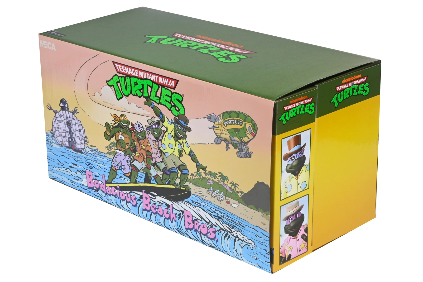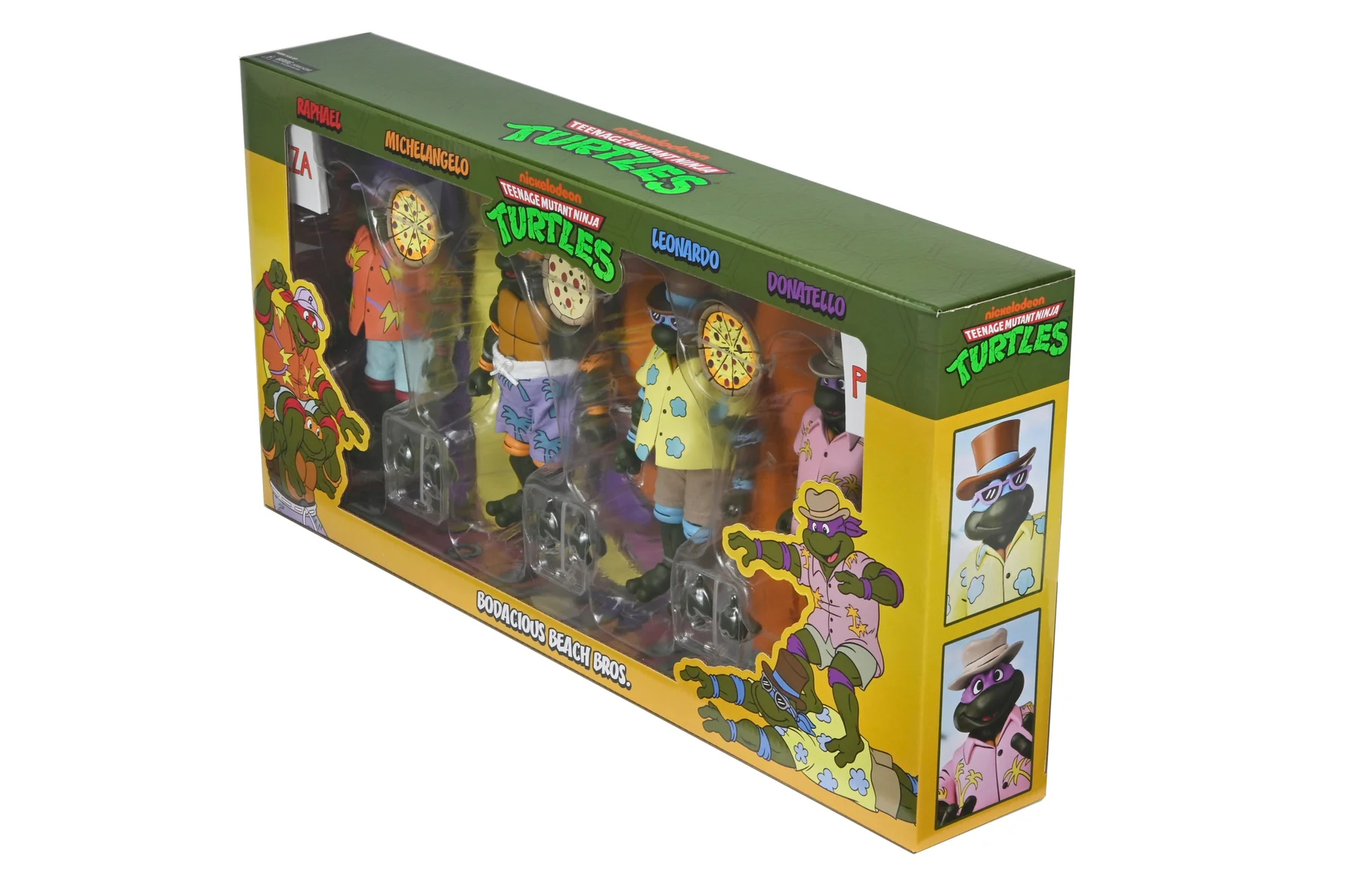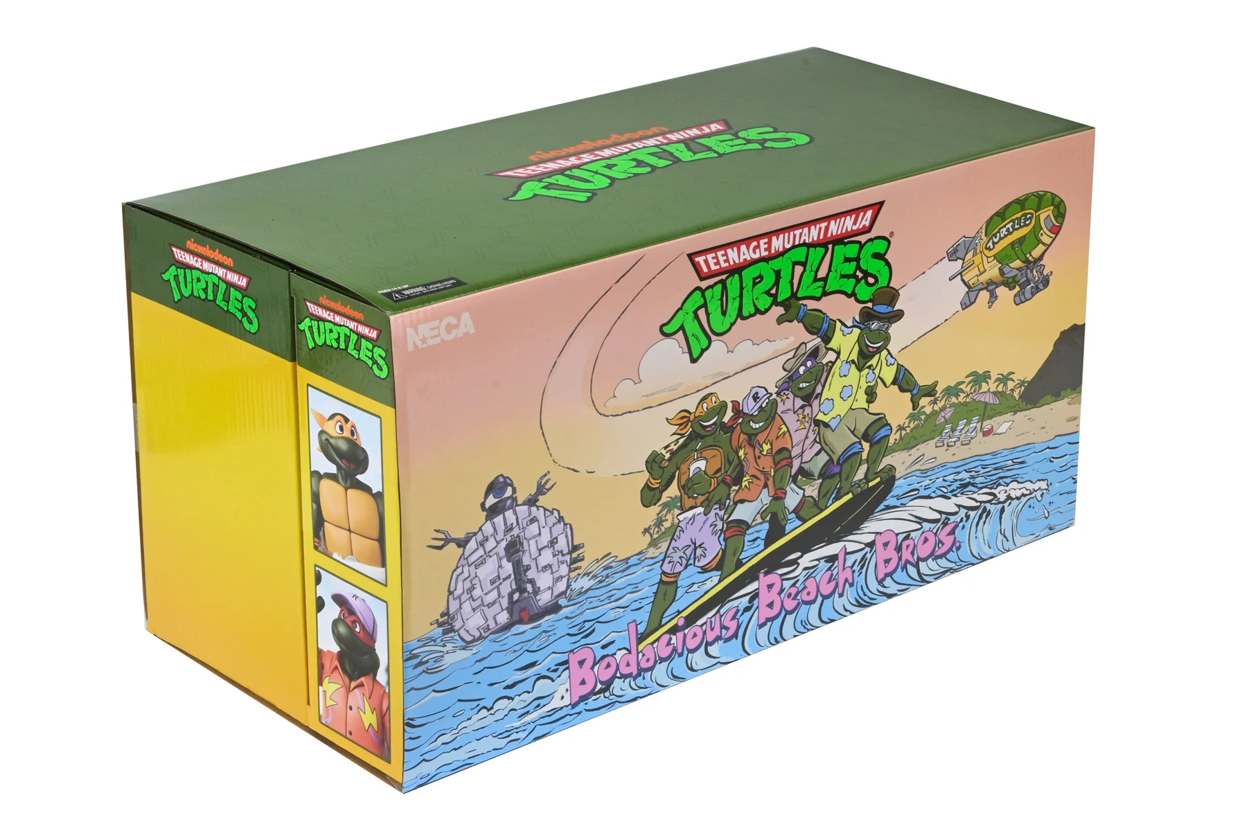Le 4-pack Bodacious beach bros. a été lancé comme exclusivité de la San Diego Comic Con 2025. NECA a annoncé ce pack le 3 juin pour une ouverture des précommandes entre les 18 et 20 juin 2025. Contrairement aux années précédentes, il n’y a pas eu de sold out immédiat dès le lancement, témoignant peut-être d’un essoufflement de la gamme ou d’un ras-le-bol des fans quant à des variantes de peu d’intérêt. Lors du salon, Trevor Zammit a rappelé dans la vidéo de Pixel Dan que ces tortues étaient bien issues d’épisodes variés du dessin animé. Enfin, le 27 juillet, NECA a relancé les ventes de certaines figurines pour l’évènement, dont ce pack, dont il restait encore des exemplaires invendus.