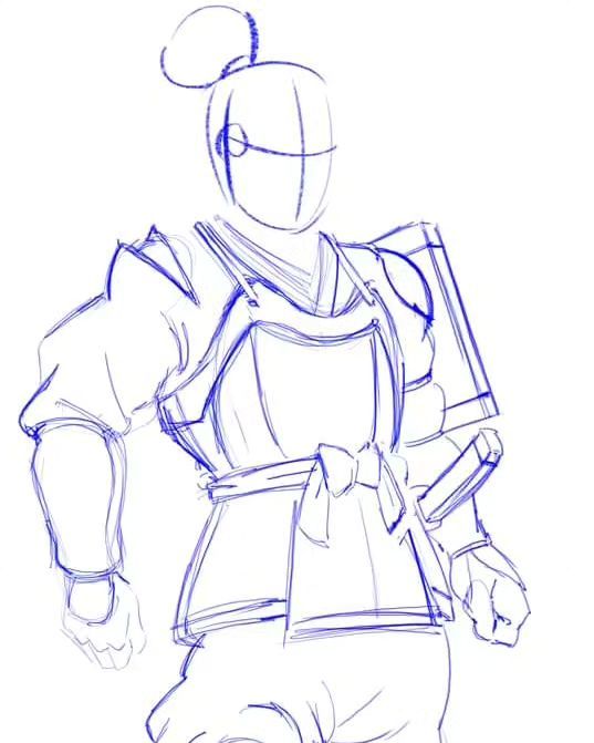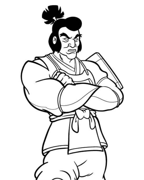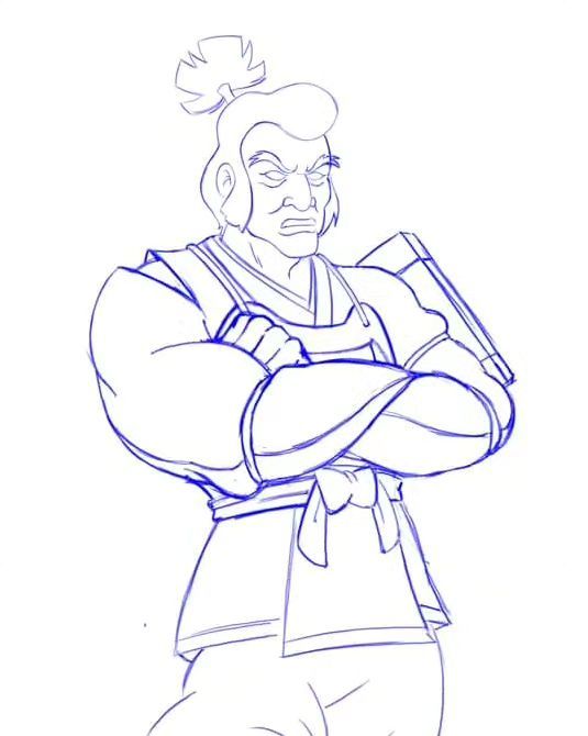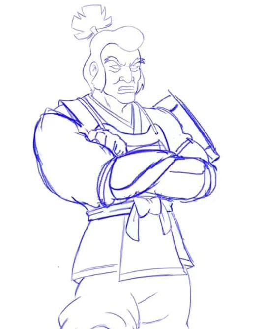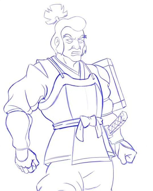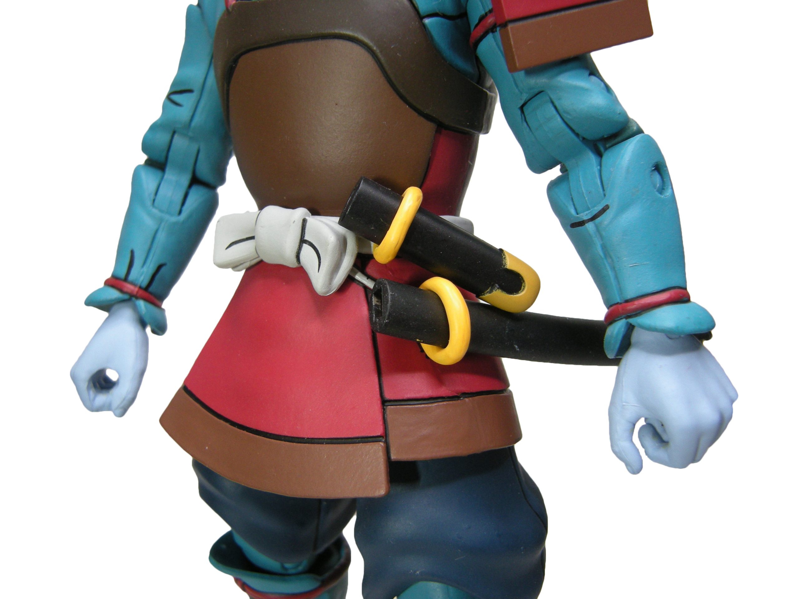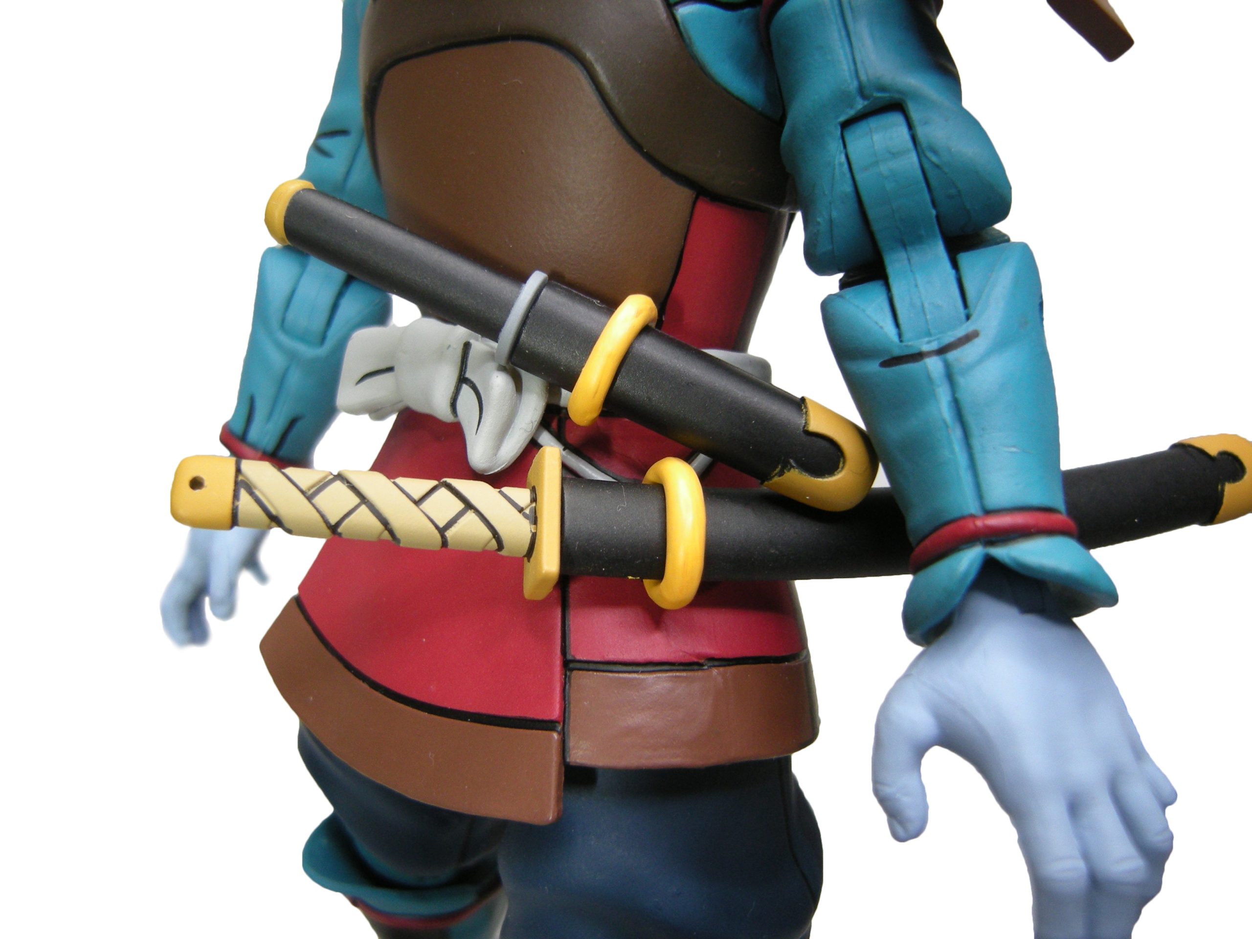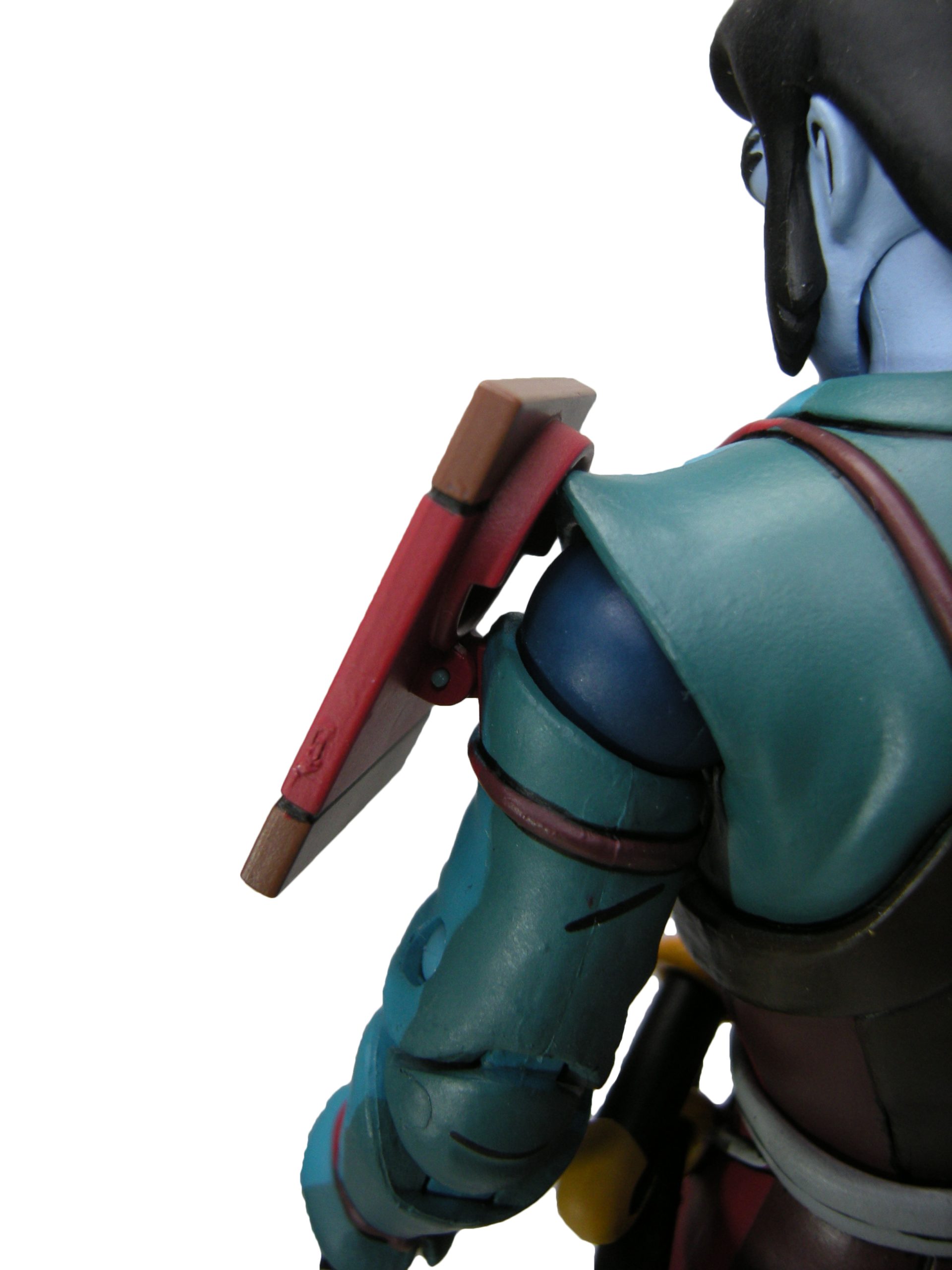 J’aime beaucoup le soin porté aux sangles retenant ses pièces d’armures. De même pour les plis du vêtement. En revanche, le sculpteur n’a pas pris en compte le détail du maintien des fourreaux. Sur les concepts arts du personnage et dans l’épisode, le fourreau du sabre est maintenu par un anneau doré à la ceinture. Le fourreau du petit couteau est également différent. Maintenu lui aussi par un anneau doré sur la figurine, il aurait dû passer sous la ceinture du samurai.