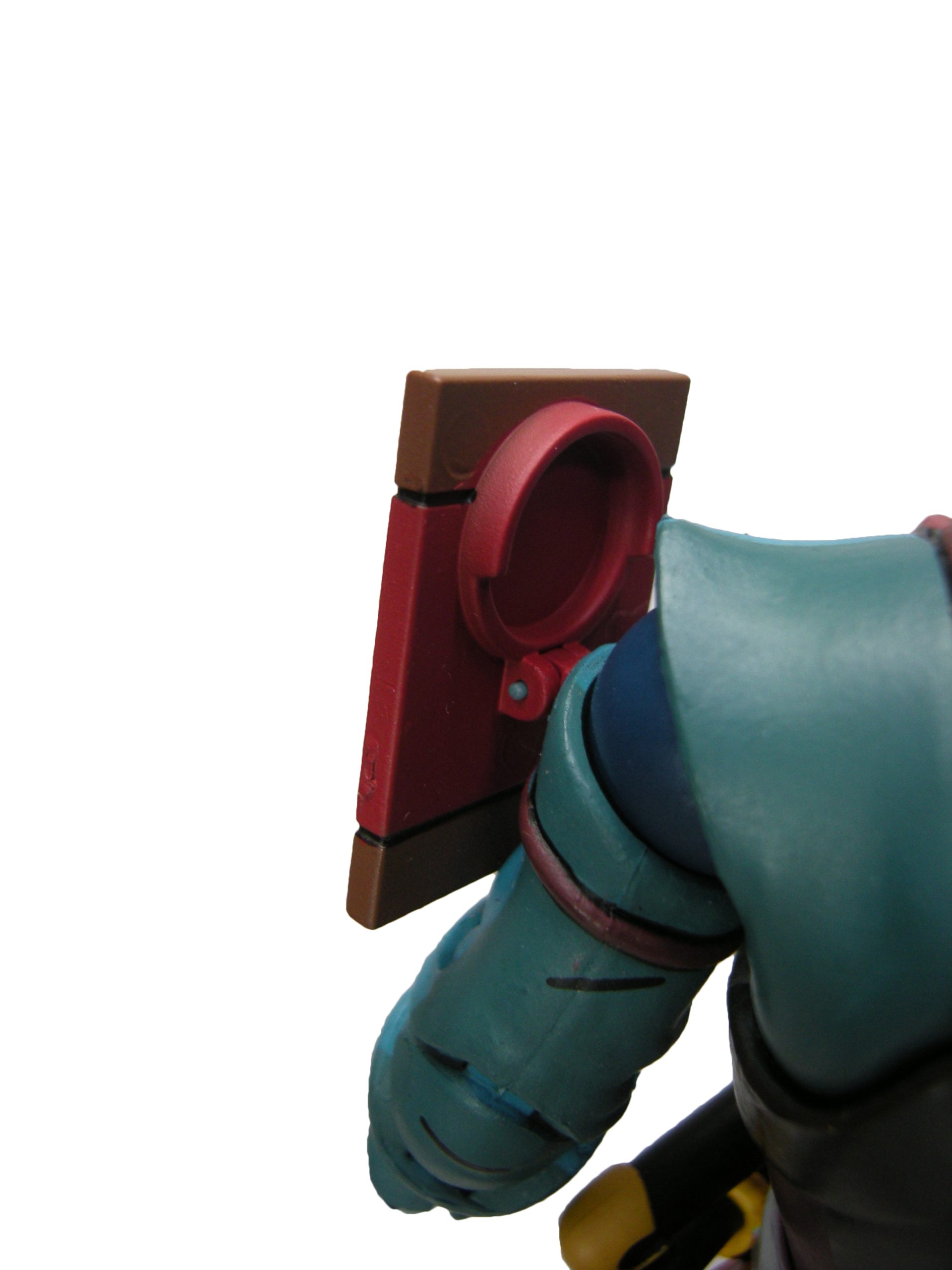 Une articulation plutôt inattendue se trouve au niveau de l’épaulière (sode) du bras gauche de Chakahachi. En y réfléchissant bien, cette articulation en cheville était indispensable pour articuler correctement le bras du seigneur sans entrave. En revanche, celle-ci est assez lâche, retombant très souvent à la verticale. Un disque a été placé pour la retenir contre le haut de la tunique.