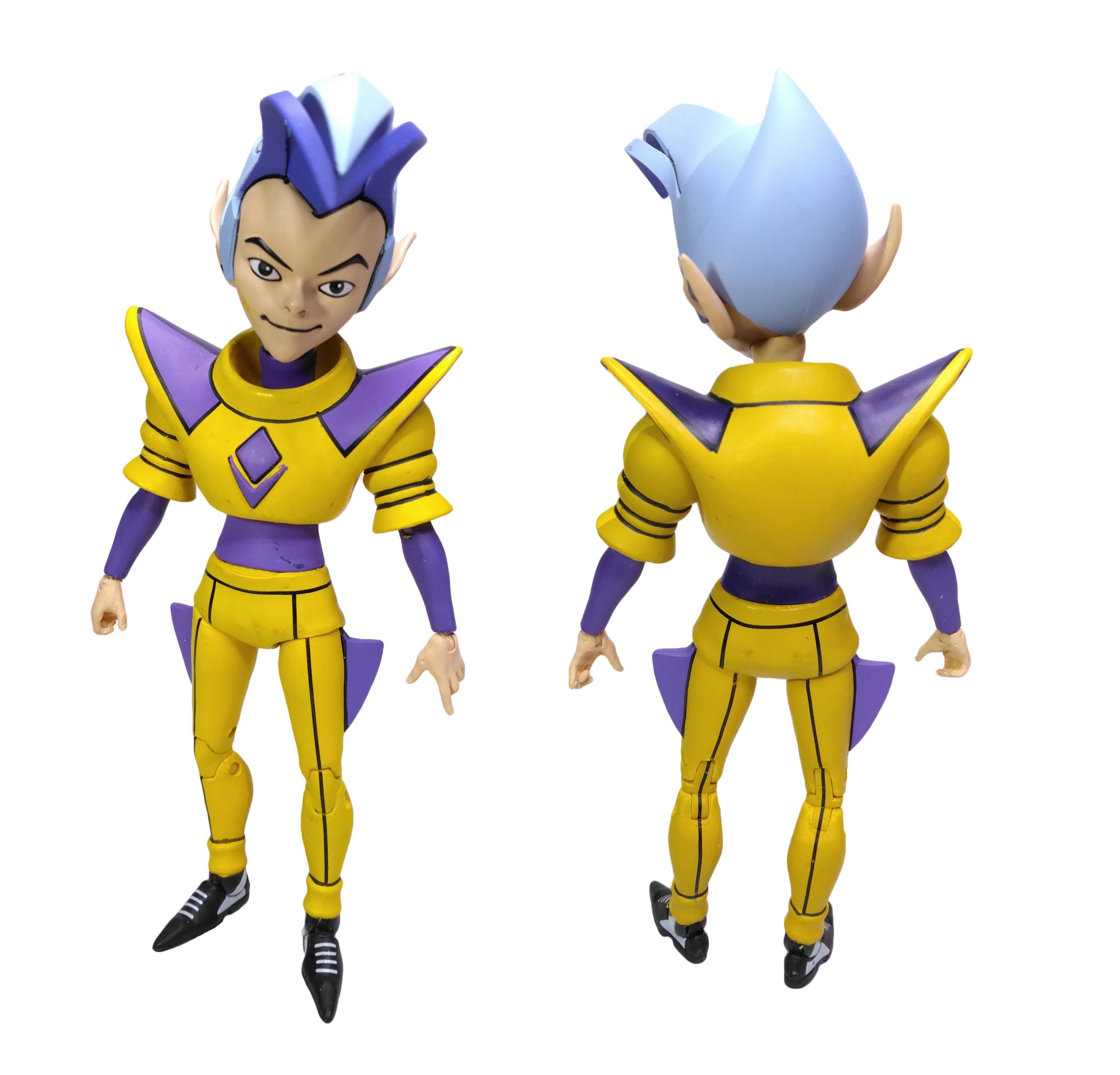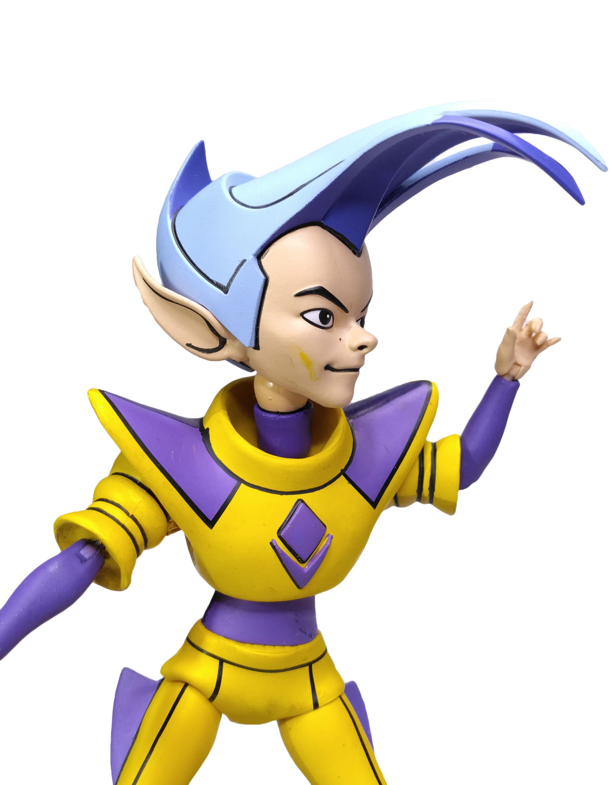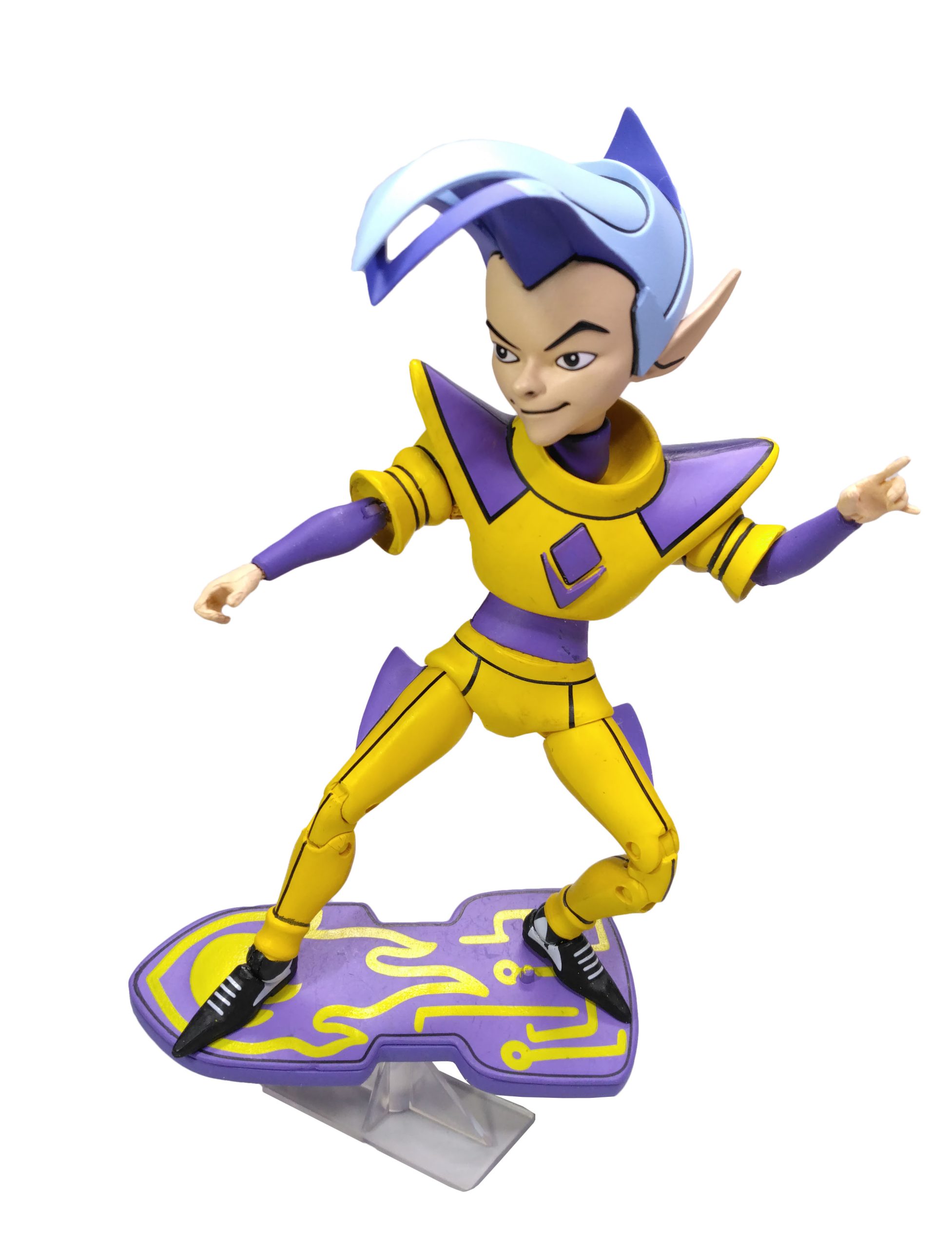 La planche de Dask est assortie à sa combinaison, à savoir le violet avec des touches de jaune. Je ne me souviens pas de l’avoir vu dans la série. Les neutrinos étaient toujours accompagnés de leurs voitures volantes. NECA a peut-être trouvé cette solution moins onéreuse, d’autant plus que Playmates Toys avait déjà assorti ses quatre neutrinos de planches volantes.