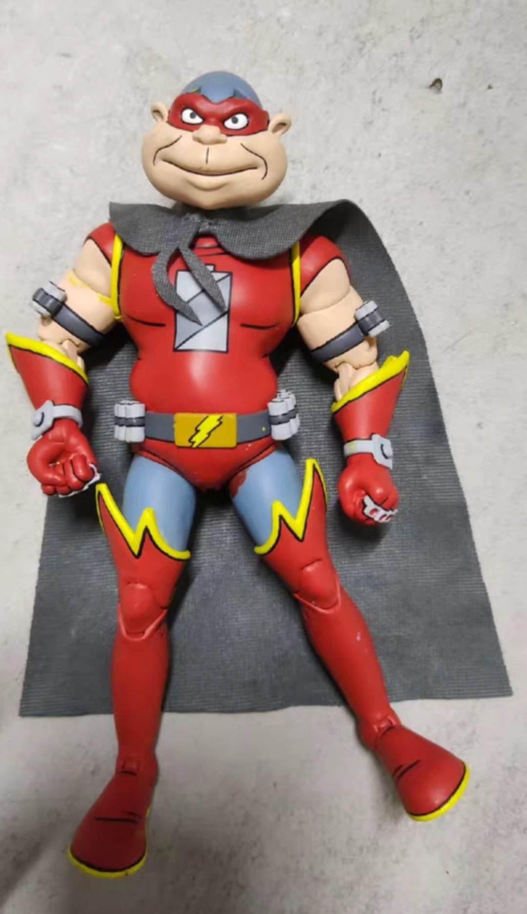 Le visage de notre vilain est très arrondi. Mais les traits d’expression, s’ils sont assez simples, restent très efficaces. Nous retrouvons des piles accrochées à sa ceinture et sur ses bras. Comme la plupart des personnages proposés par NECA, notre figurine dispose de plastiques souples pour certaines parties de son corps. C’est le cas ici pour son tronc, permettant de donner du relief à son petit bidon, ainsi qu’à son bassin et à la ceinture faisant la jonction entre les deux parties.