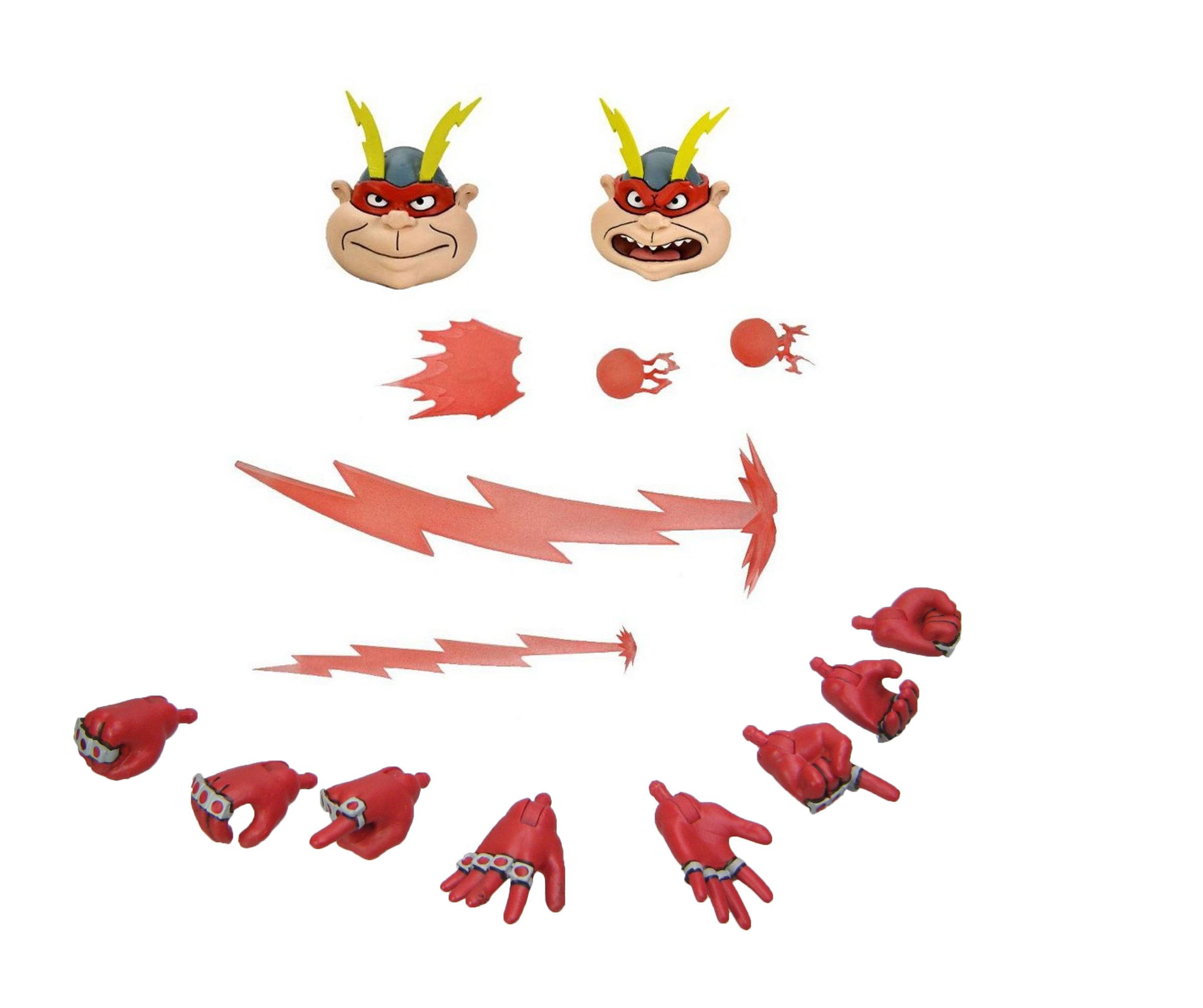 Notre grand méchant propose deux expressions de visage. Une déterminée, à la bouche fermée. Mais aussi une grimaçante, à la bouche ouverte. Côté mains interchangeables, elles sont toutes les quatre symétriquement identiques. Nous retrouvons une paire aux poings fermés, une paire avec l’index tendu. Une paire aux doigts ouverts pour tenir un accessoire. Et enfin une paire aux doigts détendus. Les mains sont toutes sculptées avec des « bagues » permettant à Electrozapper de générer ses rayons électriques pour frapper ses ennemis.