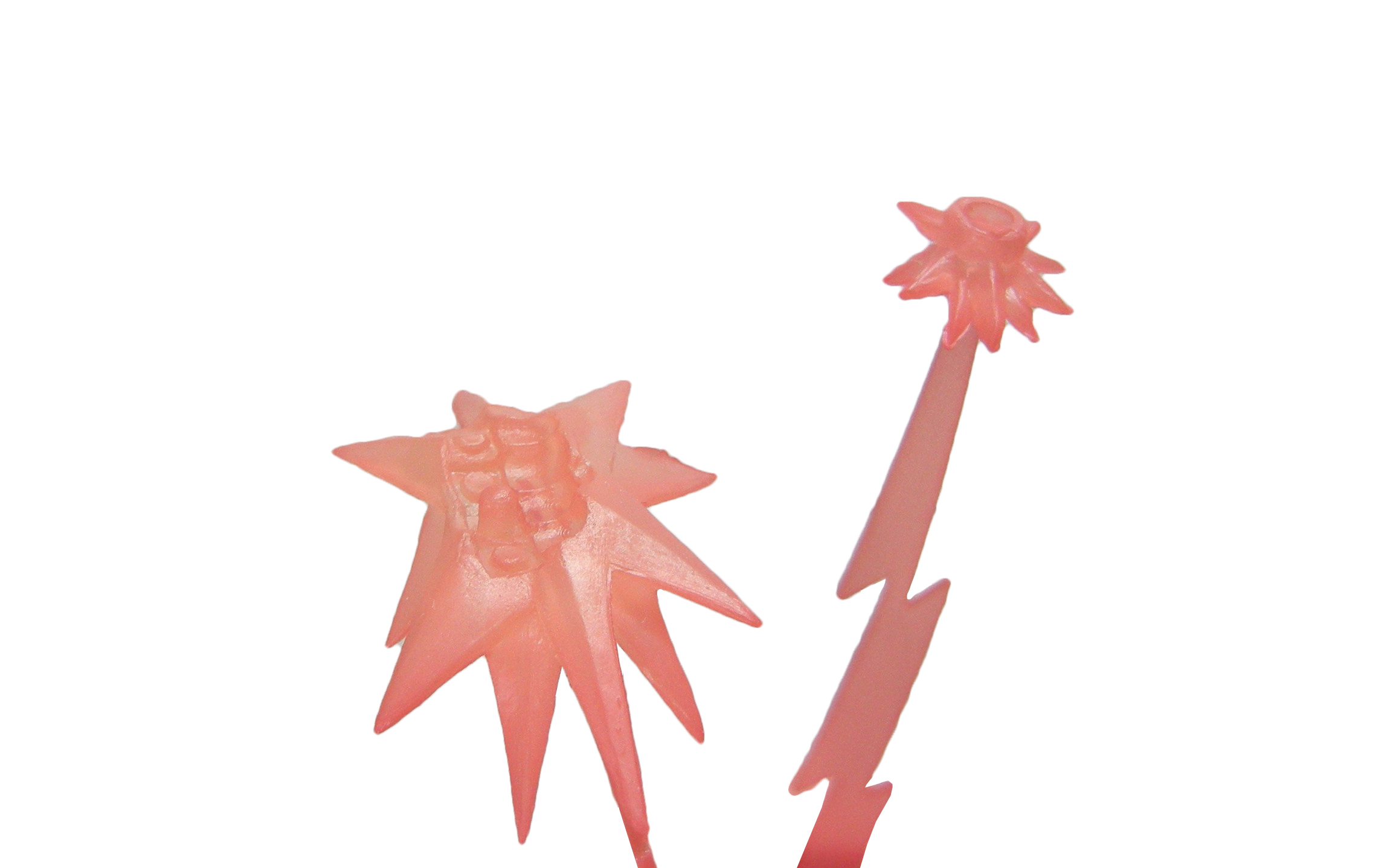L’autre rayon est à fixer à l’un des index du méchant. Sa structure est très similaire à celui décrit précédemment. Un troisième peut se fixer sur la main gauche aux doigts détendus, simulant une salve d’éclairs fraîchement générés. Enfin, les deux petites sphères sont munies d’un trou pour les fixer sur les index d’Electrozapper. Elles sont toutes les deux différentes, avec des petits éclairs à leur extrémité.