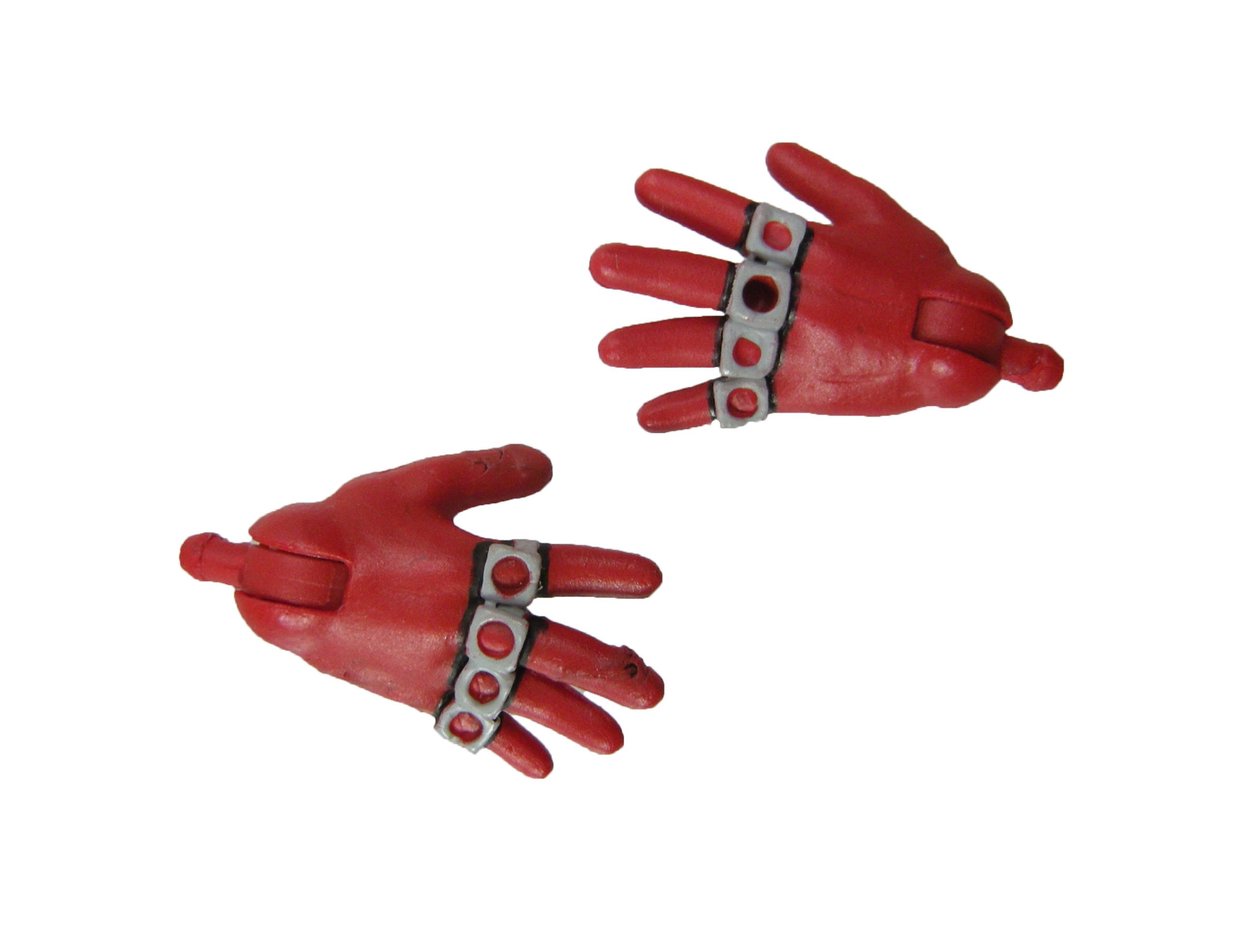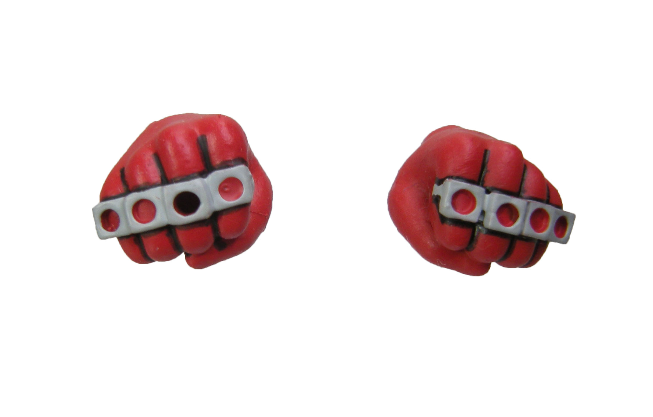 Certaines de ces mains cachent un atout intéressant et plutôt bien dissimulé. La main gauche aux doigts détendus et le poing droit disposent d’un trou au niveau de la « bague » du majeur. Cela permet d’y fixer les différents effets lumineux.