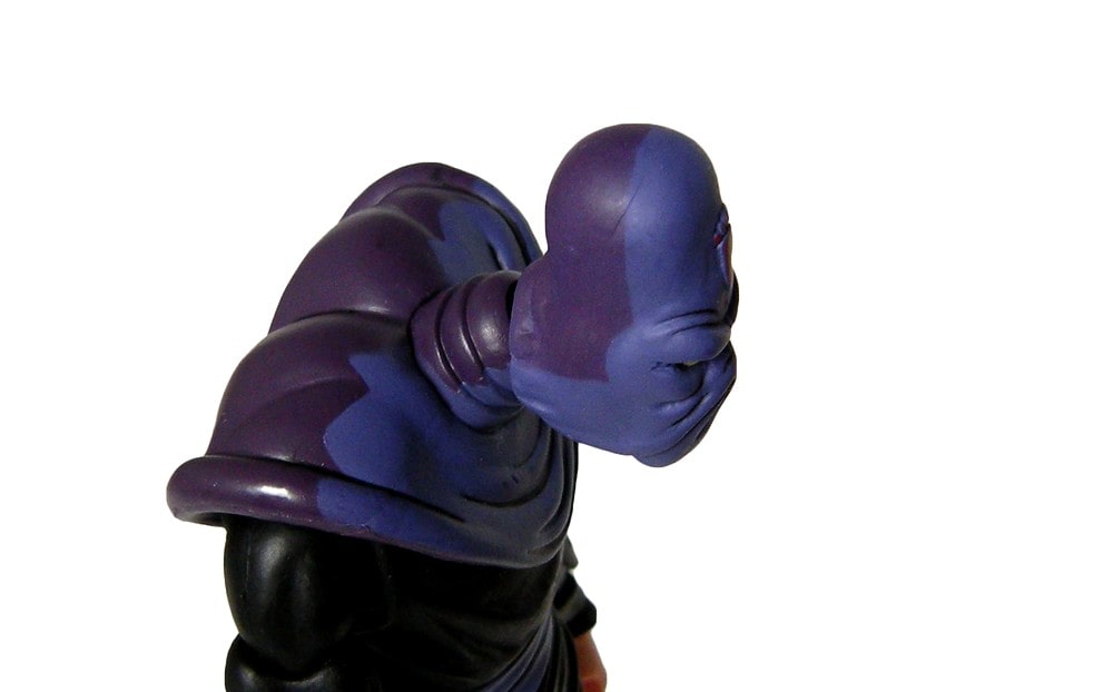 La peinture du Foot soldier est relativement simple. Ses vêtements sont faits de violet et de noir principalement. Les figurines issues du dessin animé de 1987 sont toutes avec des nuances d’ombrages, la partie arrière étant plus foncée. Seul le violet ici est obscurci sur l’ensemble de la figurine. Des rehauts de noir sont également appliqués dans certains plis de la cagoule, accentuant le réalisme du personnage.