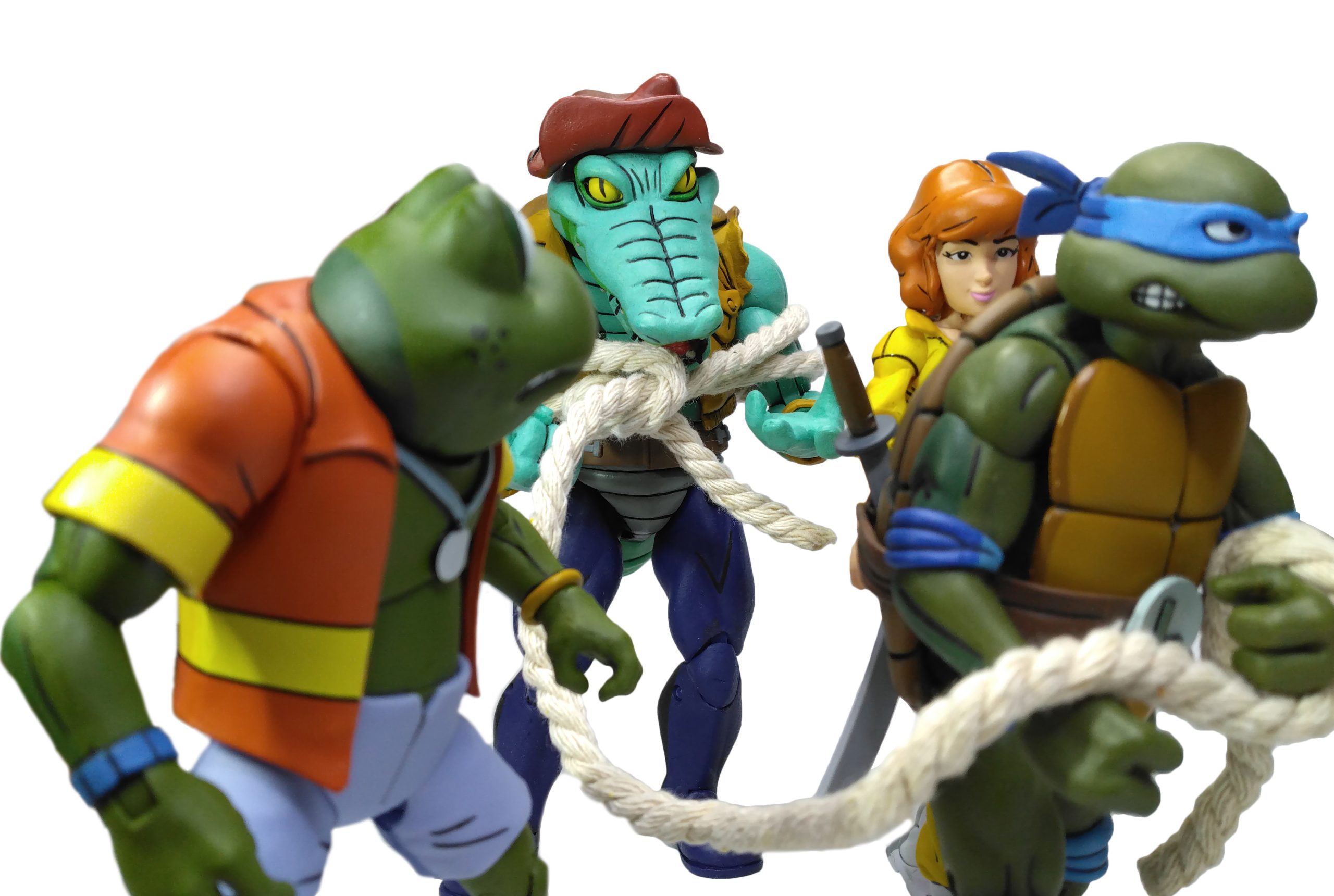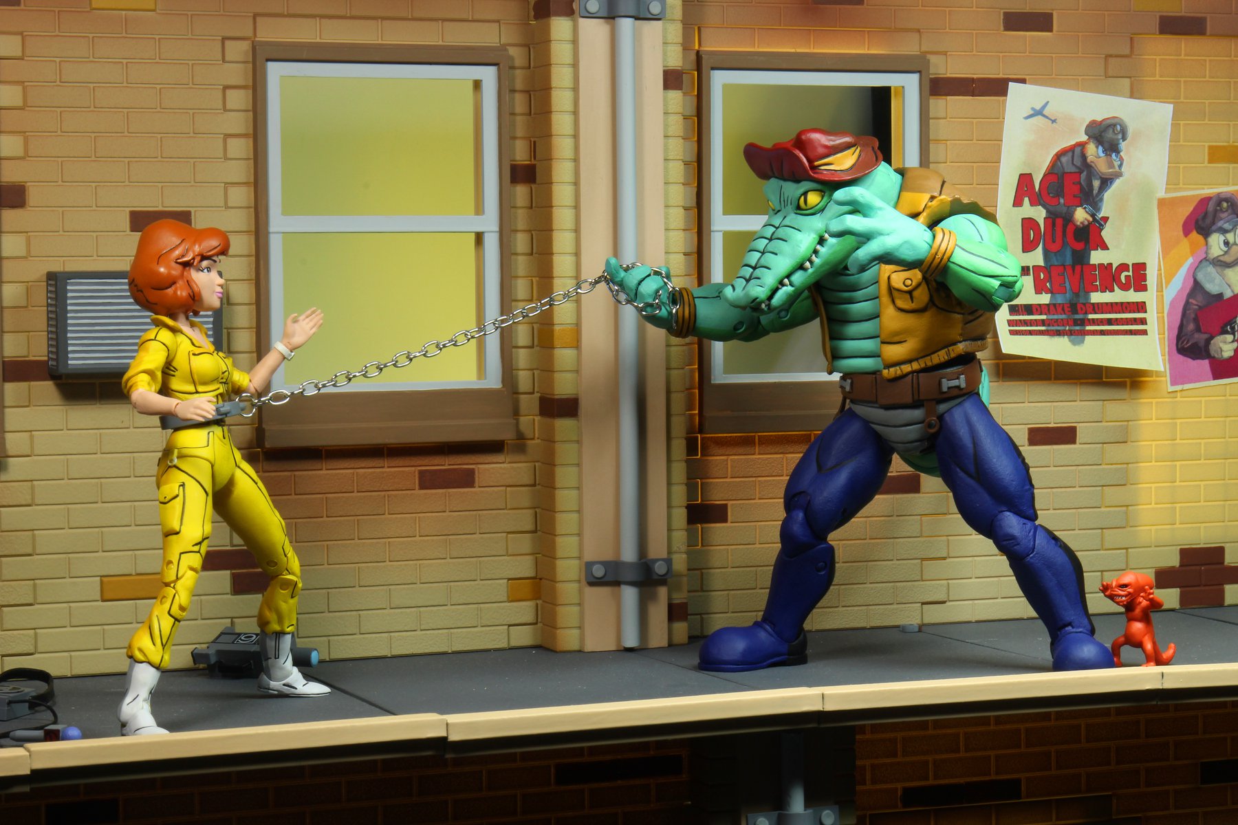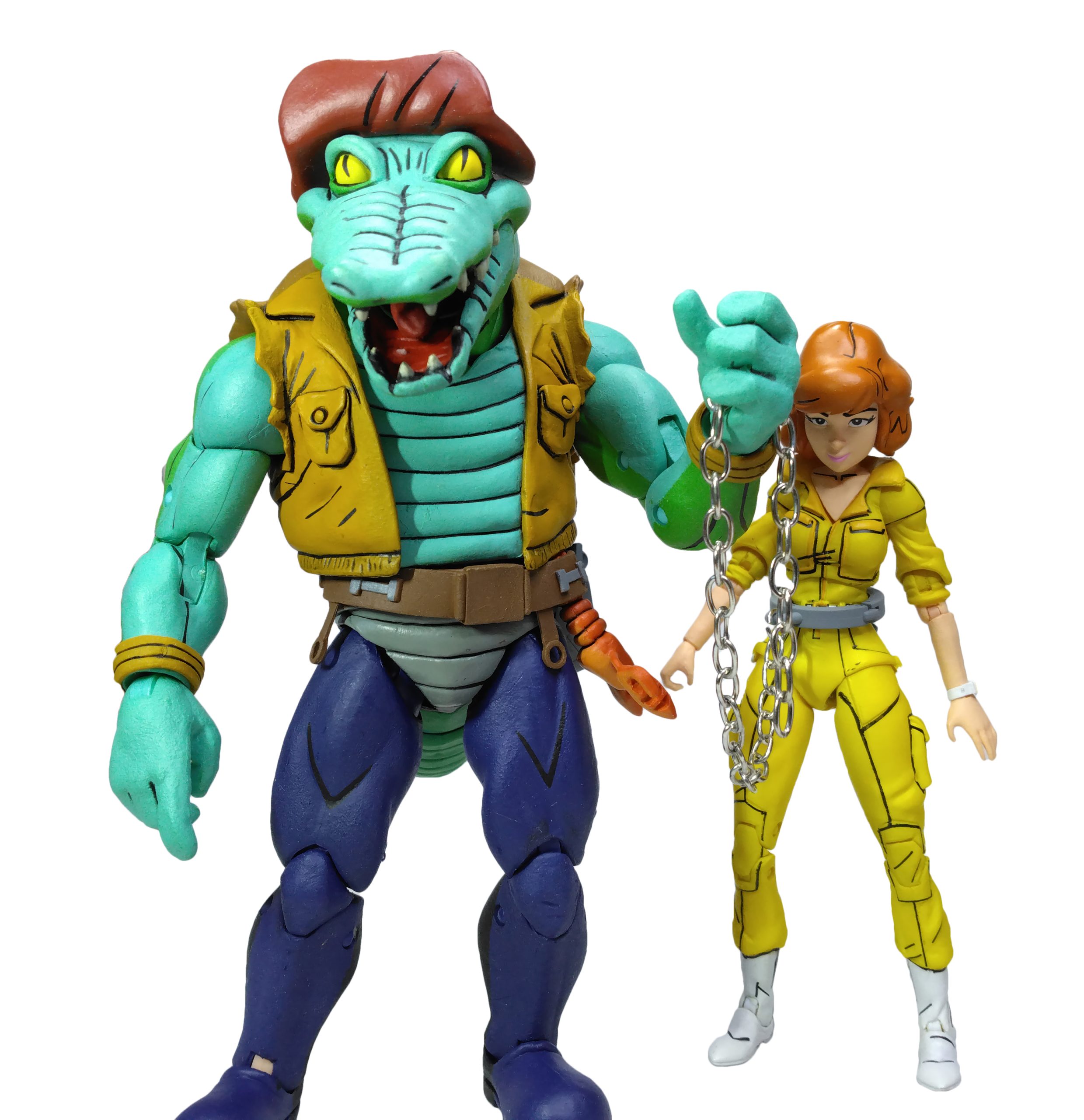 De cet épisode, nous retrouvons aussi une chaîne avec menotte géante au bout. C’était avec cela que le Rat King avait essayé d’emprisonner Leatherhead. En vain. L’alligator s’était échappé et l’avait utilisé sur April pour la trainer à travers les égouts. S’il est impossible de mettre l’anneau autour du cou du reptile, vous pouvez tout à fait le mettre sur un autre personnage, dont April ! La menotte s’ouvre et peut se refermer à l’aide d’un petit cran. En revanche, impossible de la mettre autour du cou de la journaliste comme dans l’épisode. Elle va plutôt sur sa taille de guêpe. C’est comme si l’anneau avait été conçu pour !