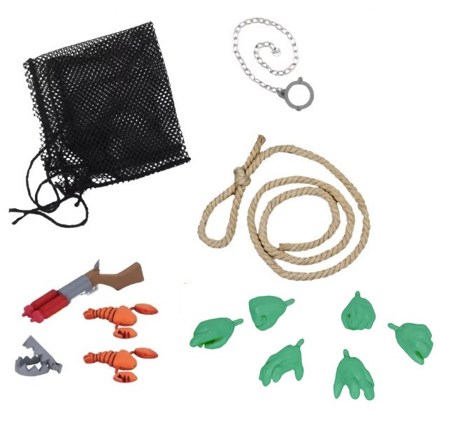Leatherhead dispose de très nombreux accessoires. Pour commencer, deux pièges en textile que NECA tenait à ajouter, jugeant que le lot de base était trop faible. L’alligator possède une corde relativement épaisse avec nœud coulissant. Idéale pour poser un pied dessus et se faire accrocher à un arbre, mais représente aussi la corde que les tortues utilisent pour capturer et traîner le reptile à travers les marais dans l’épisode La terreur du marais (S3 E30). Nous retrouvons aussi son filet, capable de prendre n’importe quelle figurine à l’intérieur ! Plutôt grand, vous pourrez même y mettre les quatre tortues et April ! Ses extrémités sont terminées par de la ficelle, permettant de l’accrocher sur un support.
