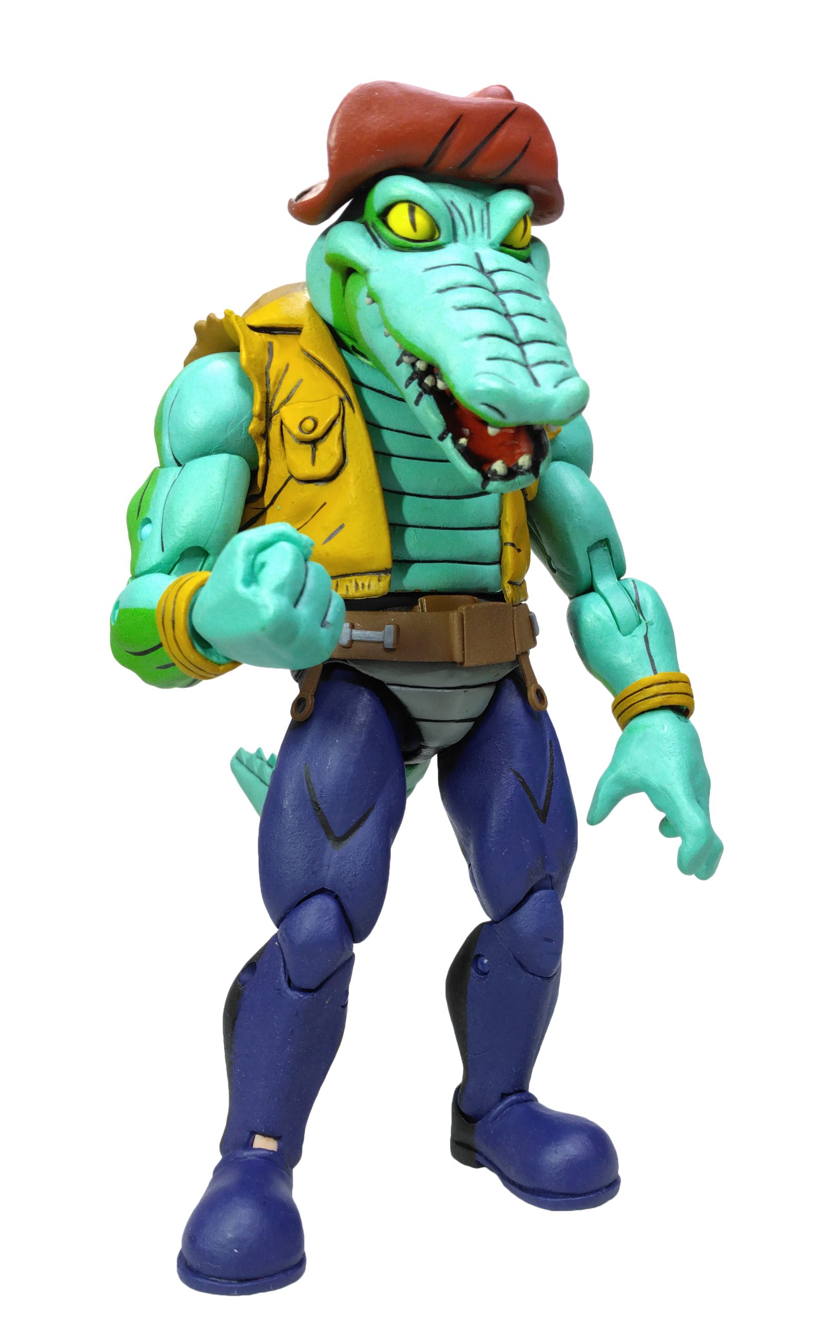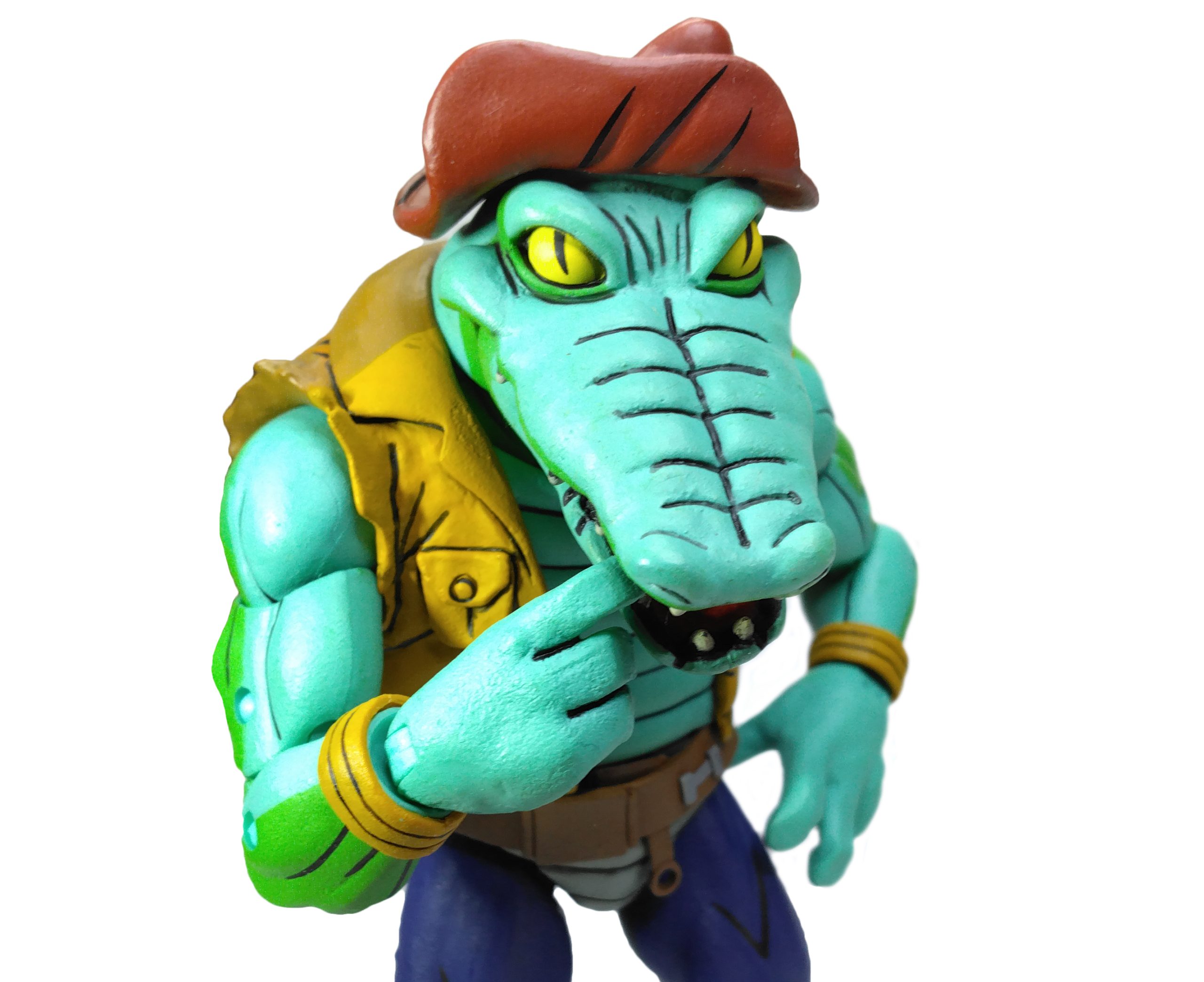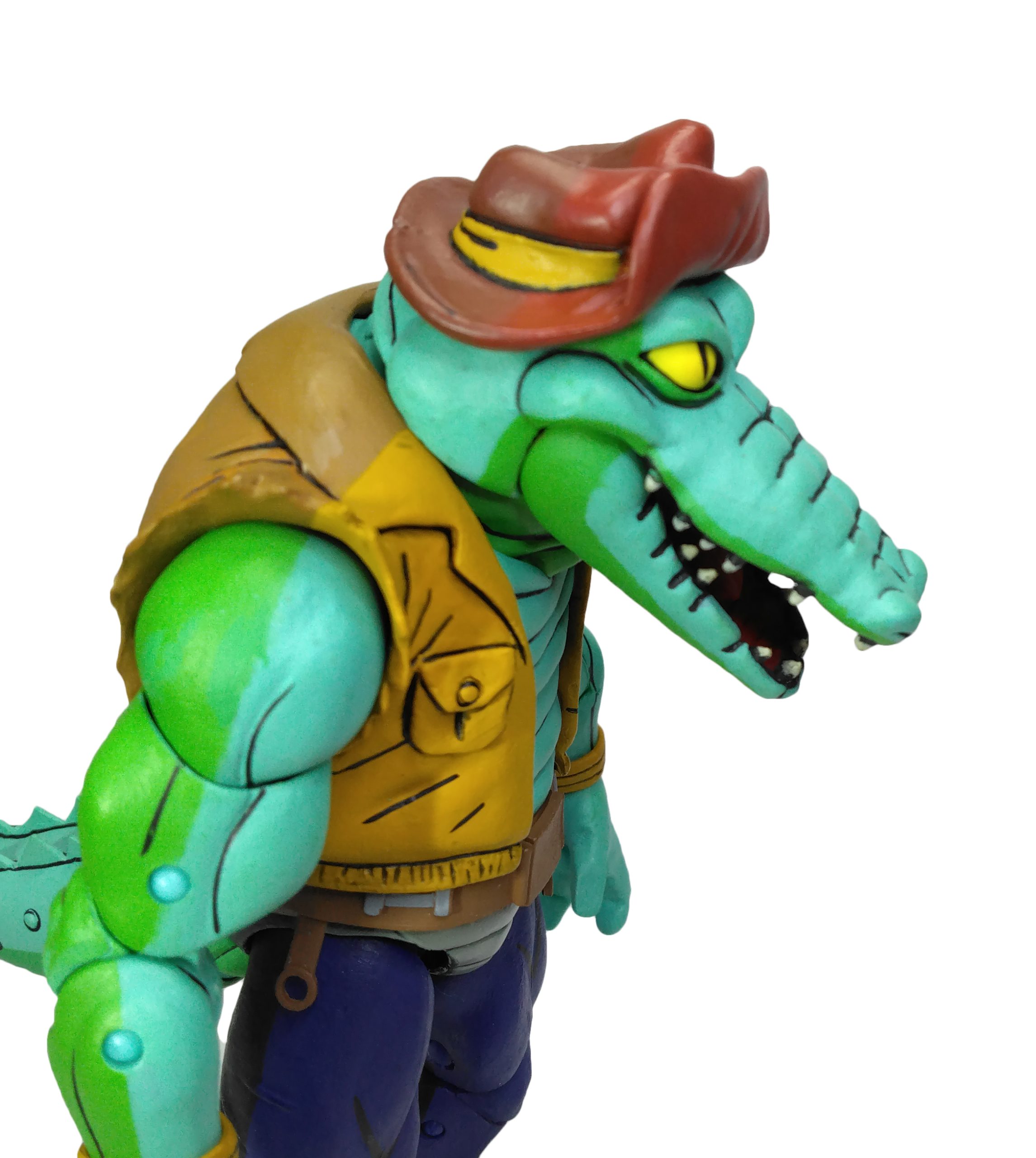 Le visage de Leatherhead est très bien réussi. Nous retrouvons les plis de son cuir jusqu’au museau et ses grands yeux. La bouche est articulée, permettant de voir les dents et sa langue. Son chapeau est collé à la tête et ne peut donc pas se retirer.