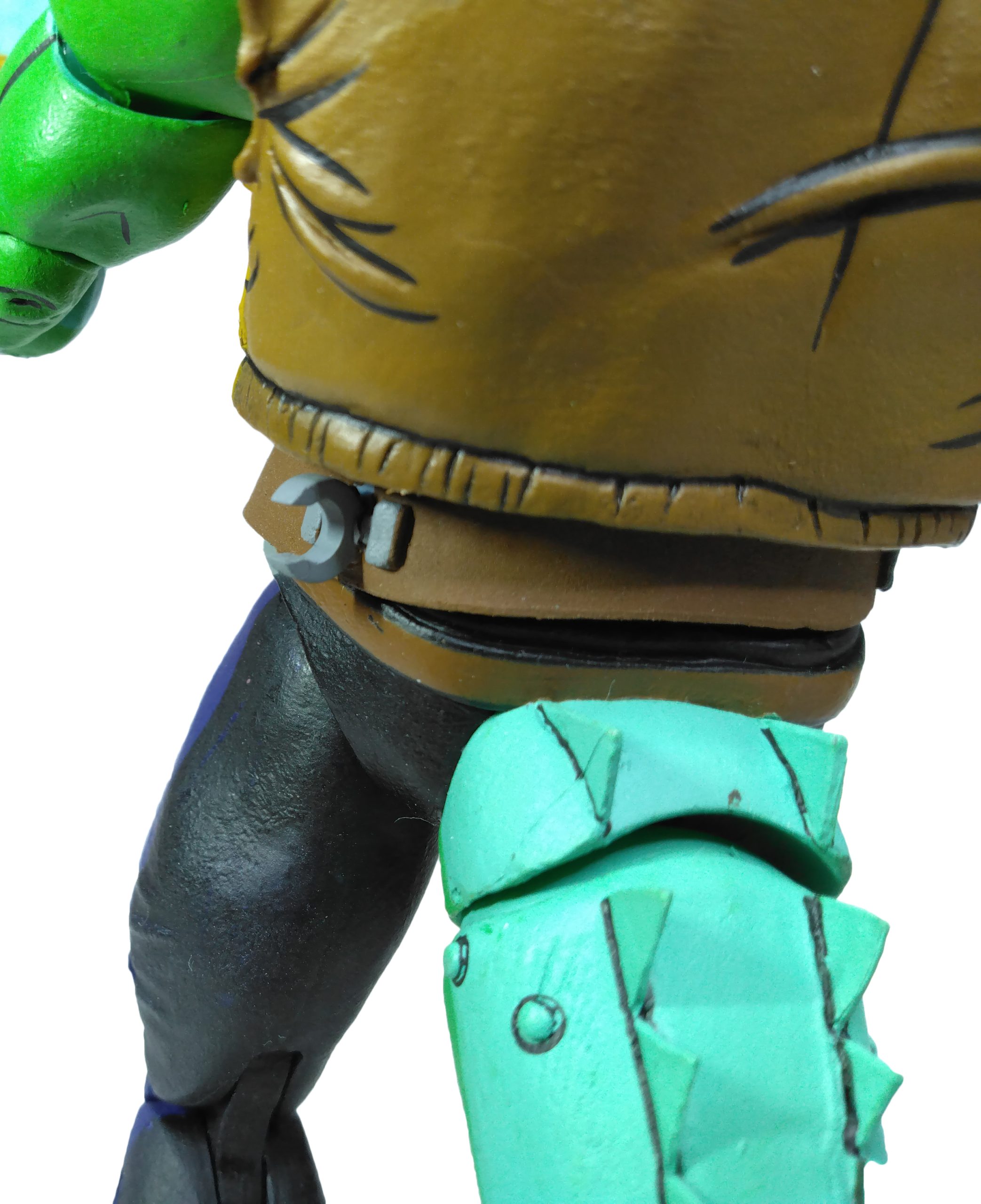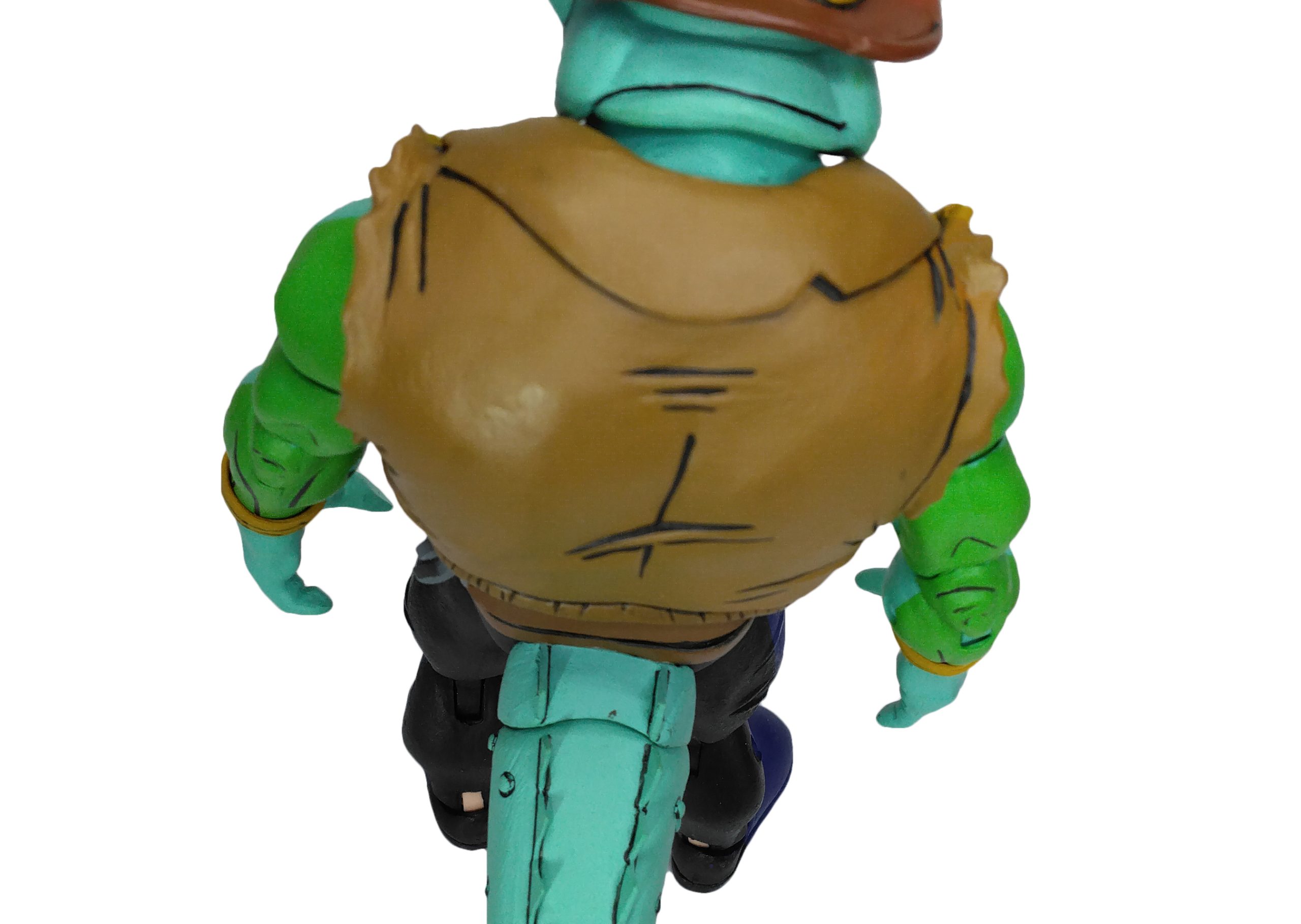 La veste de Leatherhead est très fournie en détails. Nous y retrouvons les nombreux plis comme aux manches déchirées, la frise en partie basse ou encore les poches latérales. Du côté des bras, l’alligator dispose de bracelets. Ceux-ci sont trop fins par rapport à ceux que possédait le mutant dans la série. Il s’agissait de bandes enroulées aux poignets. Ici, l’imitation est plutôt ratée et fait plus penser aux bracelets des tortues.