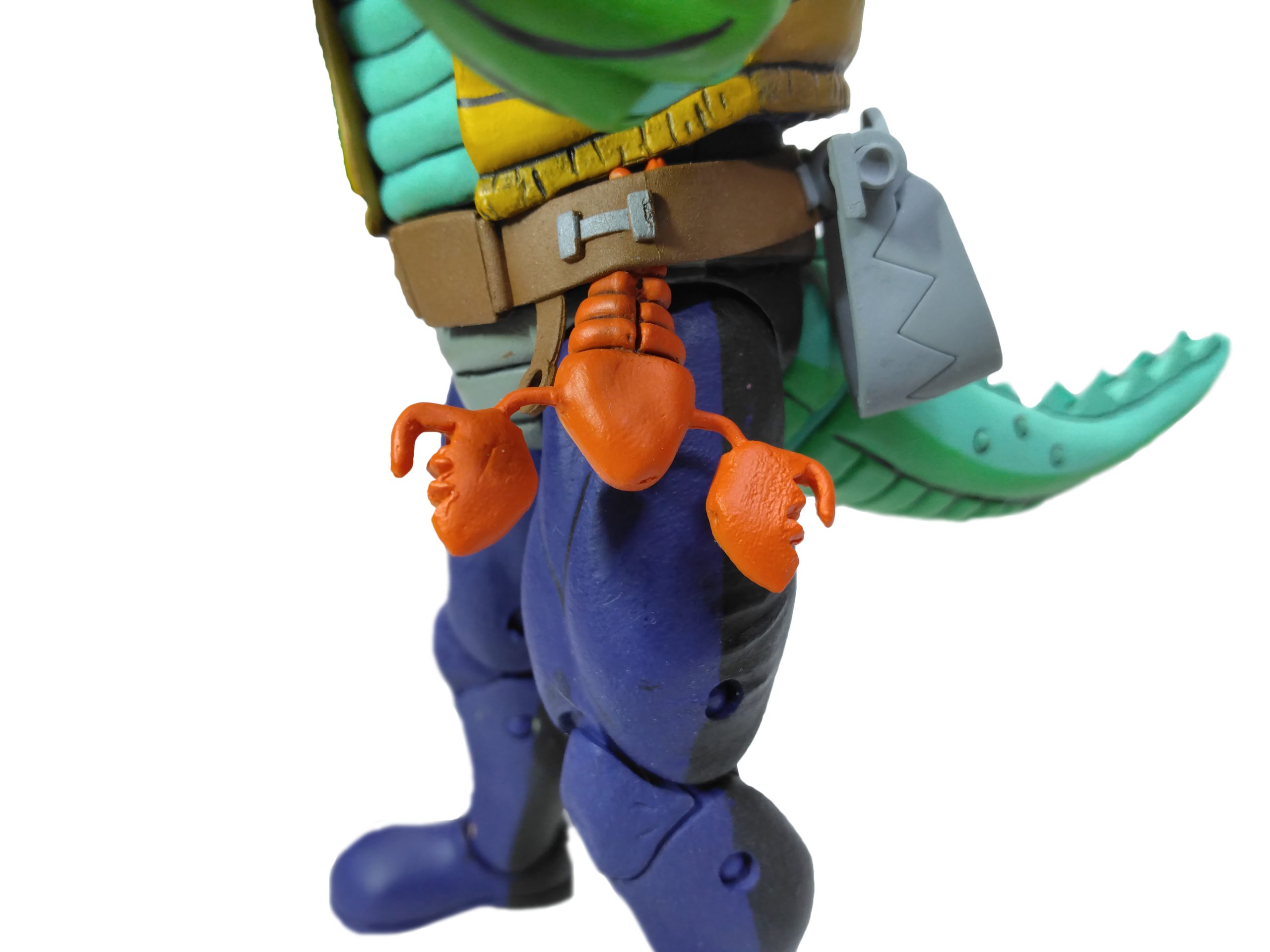 Quelques petites choses à redire, comme le manque de mobilité de la tête, la rigidité de sa queue ou encore ne pas pouvoir se servir de sa ceinture pour y fixer ses homards. L’articulation de la cheville, couleur chair, est en revanche une vraie aberration qui se voit d’autant plus que son pantalon est bleu foncé. Heureusement, ce détail a été corrigé lors des rééditions du personnage. Pour le reste, la figurine est très propre.