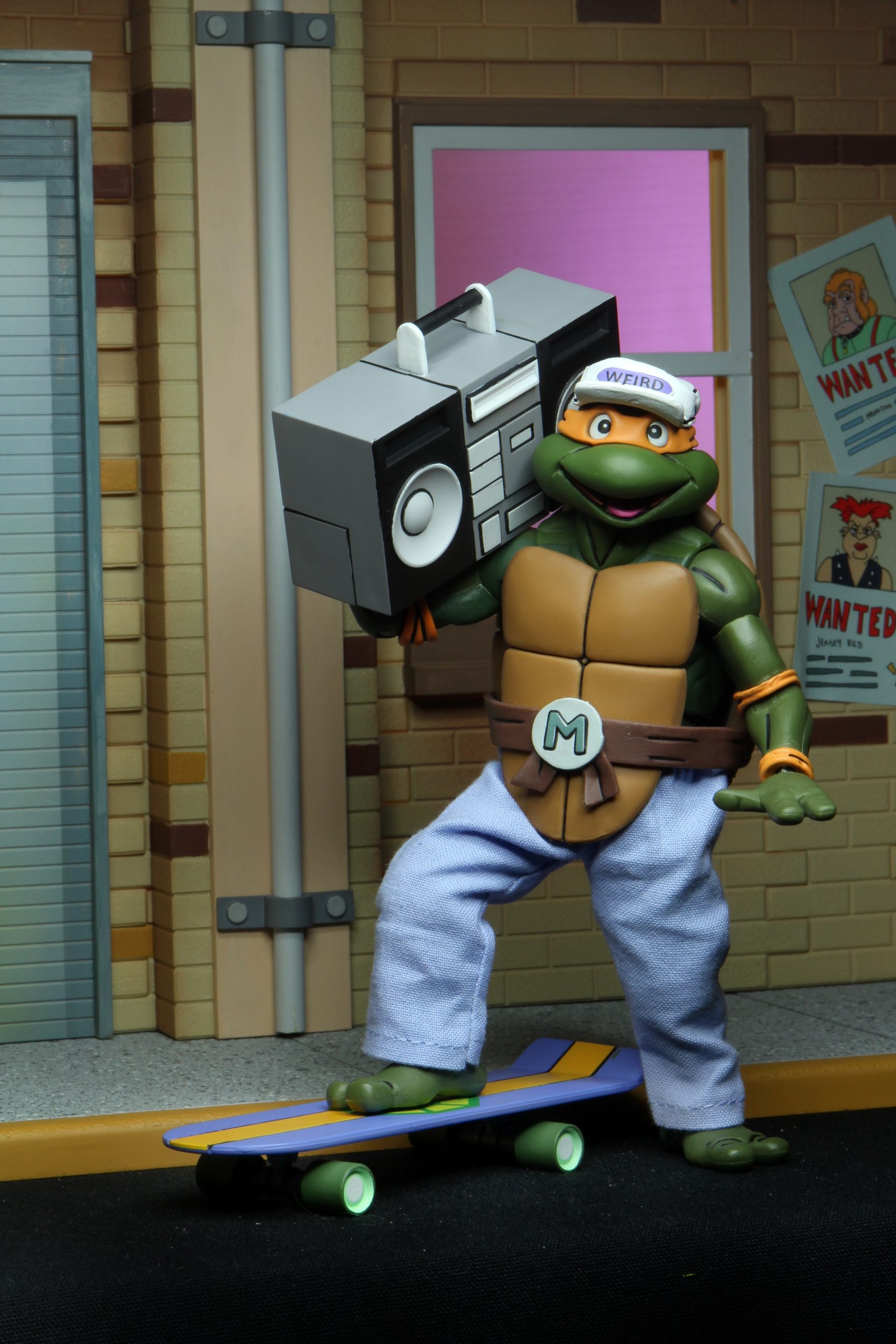 Sur la tranche supérieure de la boîte, nous retrouvons quelques papiers, le coupon promettant quatre pizzas pour le prix d’une seule (Retour à l’enfance, S4 E13) ou encore un avis de recherche concernant Shreeka (La vengeance de Shreeka, S6 E7). Sur la tranche de gauche, l’ombre à la fenêtre est celle de Baxter humain, teasant sa figurine pour l’année suivante (Premutation Baxter), un avis de recherche pour Rocksteady et une affiche de Combat Land, de l’épisode Le pays de la bagarre (S7 E26). De l’autre côté c’est l’ombre de Zach qui est vue dans la fenêtre, annonçant également sa figurine pour 2022. En dessous de la fenêtre se trouve un graffiti représentant la Swatter, grand ennemi de Bugman (figurine sortie en 2023) et une poubelle montrant Joe Eyeball, dont la figurine sortirait courant 2021 avec Muckman.
