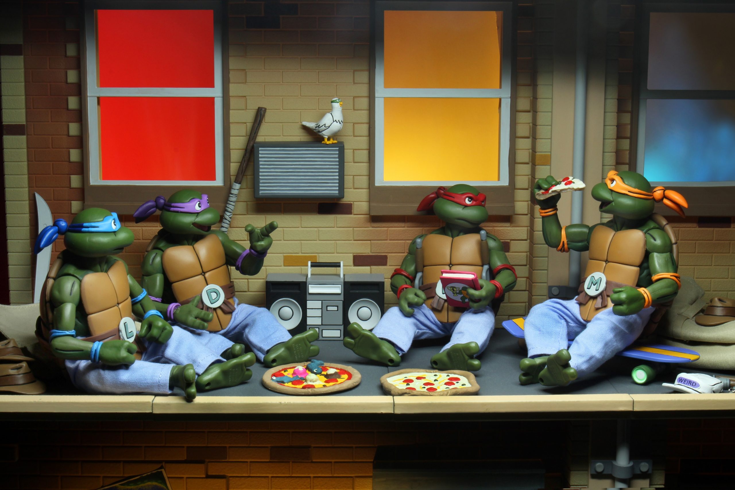 Nous retrouvons également le livre « Le lièvre et la tortue », histoire qu’April lit aux tortues à la fin de l’épisode Dimension X (S1 E4) pour aider ses amis à s’endormir. Enfin, l’imposant poste de radio est un accessoire assez atypique. Il provient de l’épisode Casey Jones, Hors la loi (S3 E23). Il s’agit de l’un des objets animés qui s’attaquent aux tortues dans la rue. Michaelangelo le combat à grands coups de poings dans les airs.