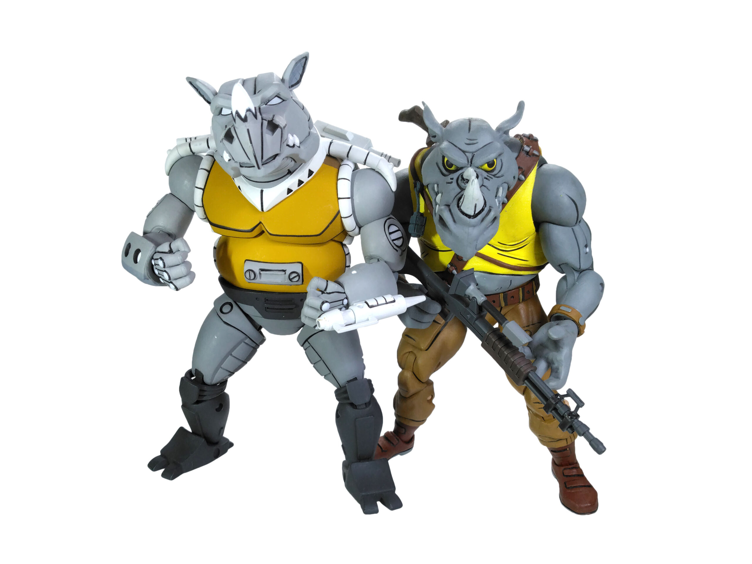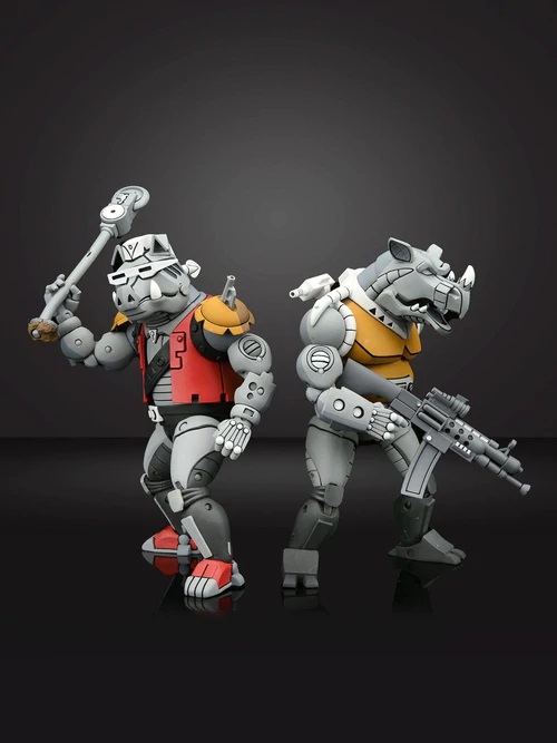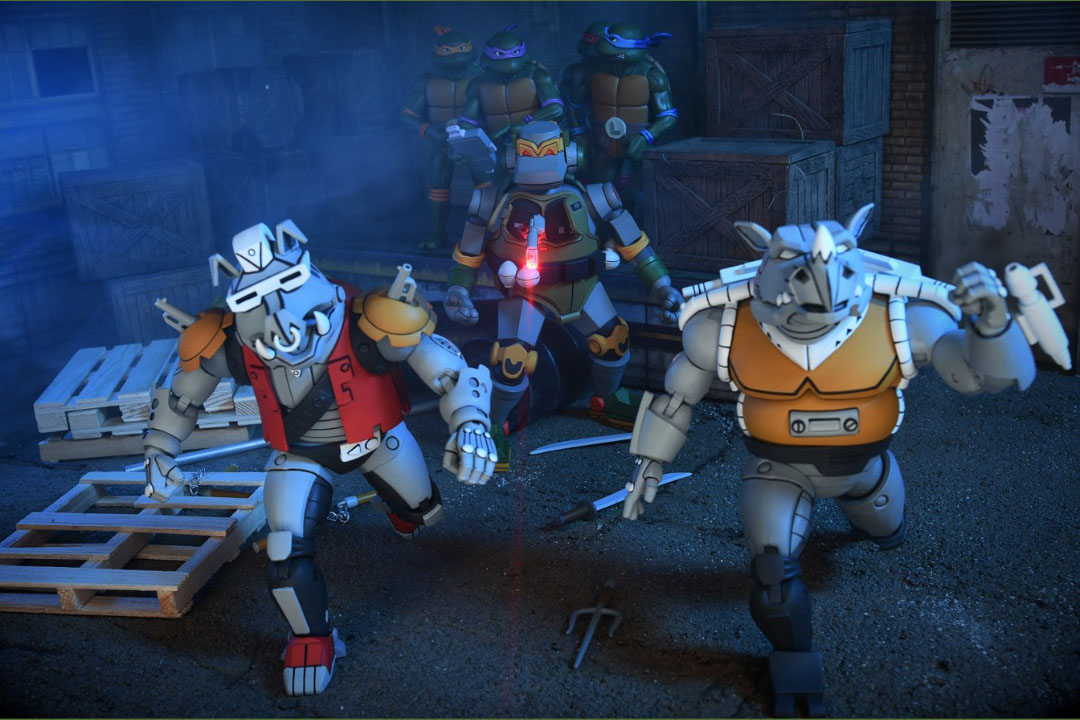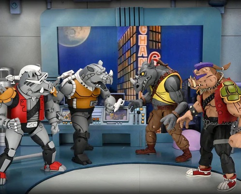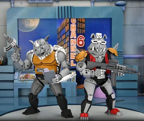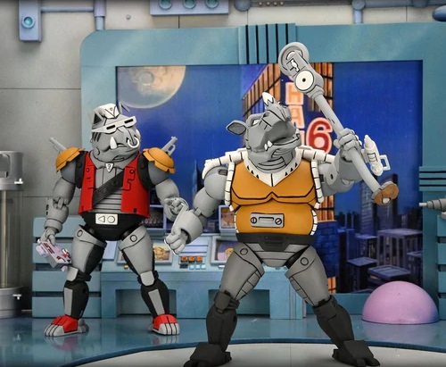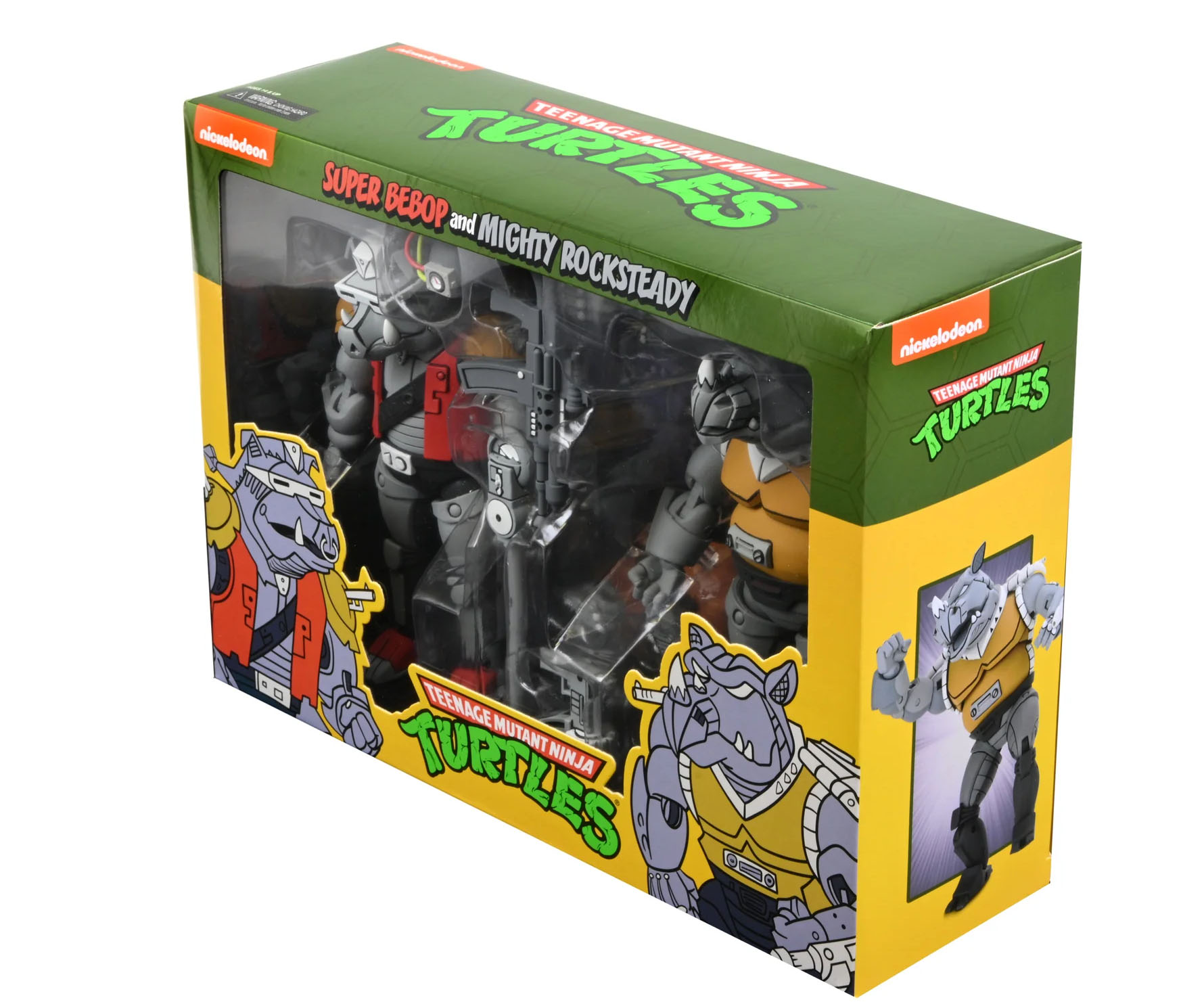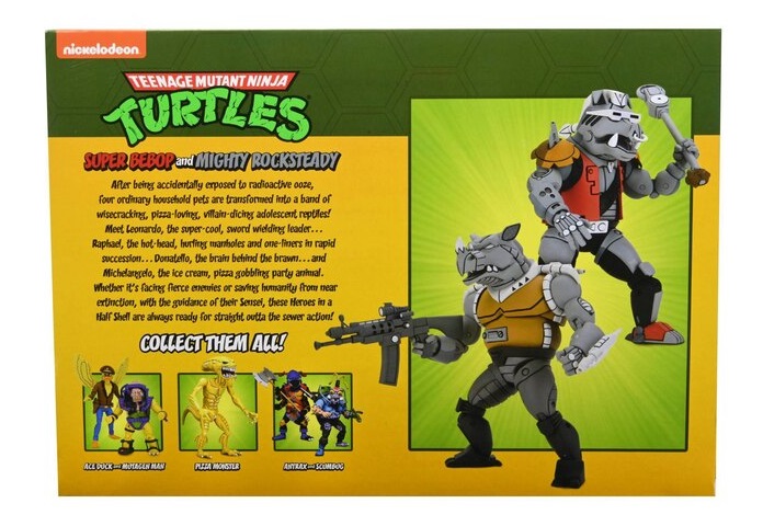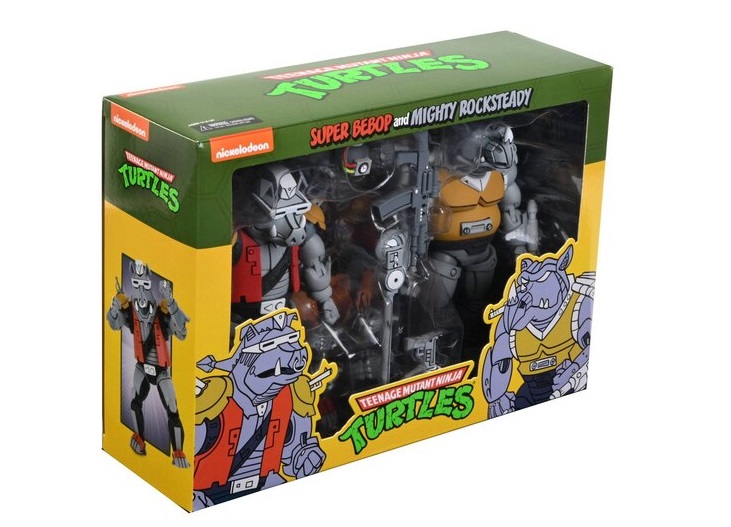 Notons enfin que NECA a repris le nom des deux robots depuis le titre de l’épisode Les super mutants (Super Bebop and Mighty RocksteadyVO). Néanmoins, les noms utilisés au sein de l’épisode (et donc de la production) étaient Mighty Bebop et Super Rocksteady.