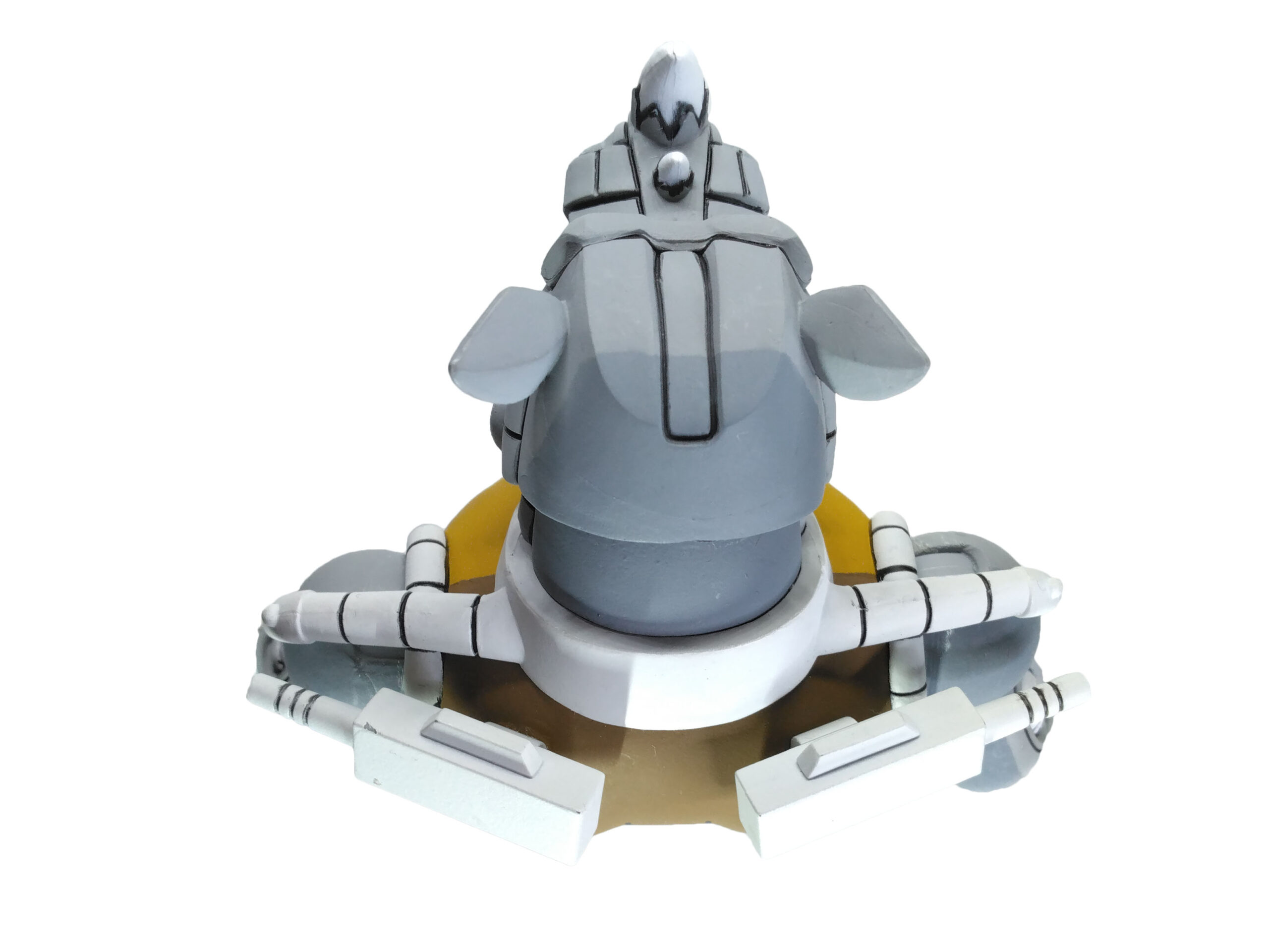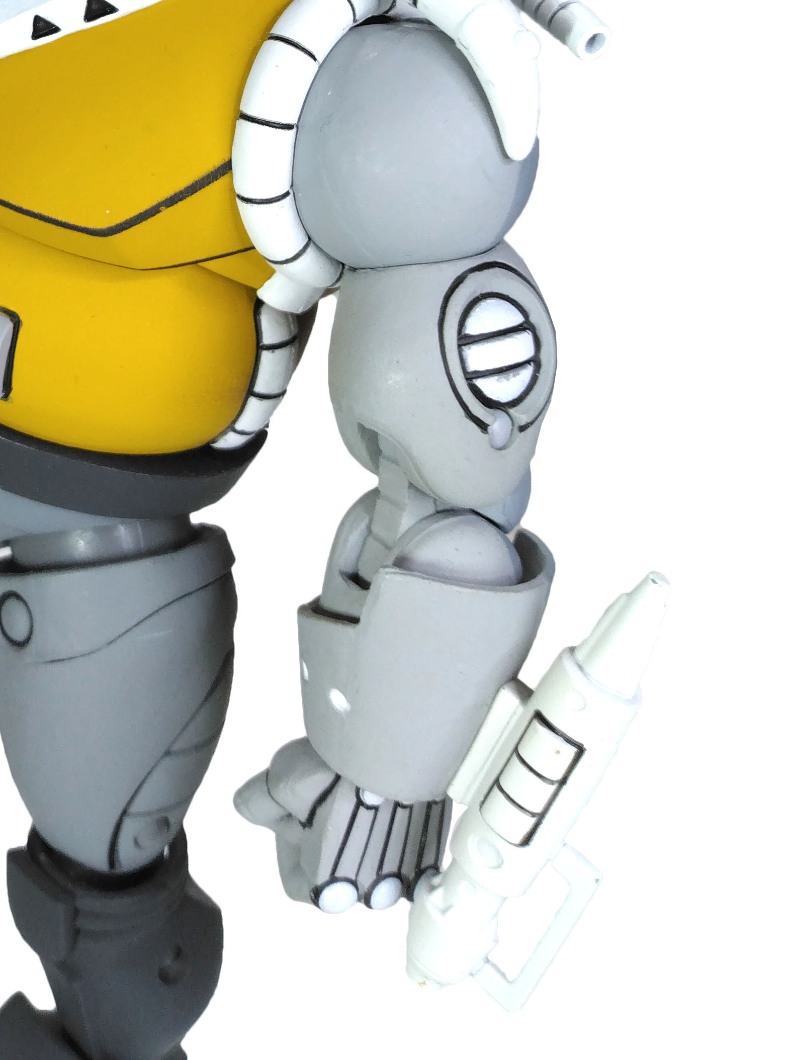À l’arrière, nous retrouvons également deux blasters, collés au niveau des omoplates. Il en va de même pour l’avant-bras gauche, avec un blaster directement moulé dessus. Contrairement à Super Bebop, seul le bassin est pourvu de plastique souple, pour faciliter l’articulation des jambes.