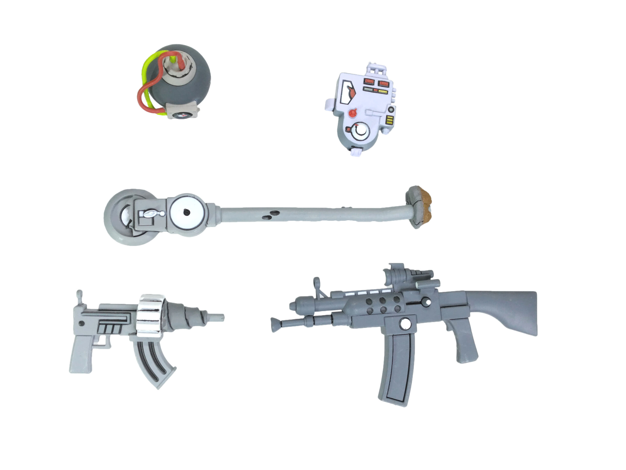 Le rhinocéros robotique possède également une arme qui pourrait lui être propre. Un fusil laser, rappelant l’arme du Rocksteady de Playmates Toys, sortie en 1988. Néanmoins, le Super Rocksteady du dessin animé n’utilisait aucune arme dans l’épisode Les super mutants (S3 E27). Je n’ai pas retrouvé l’origine de cette arme. De même pour la foreuse.