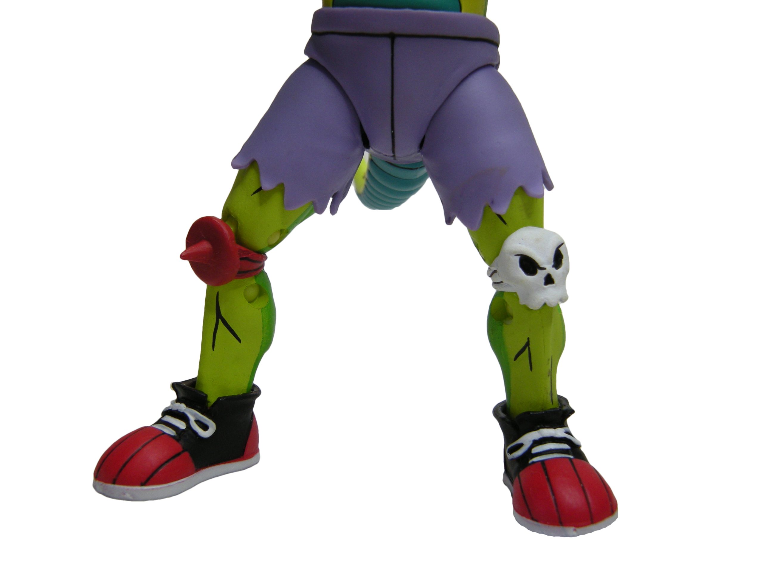 La figurine dispose d’un certain nombre d’articulations. Moins qu’à l’habitude, notamment au niveau des bras, mais c’est plus que suffisant ! En revanche, à noter la très grosse fragilité des articulations des coudes et des chevilles. J’ai plongé ces membres dans de l’eau chaude pour prévenir toute cassure… Le système d’articulation des chevilles est très similaire à celui de Bebop. Tout se passe dans la chaussure ! Donc veillez à bien travailler cette articulation pour éviter toute déception !