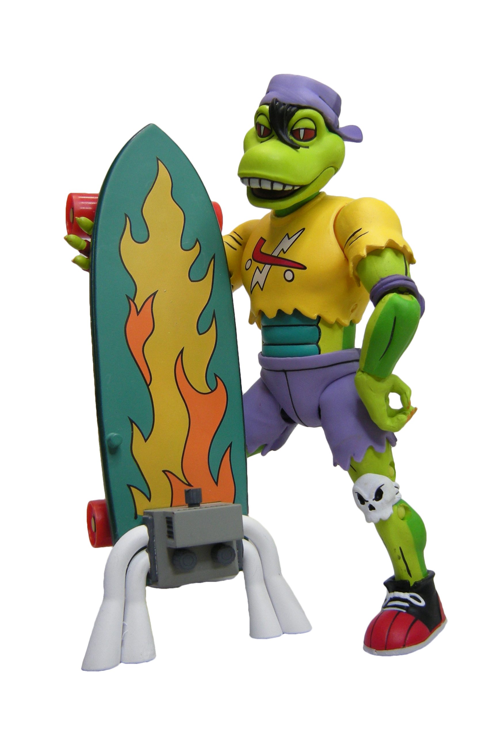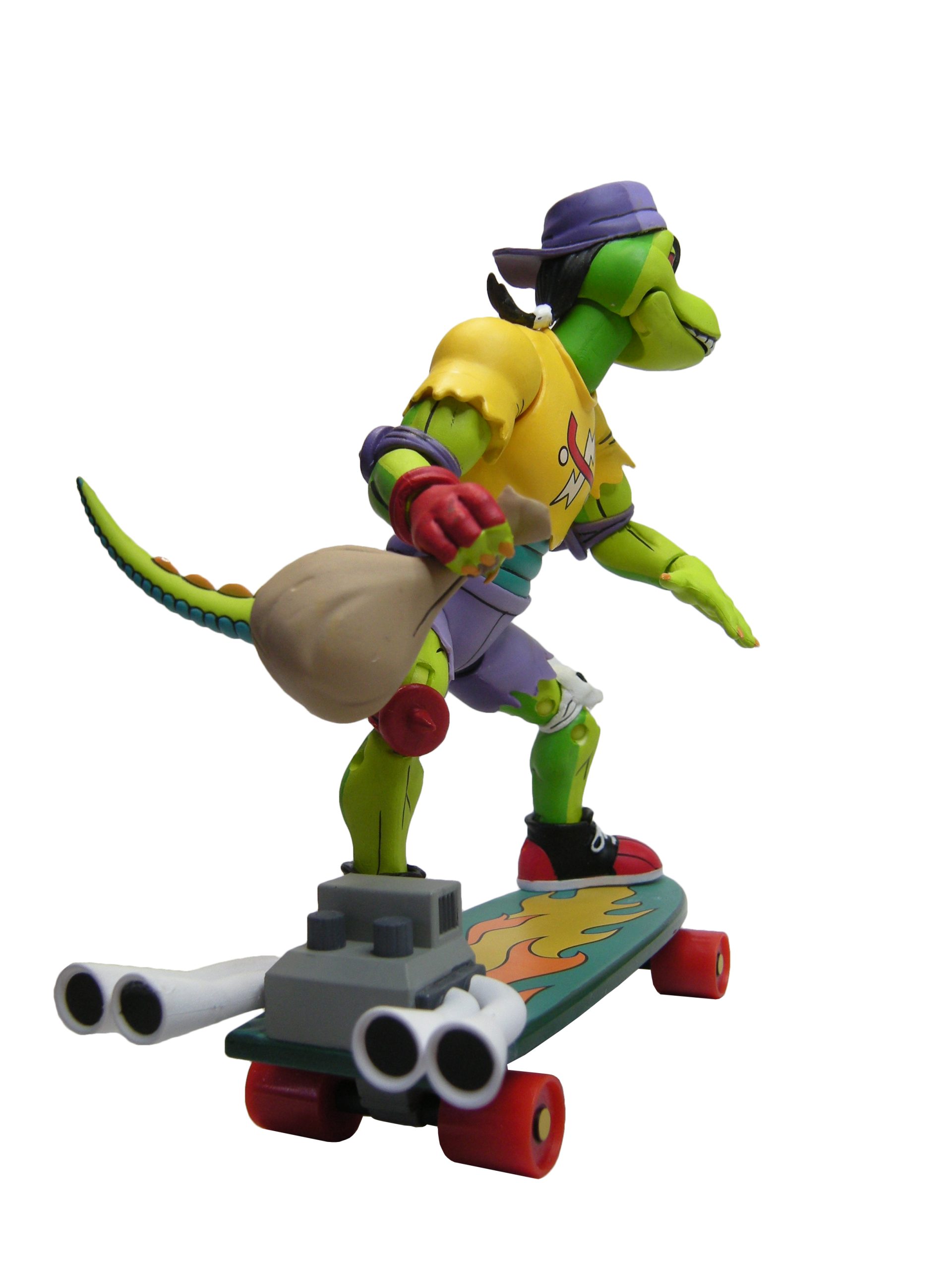 Nous retrouvons tous les éléments qui le caractérisent comme ces dents à l’avant qui dépassent de sa bouche, la mèche de cheveux entre les yeux, cette longue queue, ou encore les différentes protections aux genoux et aux coudes pour faire du skateboard.
