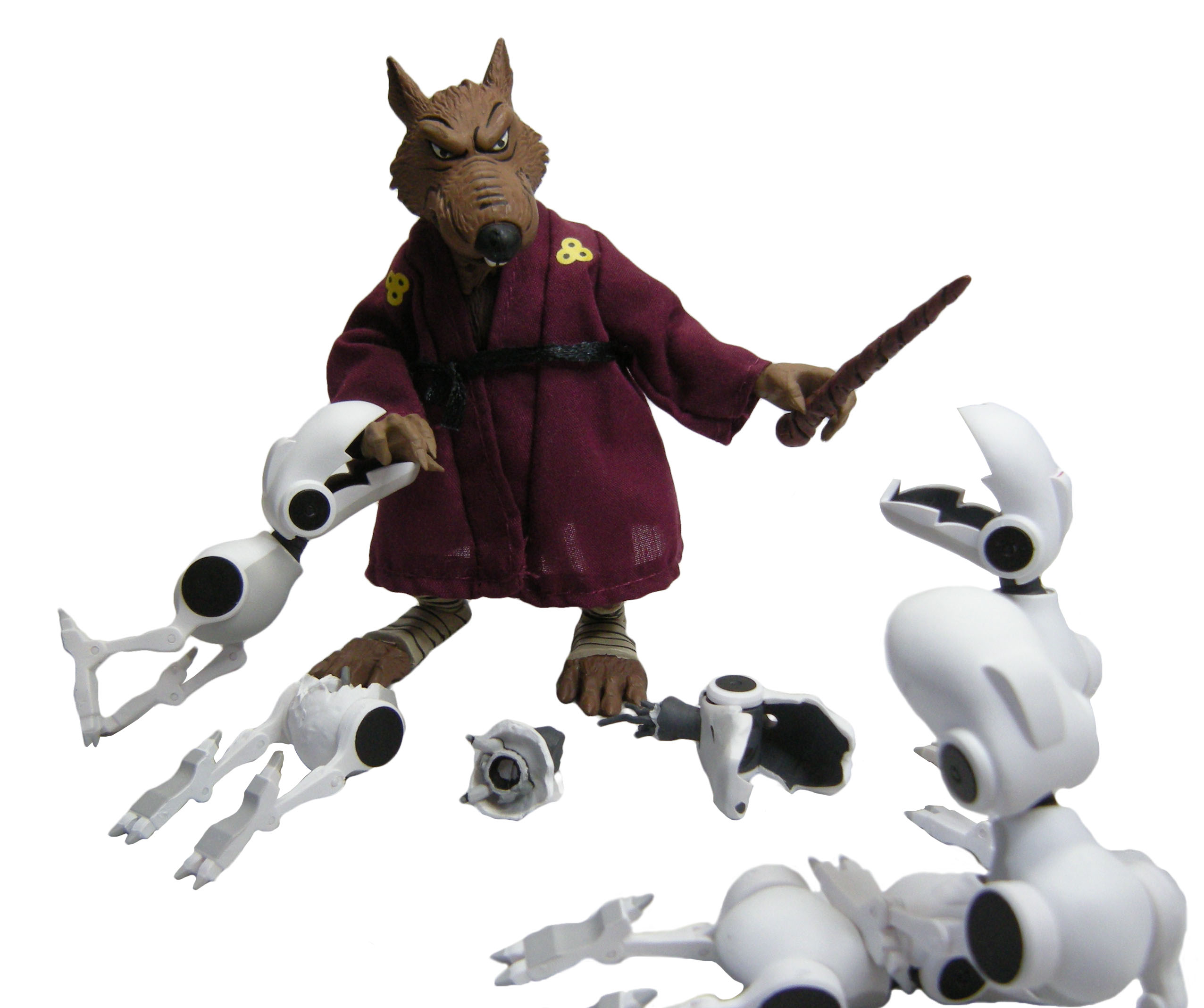 Côté Mousers, ces versions endommagées présentent deux têtes différentes, en plus de celle des Mousers opérationnels. L’une est légèrement cabossée (Mouser dont le rat sort du corps) et l’autre est salement cabossée (Mouser désactivé et Mouser en trois parties) et présente un trou au-dessus de l’œil. Ce trou est destiné à accueillir la pointe du saï de Raphael pour les mises en scènes de combat.