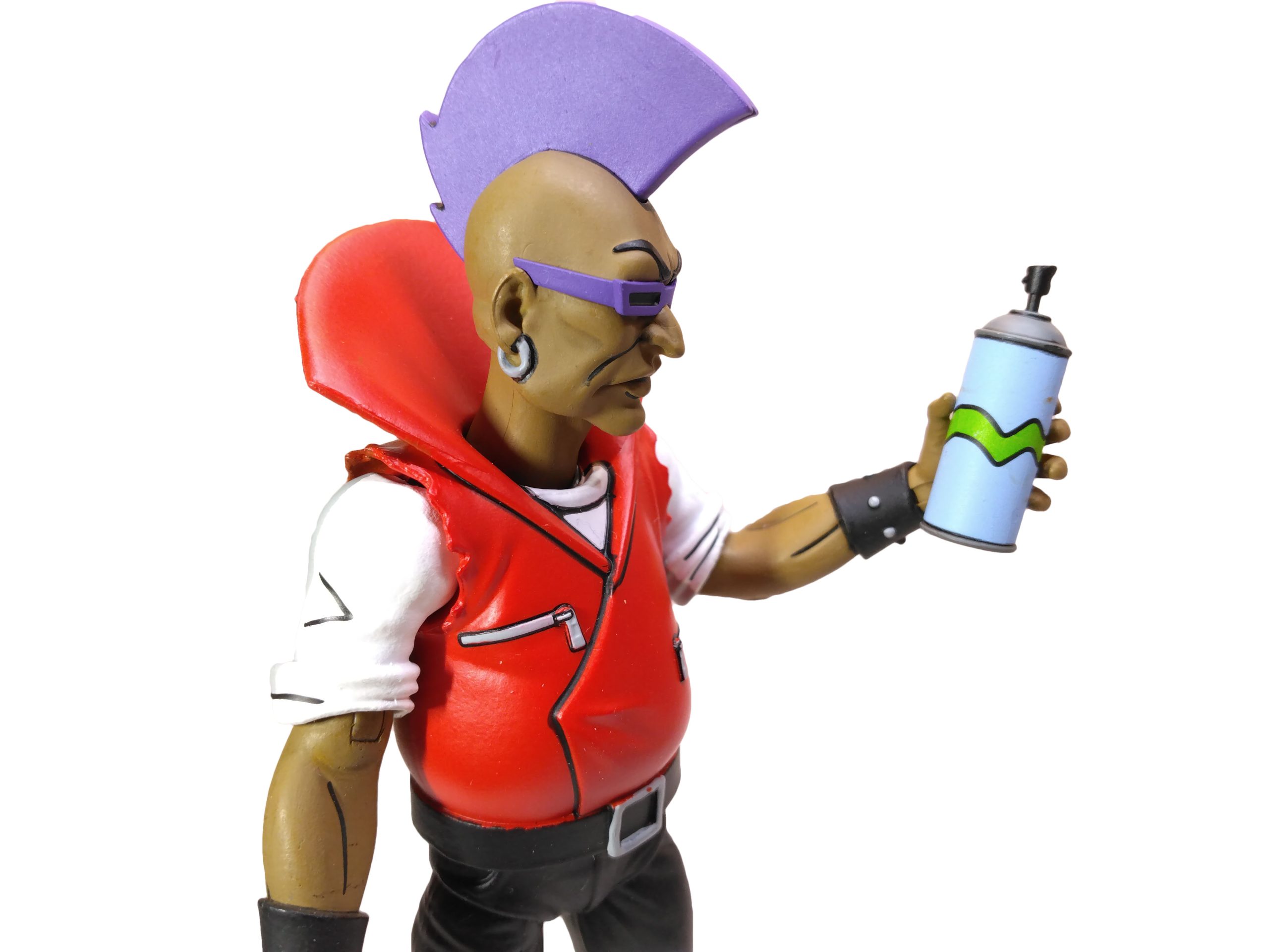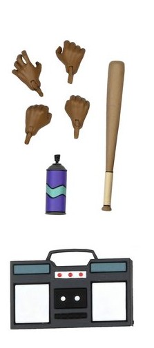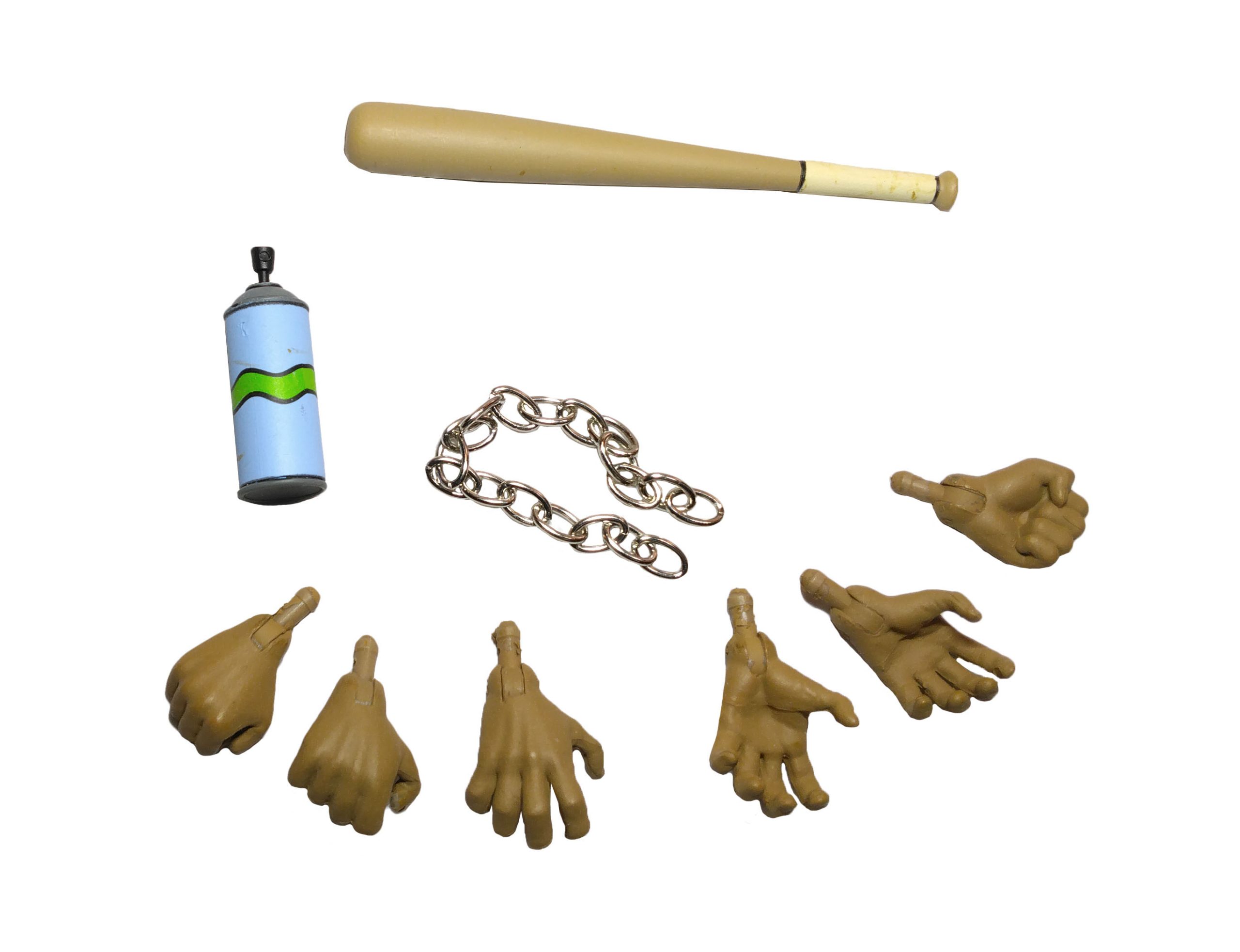 La figurine de Bebop est accompagnée de trios paires de mains, une bombe de peinture, une batte de baseball, une chaîne et d’un pied de biche.