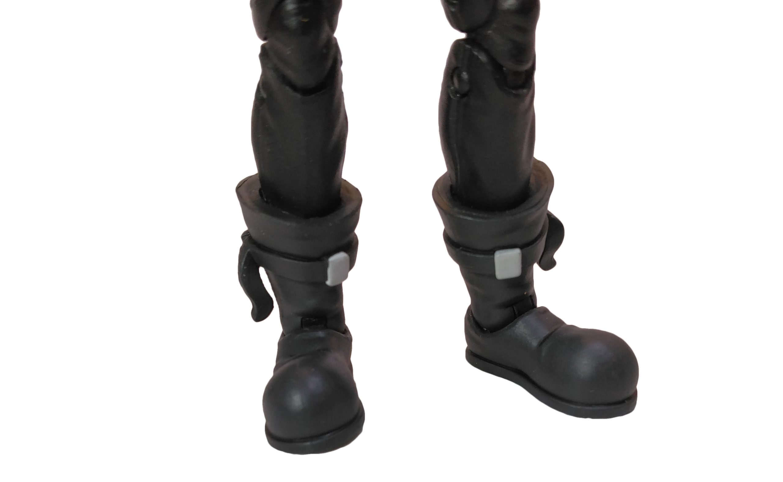 Comme bien souvent, cette figurine dispose d’un mélange de plusieurs plastiques, rigides et malléables. Le plastique souple se trouve au niveau de sa veste et du haut de son pantalon. Ce vêtement est très finement sculpté, avec des fermetures éclaires, de nombreux plis, cet impressionnant col qui englobe le crâne de Bebop.