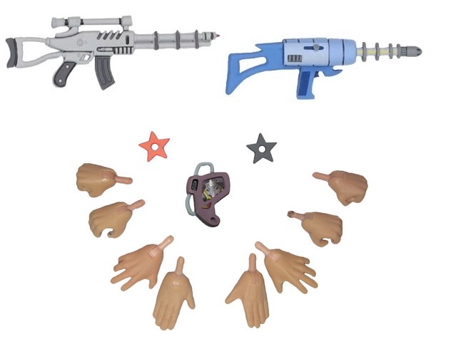 Aux premiers abords, la figurine est très richement fournie en accessoires. Quatre paires de mains (!), deux fusils lasers, deux shurikens et un communicateur. Mais que valent-ils ? Ces accessoires sont identiques pour les deux Foot soldiers endommagés de la wave 3. Seule une petite subtilité est cachée.