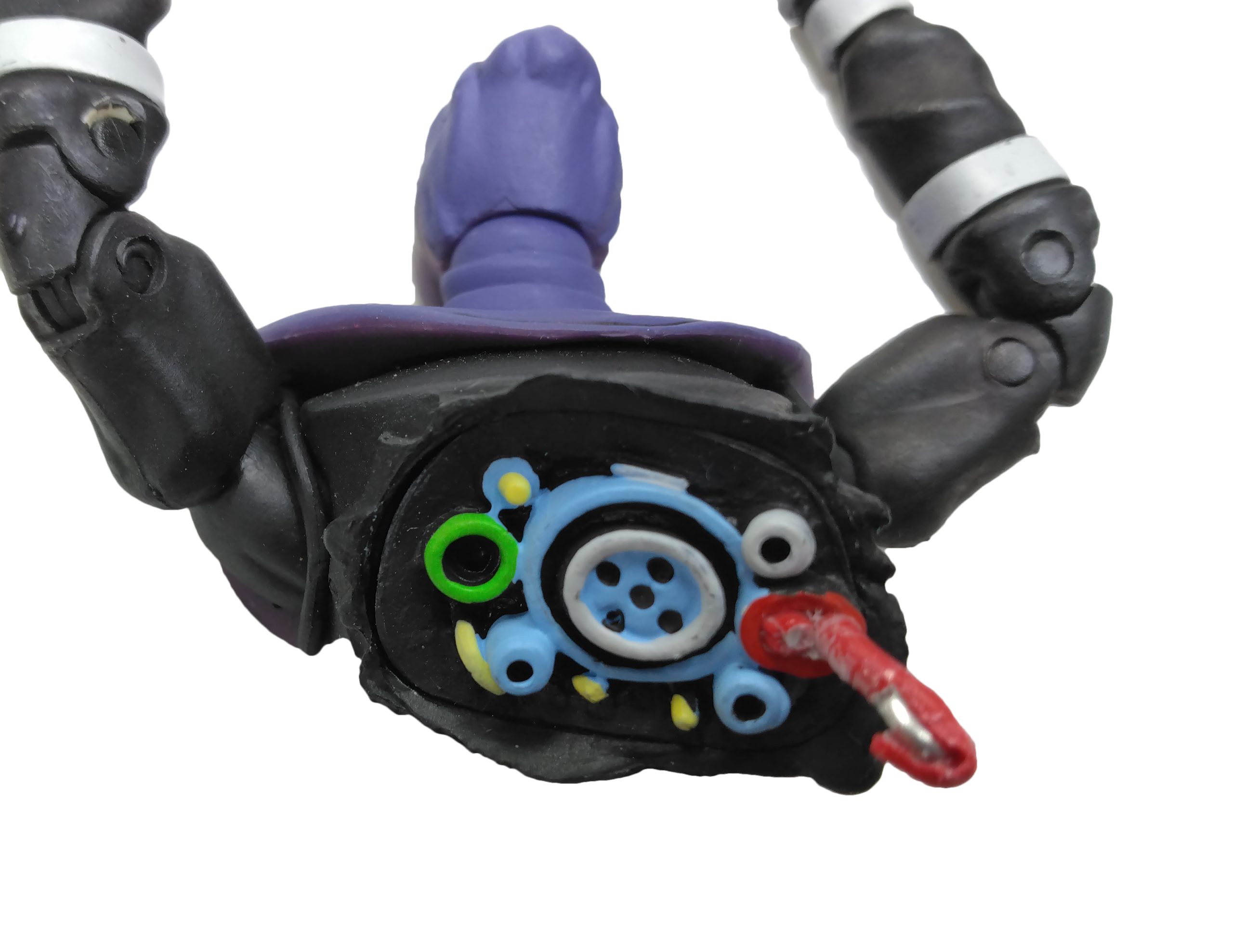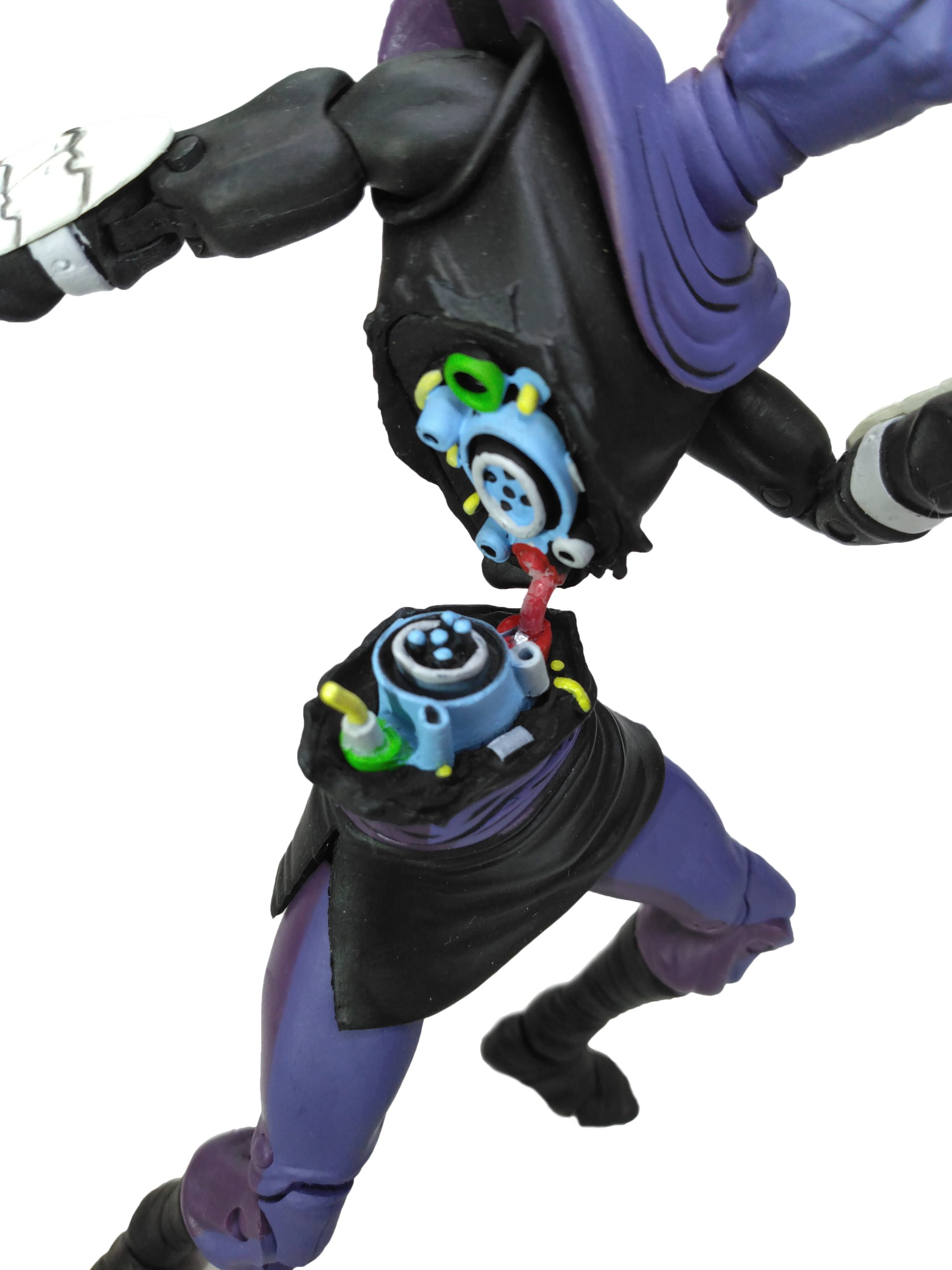 L’intérieur du robot, largement visible depuis sa blessure, est la partie la plus intéressante de la figurine. Nous y retrouvons un grand nombre de pièces mécaniques, peintes d’un bleu clair, surligné de noir et de gris. Les câbles sont variés, certains verts, certains jaunes. Celui qui maintient la partie haute et la partie basse de la figurine, est peint en rouge. Attention à ne pas trop l’actionner, car la peinture tend à s’écailler, laissant apparaître une tige de métal.