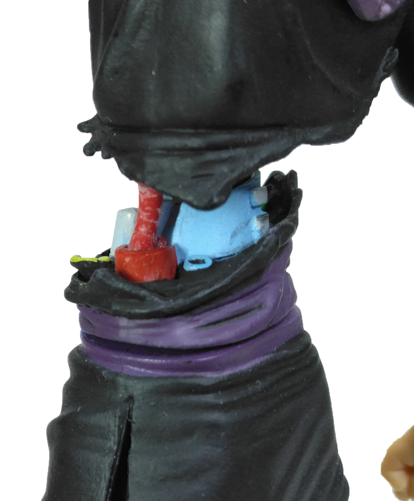 Comme nous l’avons vu dans le descriptif de la figurine, le tronc de la figurine a été entièrement revu. En revanche, nous retrouvons sur l’arrière de la figurine une partie du tissu de la ceinture laissé noir.