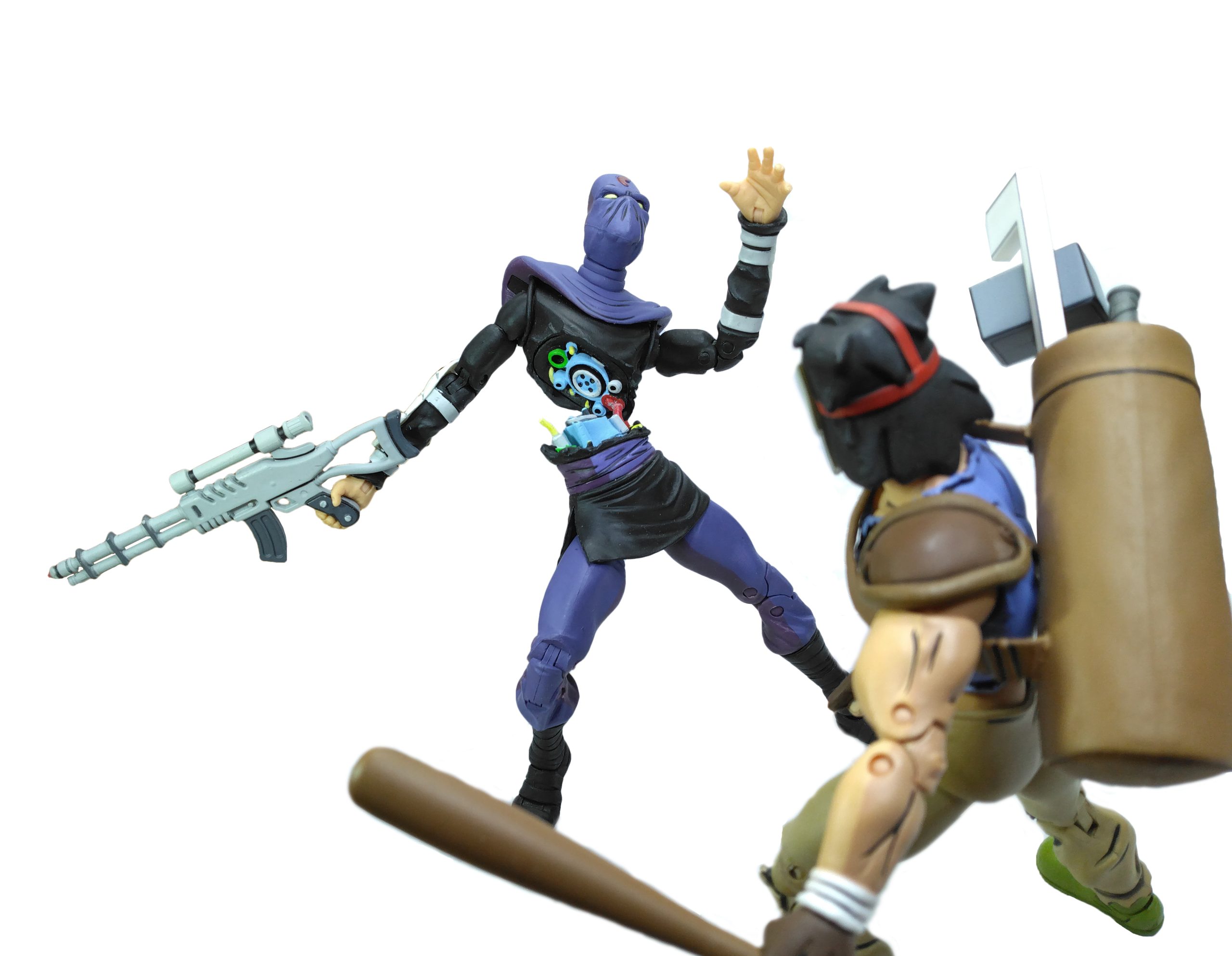 Enfin, les fusils ! Le premier est une reprise des fusils proposés avec les Foot soldiers des waves précédentes et de Bebop et Rocksteady. Rien de bien nouveau donc ! Le second en revanche est totalement inédit. D’une couleur bleutée son design est assez différent de ceux que l’on pouvait voir généralement dans la série. La crosse de l’arme est en revanche bien plus épaisse que l’ouverture des mains des ninjas robots et peut donc les abîmer.