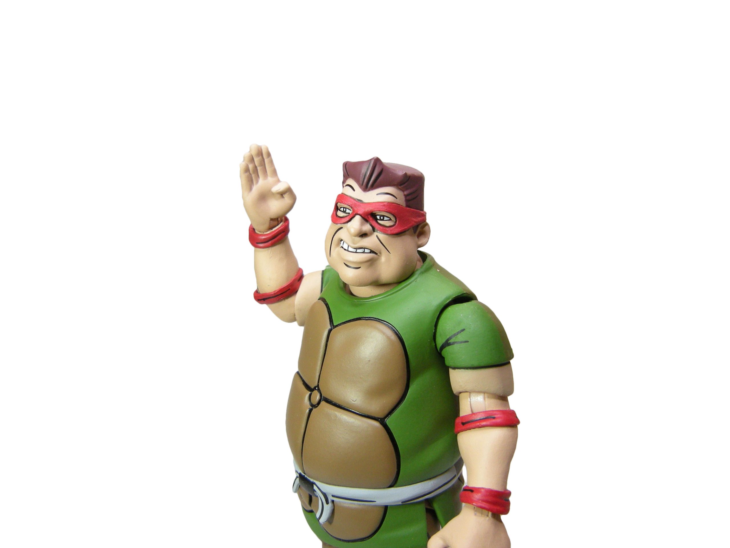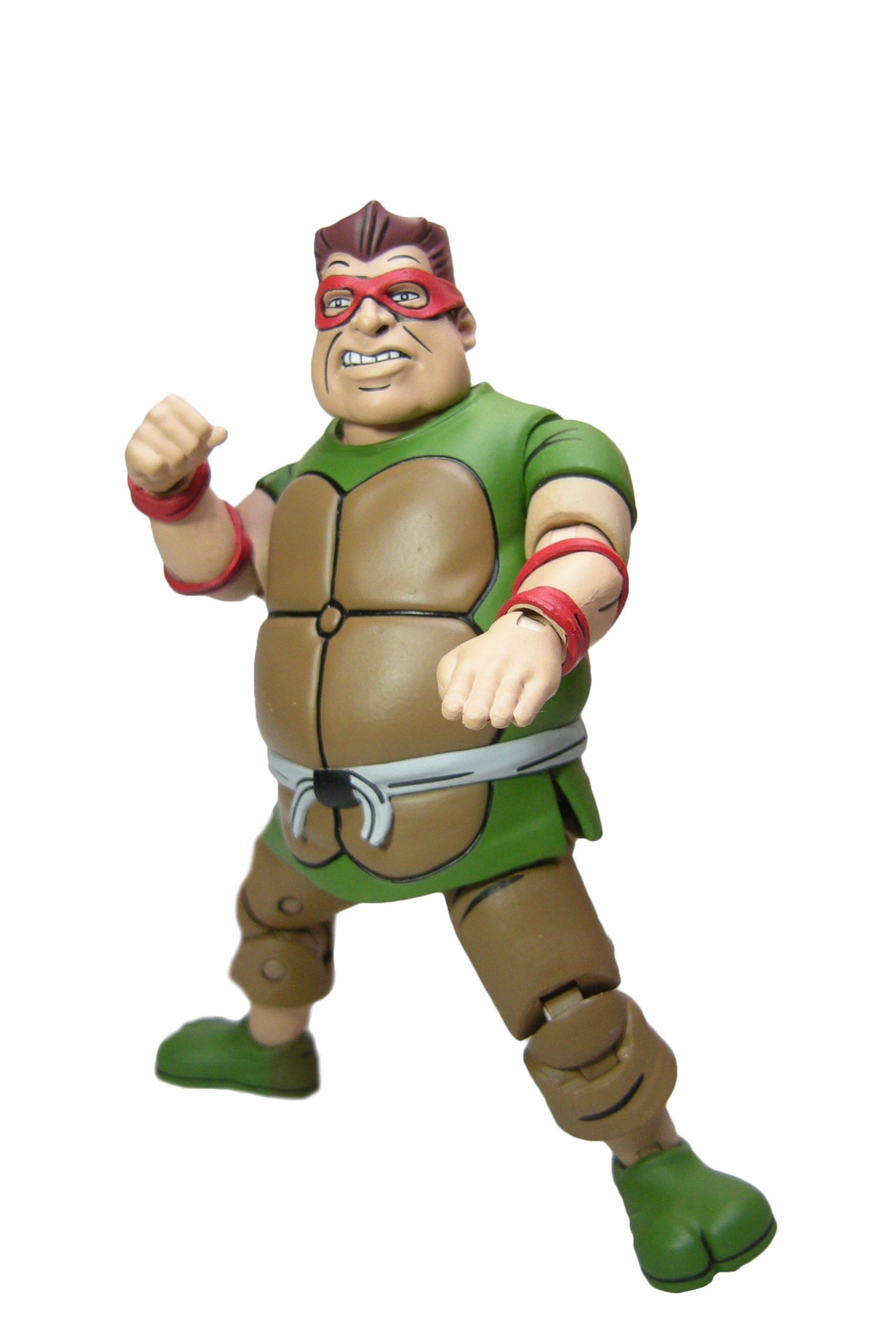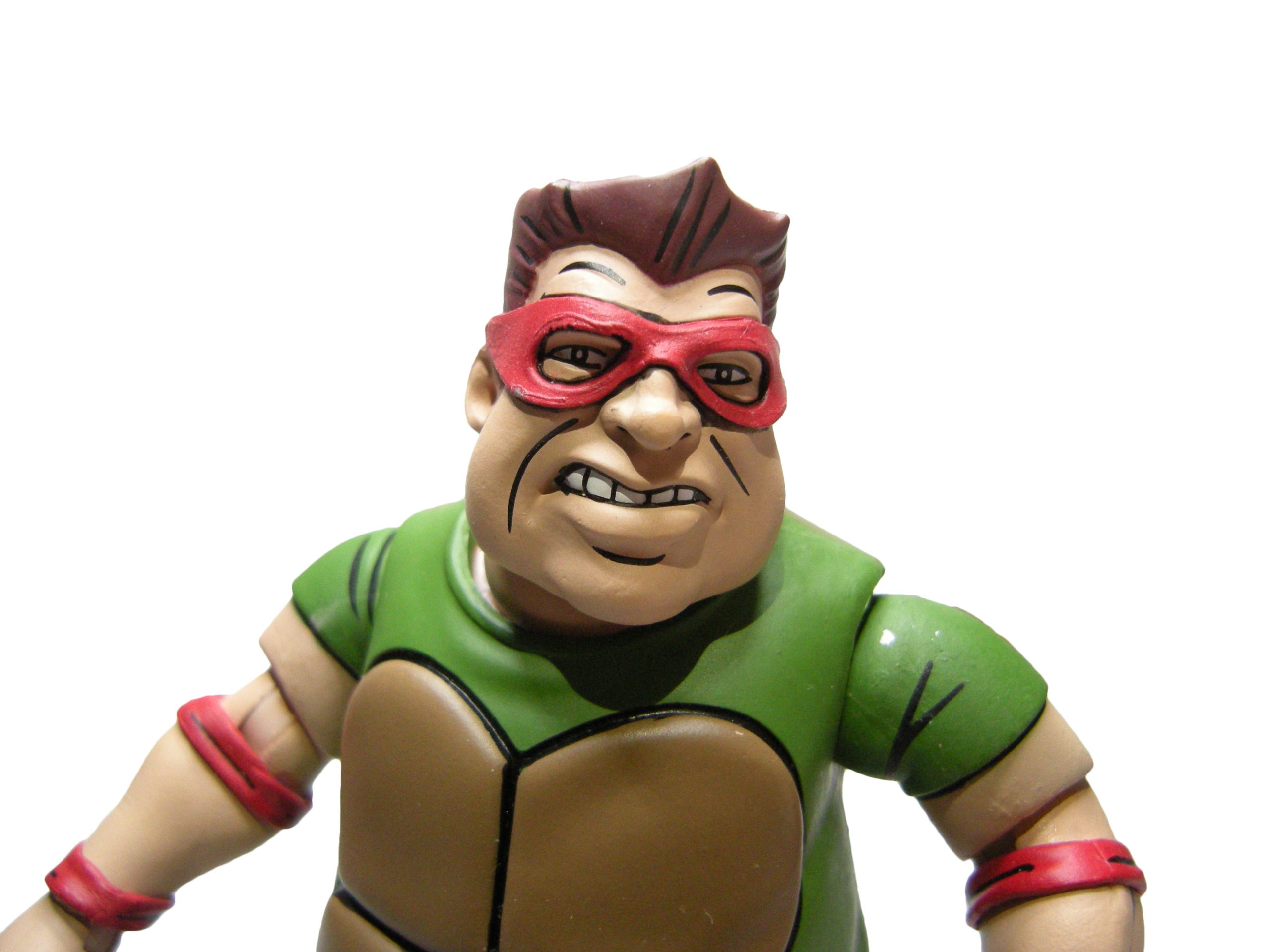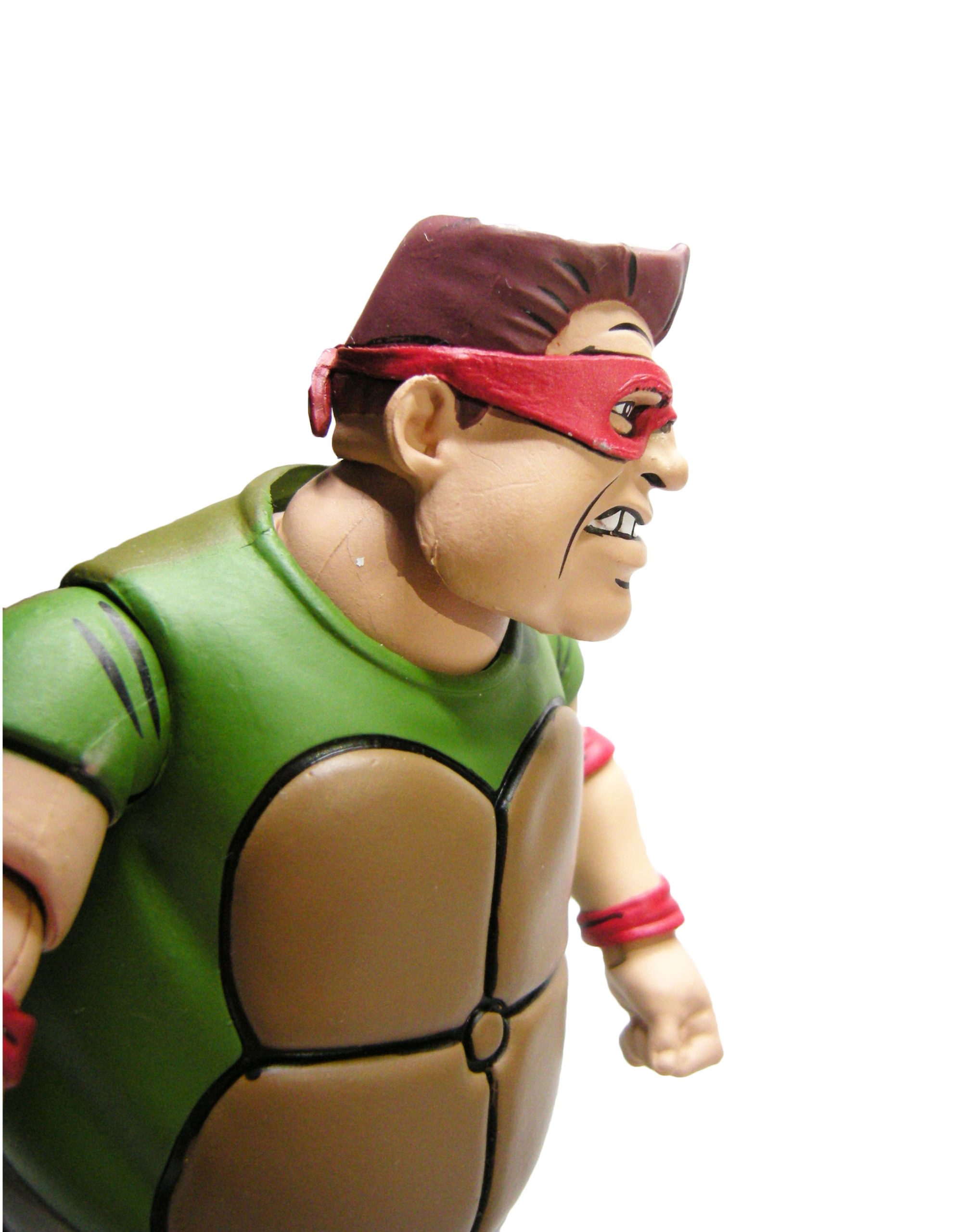 Le schéma de couleur est le même que pour les membres du Crooked Ninja Turtle Gang. J’ai peut-être juste une réserve sur le vert employé à l’avant, trop clair rapport à celui de l’arrière qui correspond mieux à celui utilisé pour les zones d’ombrage dans l’épisode du dessin animé. La carapace dans le dos dispose de deux couleurs, marron et jaune/brun, comme dans la série.