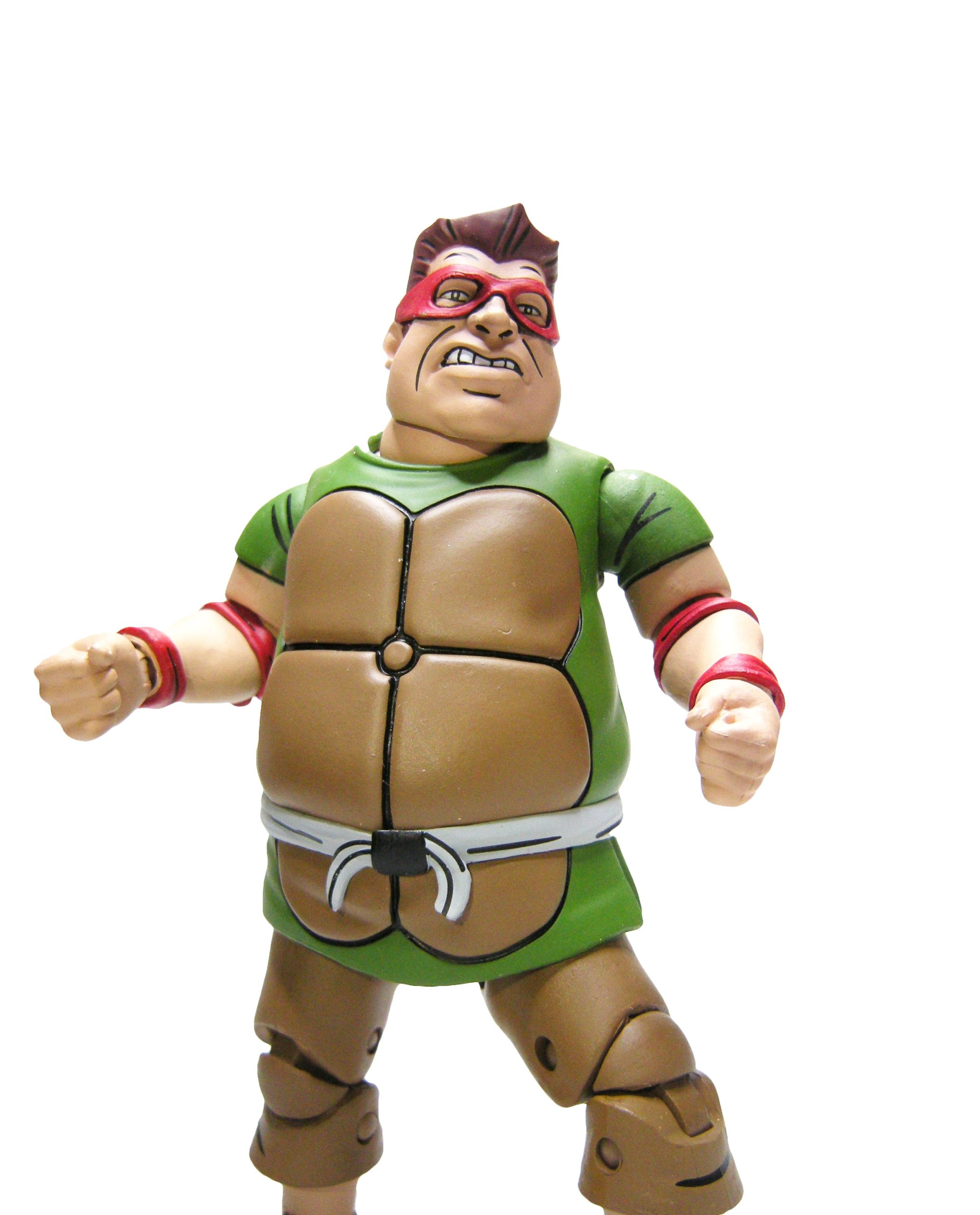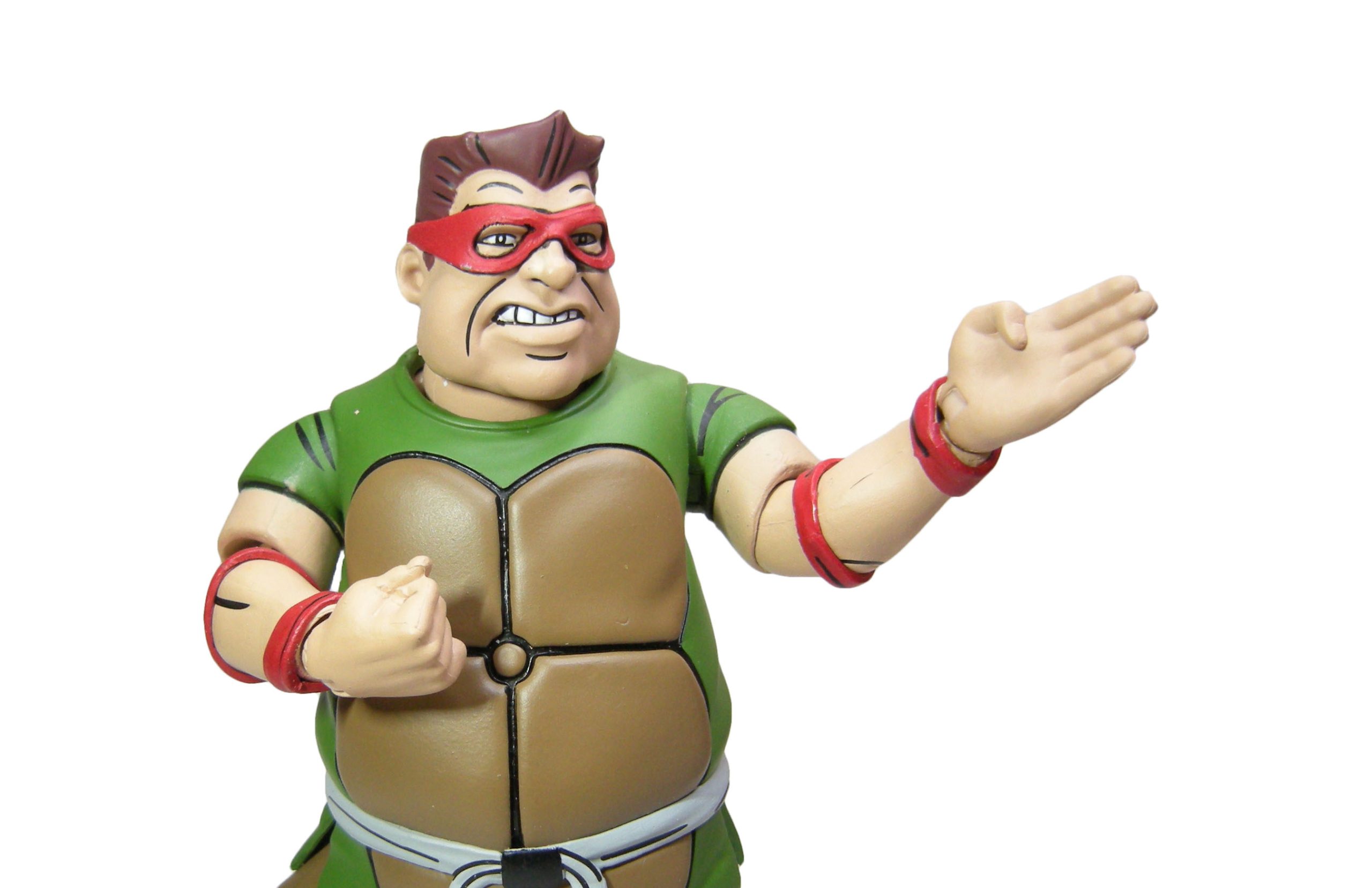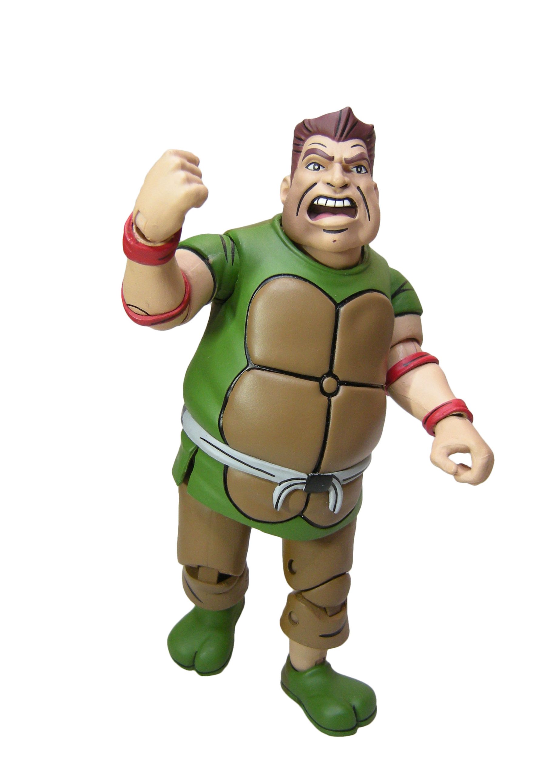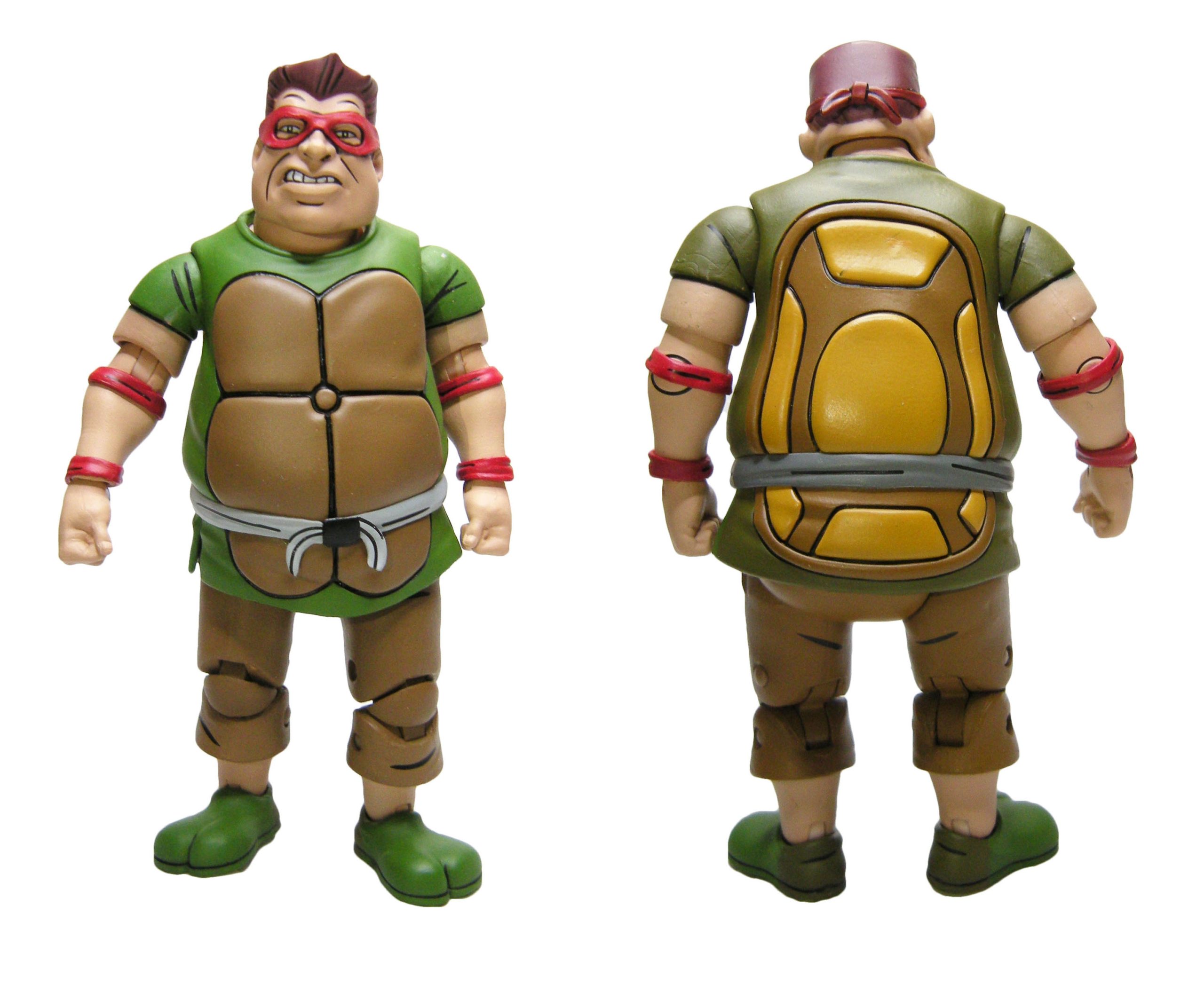 Le schéma de couleur est le même que pour les membres du Crooked Ninja Turtle Gang. J’ai peut-être juste une réserve sur le vert employé à l’avant, trop clair rapport à celui de l’arrière qui correspond mieux à celui utilisé pour les zones d’ombrage dans l’épisode du dessin animé. La carapace dans le dos dispose de deux couleurs, marron et jaune/brun, comme dans la série.