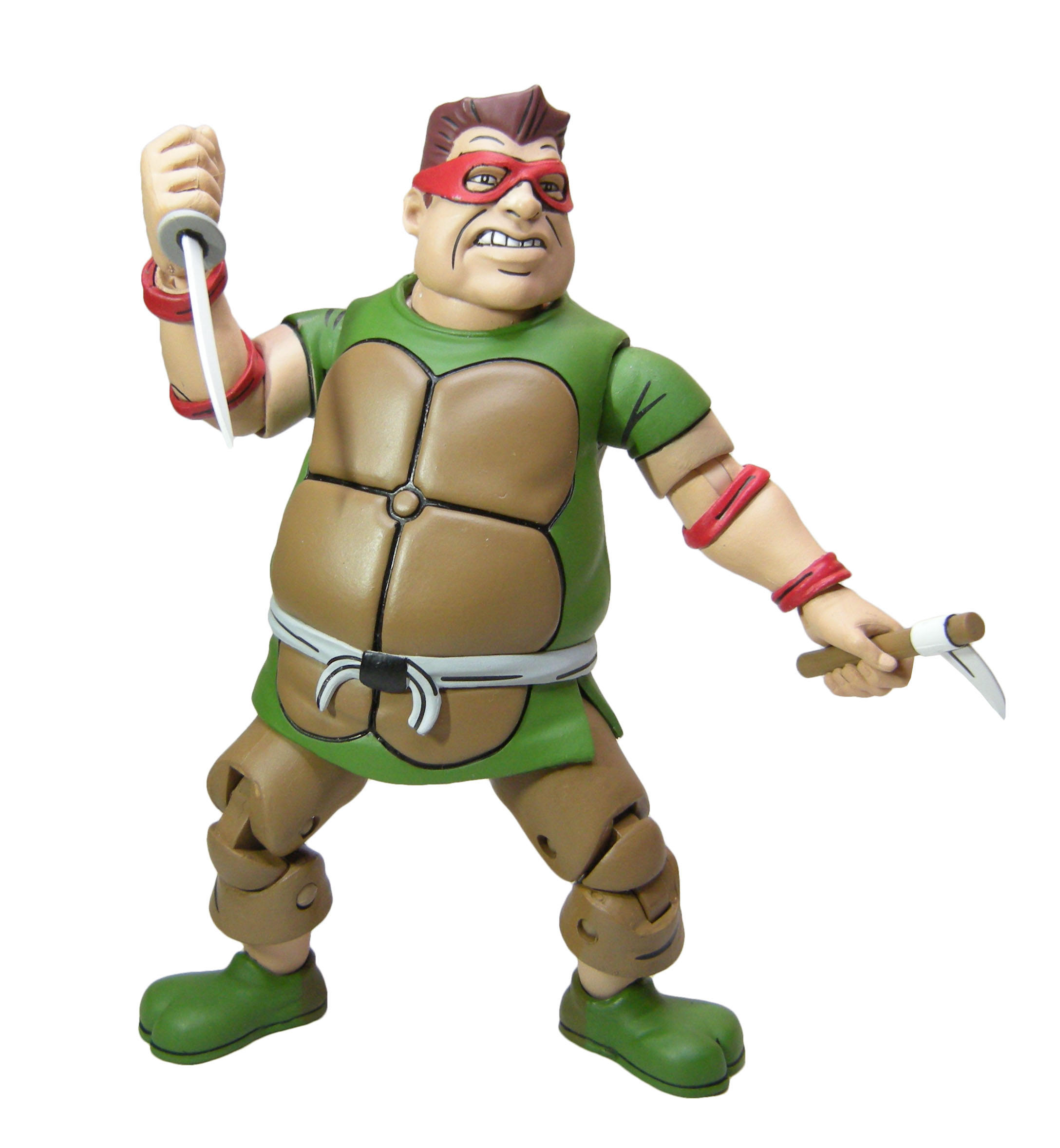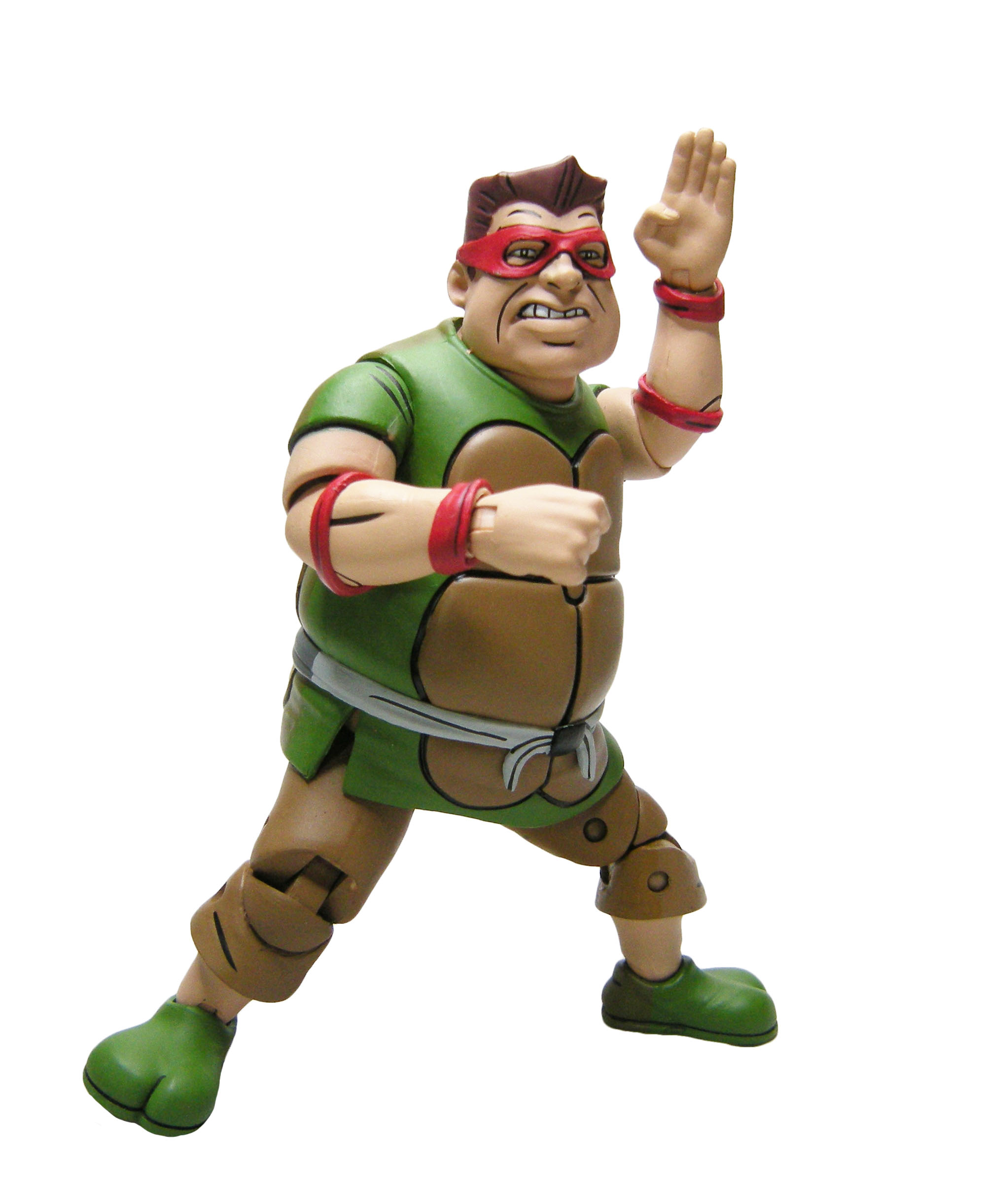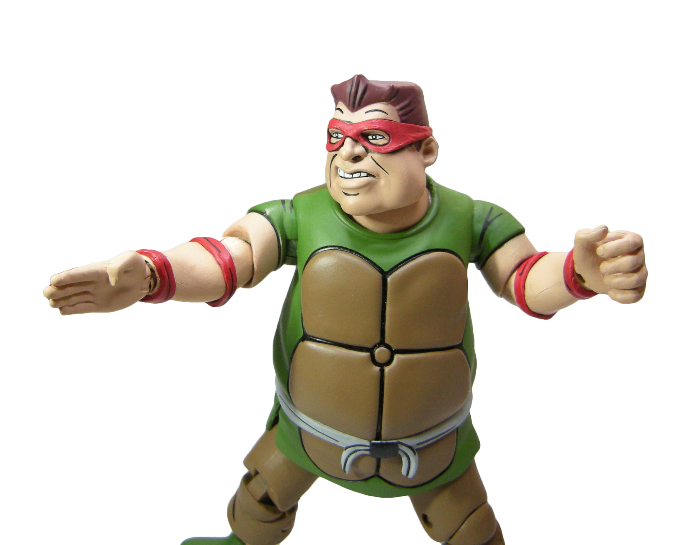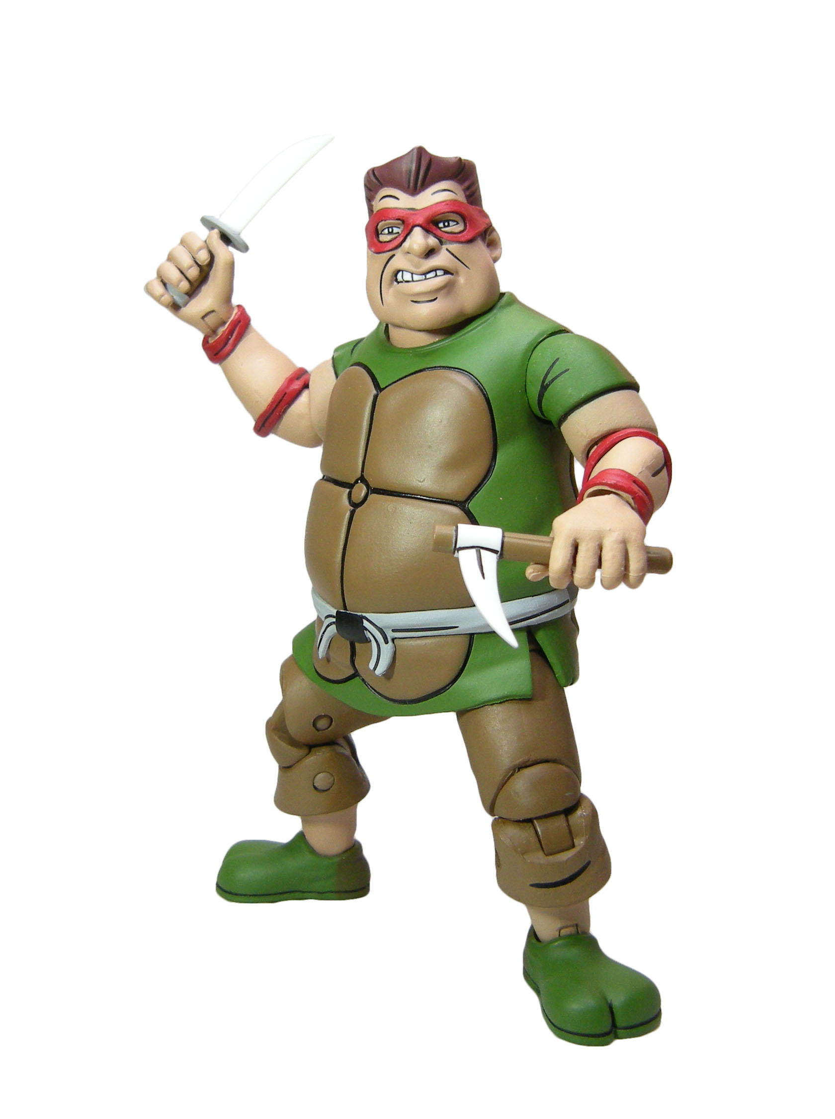 Le schéma de couleur est le même que pour les membres du Crooked Ninja Turtle Gang. J’ai peut-être juste une réserve sur le vert employé à l’avant, trop clair rapport à celui de l’arrière qui correspond mieux à celui utilisé pour les zones d’ombrage dans l’épisode du dessin animé. La carapace dans le dos dispose de deux couleurs, marron et jaune/brun, comme dans la série.