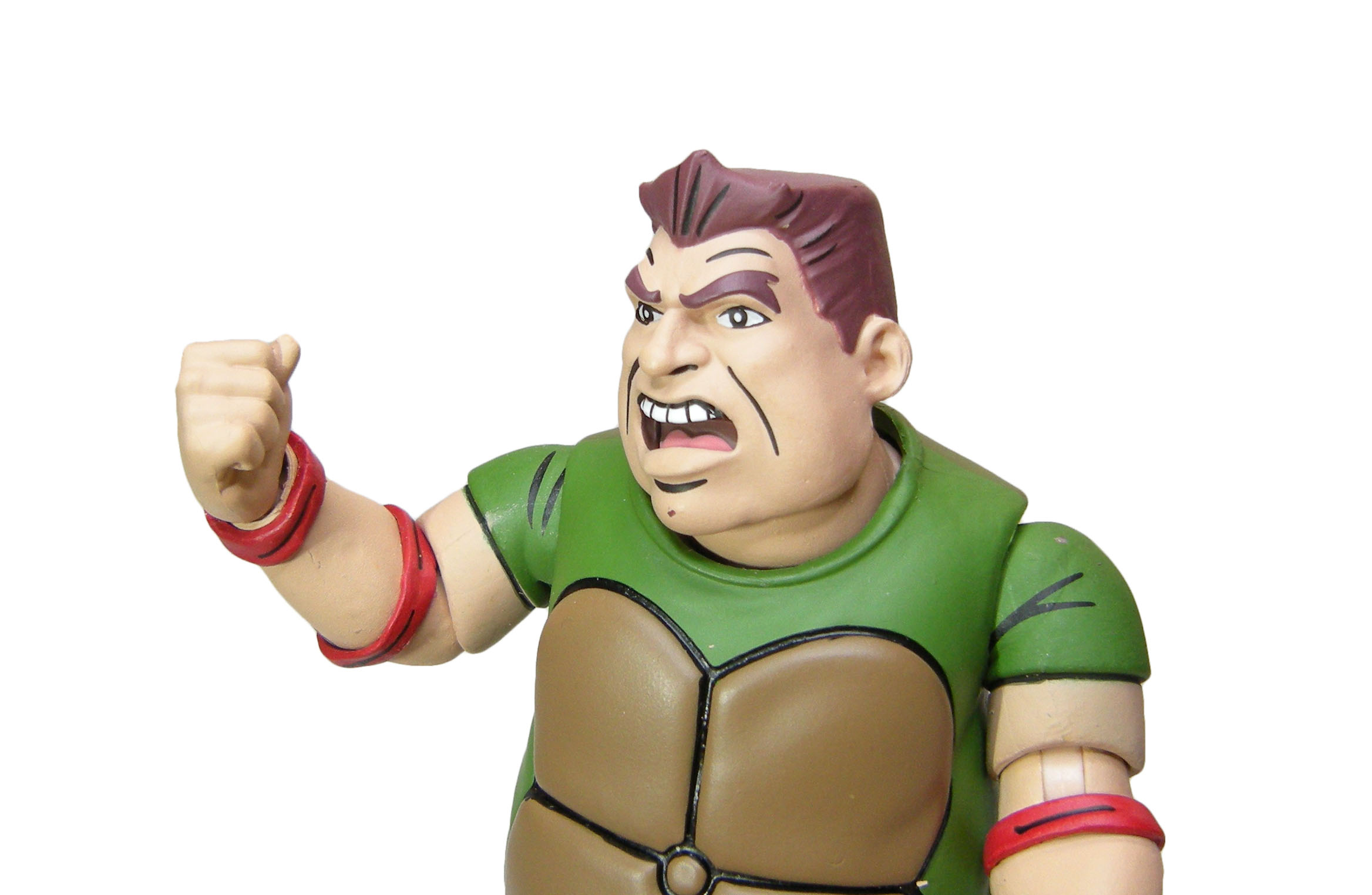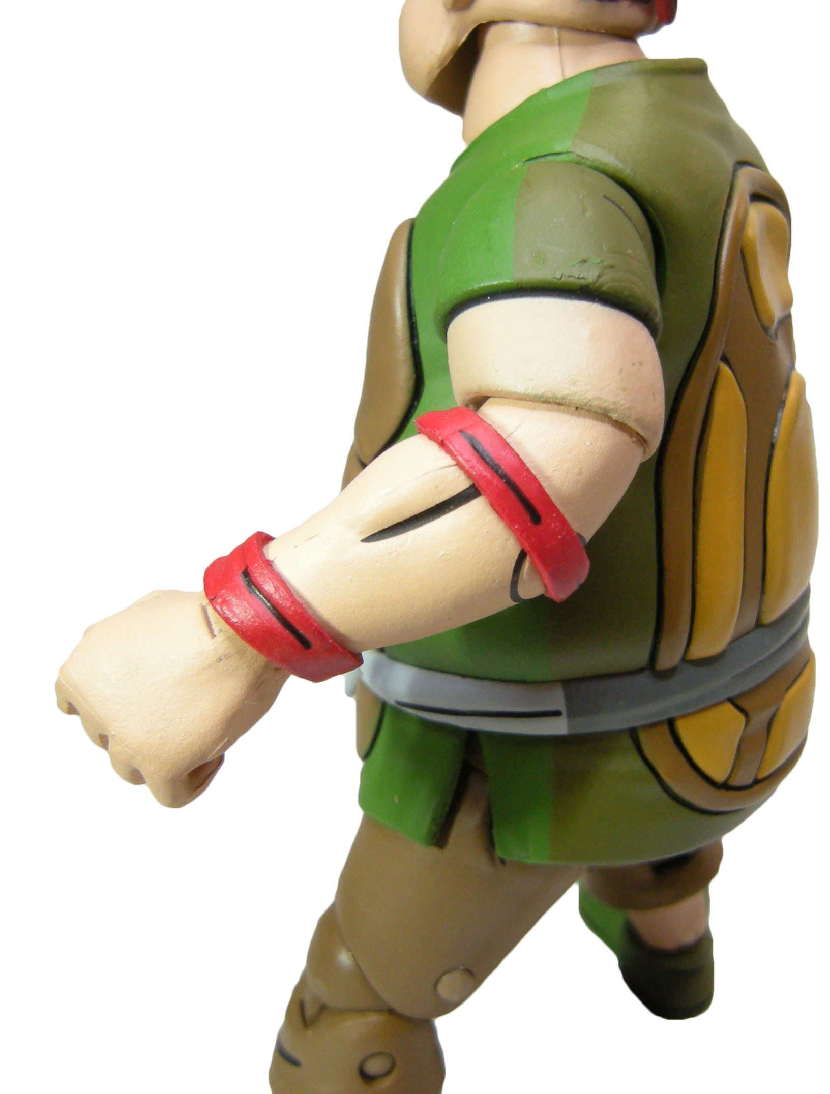 La réutilisation de ces longs avant-bras aux formes très particulières entraîne la conception de bras beaucoup trop courts et mal adaptés à cette figurine-ci. On a le sentiment que NECA lui a donné tout simplement les mauvais membres. Dans le dessin animé, les manches de son t-shirt devraient d’ailleurs être plus longues, se terminant quasiment au niveau du creux de ses bras (voir l’image de présentation de Smash en début de review). Il ne faut donc pas tenir compte de l’articulation comme plis du bras. Le coude de la figurine est lui-même matérialisé au niveau des bandelettes rouges. Mais pourquoi lui avoir donné de tels bras ??