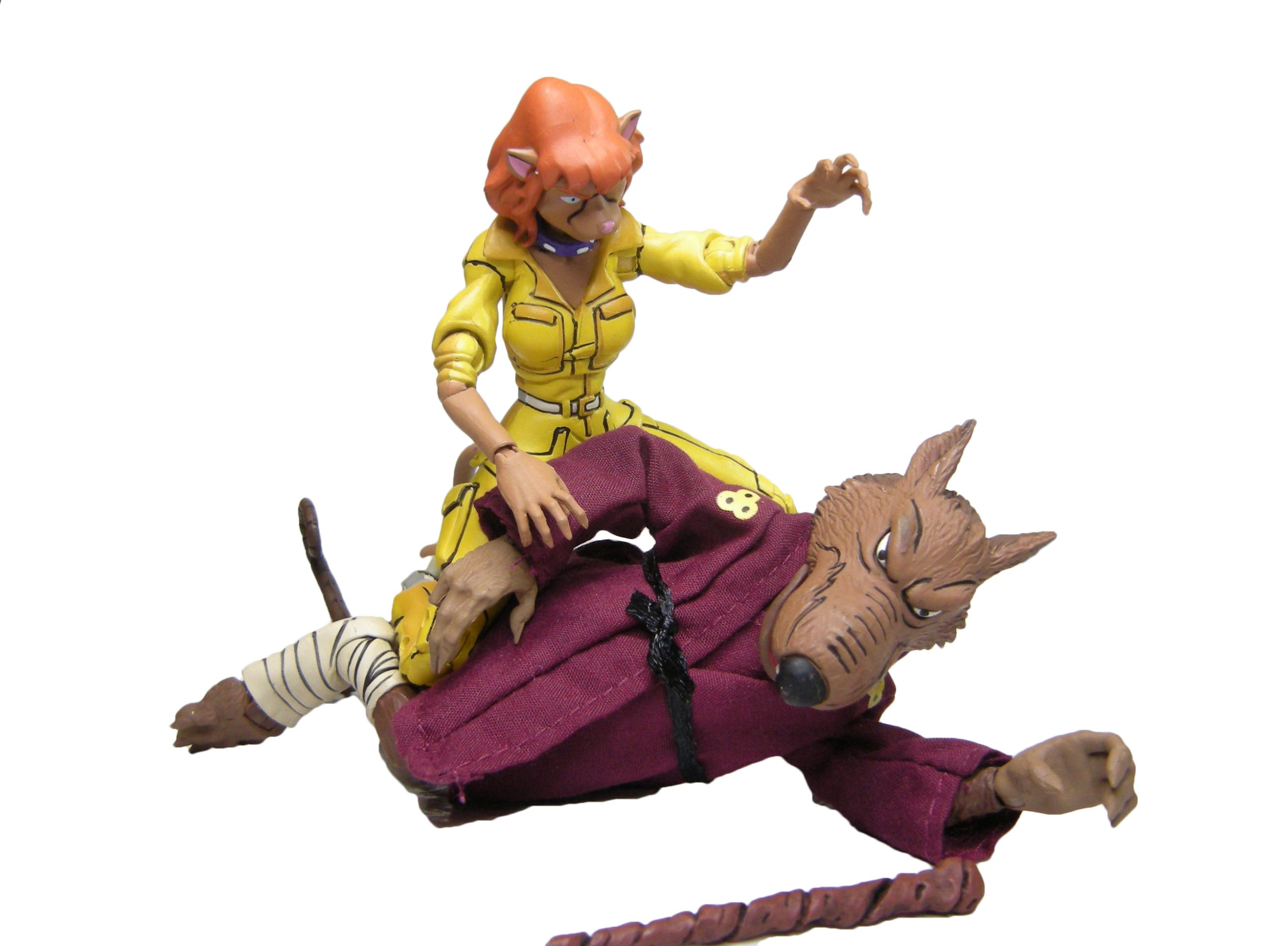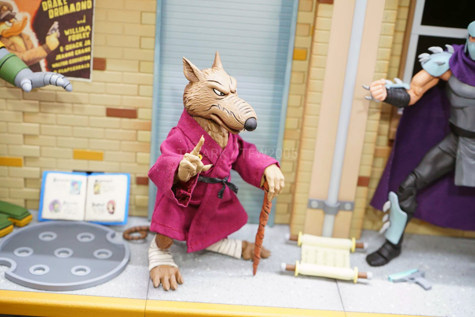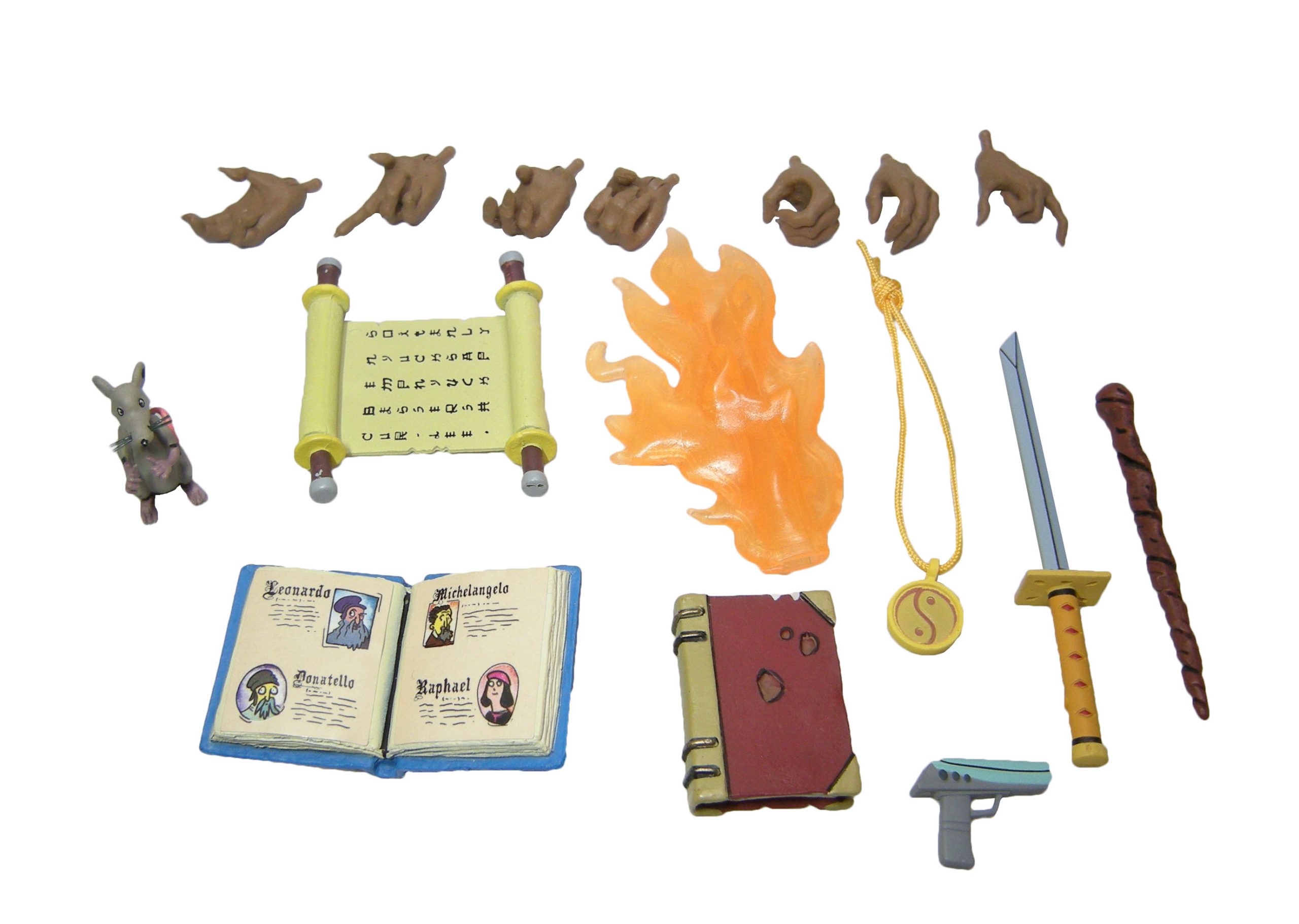 Les autres accessoires renvoient à des moments précis de la série. Le petit rat était un immanquable, il s’agit de l’un des nombreux compagnons de Hamato Yoshi lorsqu’il part se cacher dans les égouts de New York avant sa transformation (Sur la piste des tortues, S1 E1). Le rat se tient sur deux pattes et possède même des moustaches en tige plastique très fines.