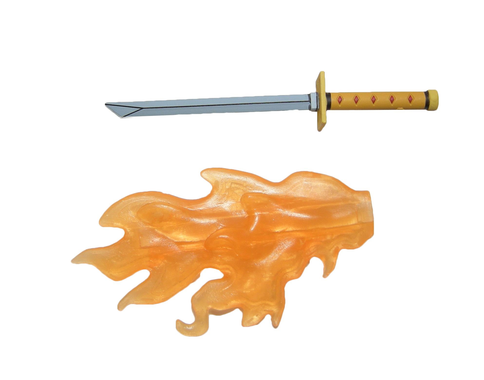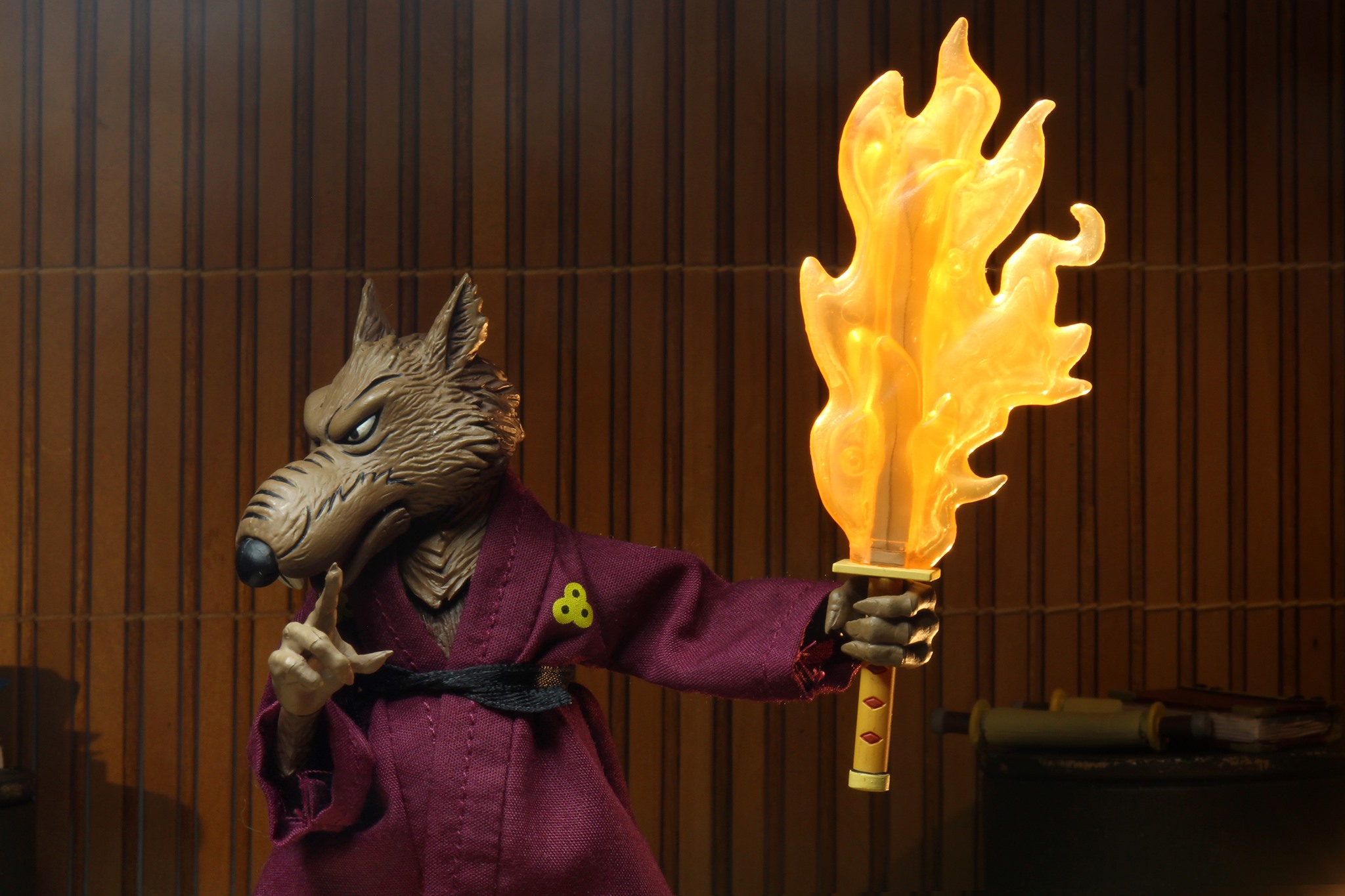 Le sabre qui est fourni avec Splinter est le sabre de Yurikawa, une lame légendaire capable de prendre l’apparence de n’importe quelle arme entre les mains de son possesseur. Splinter avait tout fait pour empêcher Shredder de mettre la main dessus, jusqu’à défier, le visage masqué, ses propres élèves. À cette occasion, il avait fait jaillir du feu de sa lame, autre accessoire de ce pack (Le sabre de Yurikawa, S6 E5). La flamme qui est fournie dans cette boîte peut être enfilée sur la lame du sabre. Le plastique orange est translucide, permettant d’entrevoir la lame et d’imiter la lueur du feu projetée sur une figurine avec de la lumière. Bien pensé !