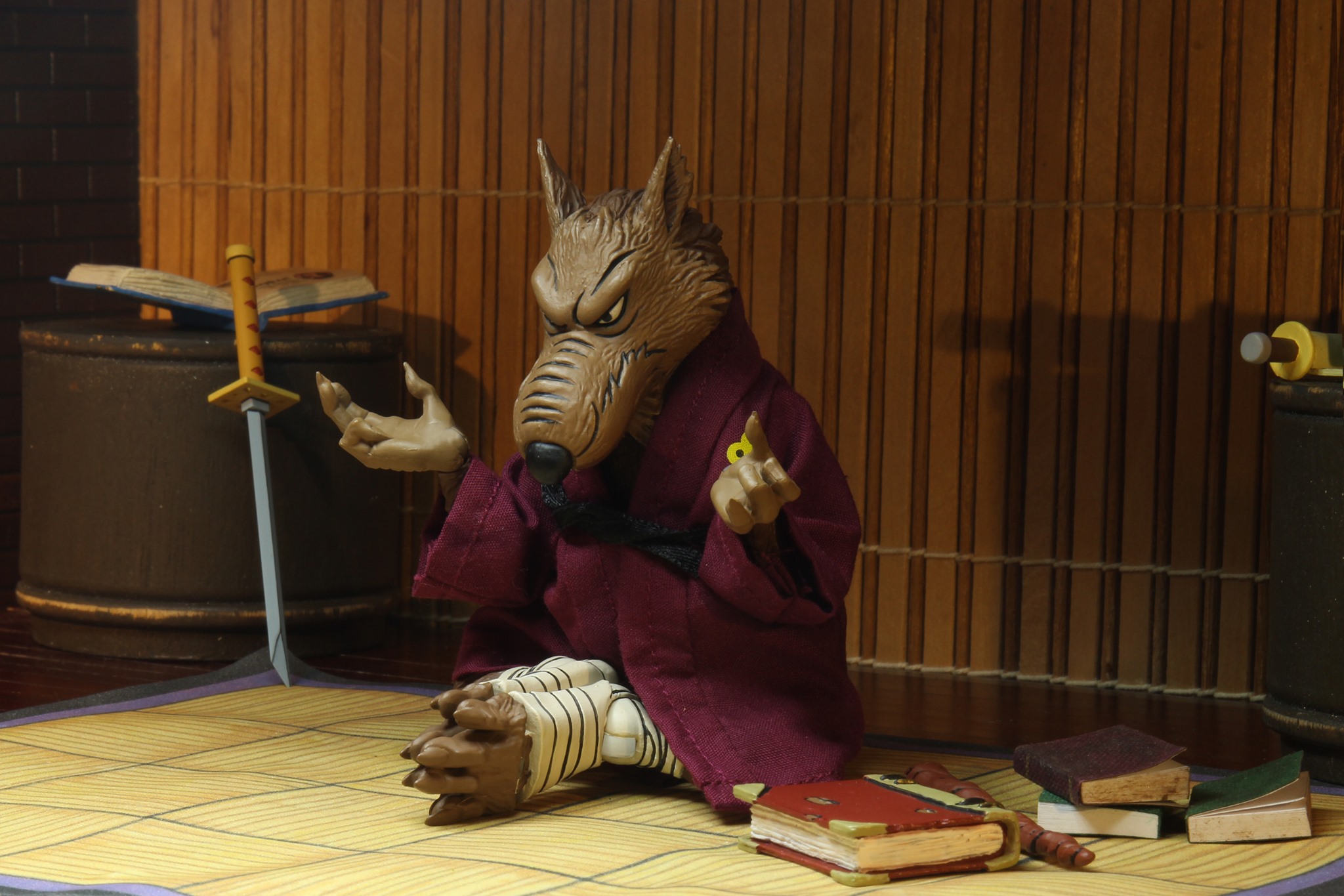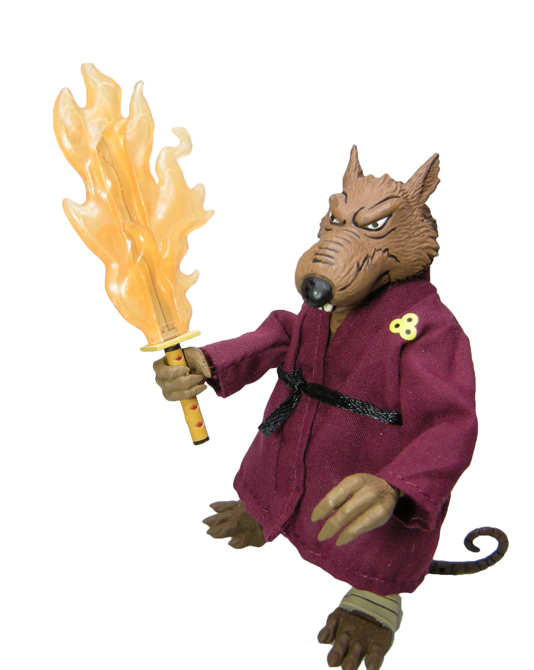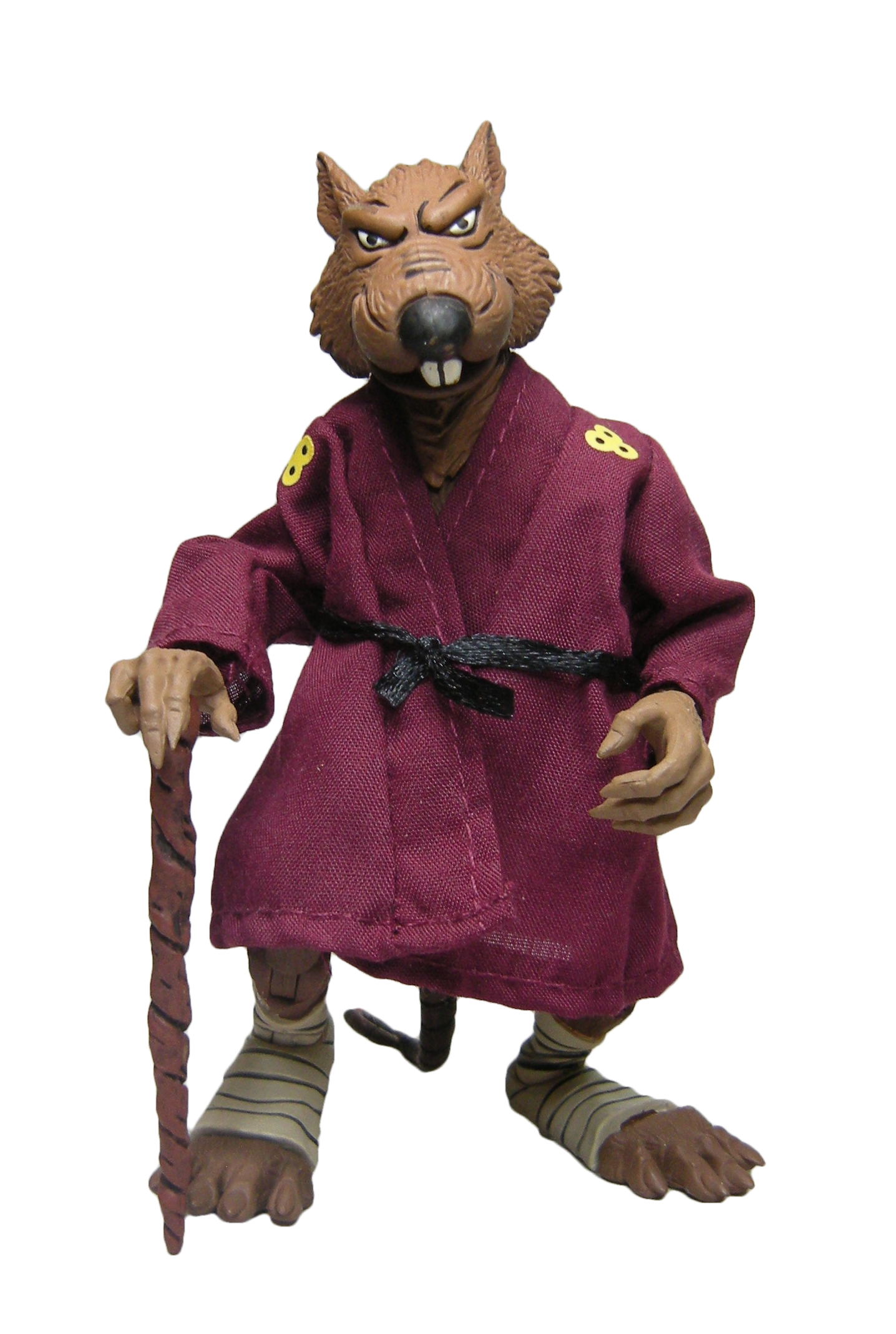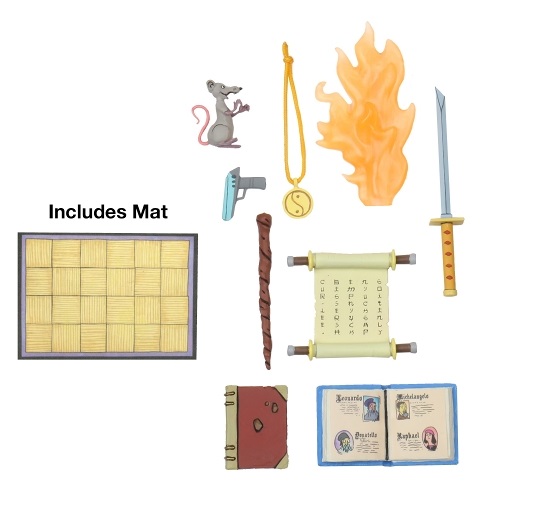 Au moment de sa sortie, Splinter était clairement la figurine munie du plus d’accessoires de la gamme du dessin animé de 1987. Trois paires de mains interchangeables et une supplémentaire, un bâton, un sabre, un parchemin, une flamme, deux livres, un collier, un rat, un pistolet et un tapis pour orner le dojo. Rien que ça ! Sans oublier sa robe et sa ceinture, qui peuvent être retirées.