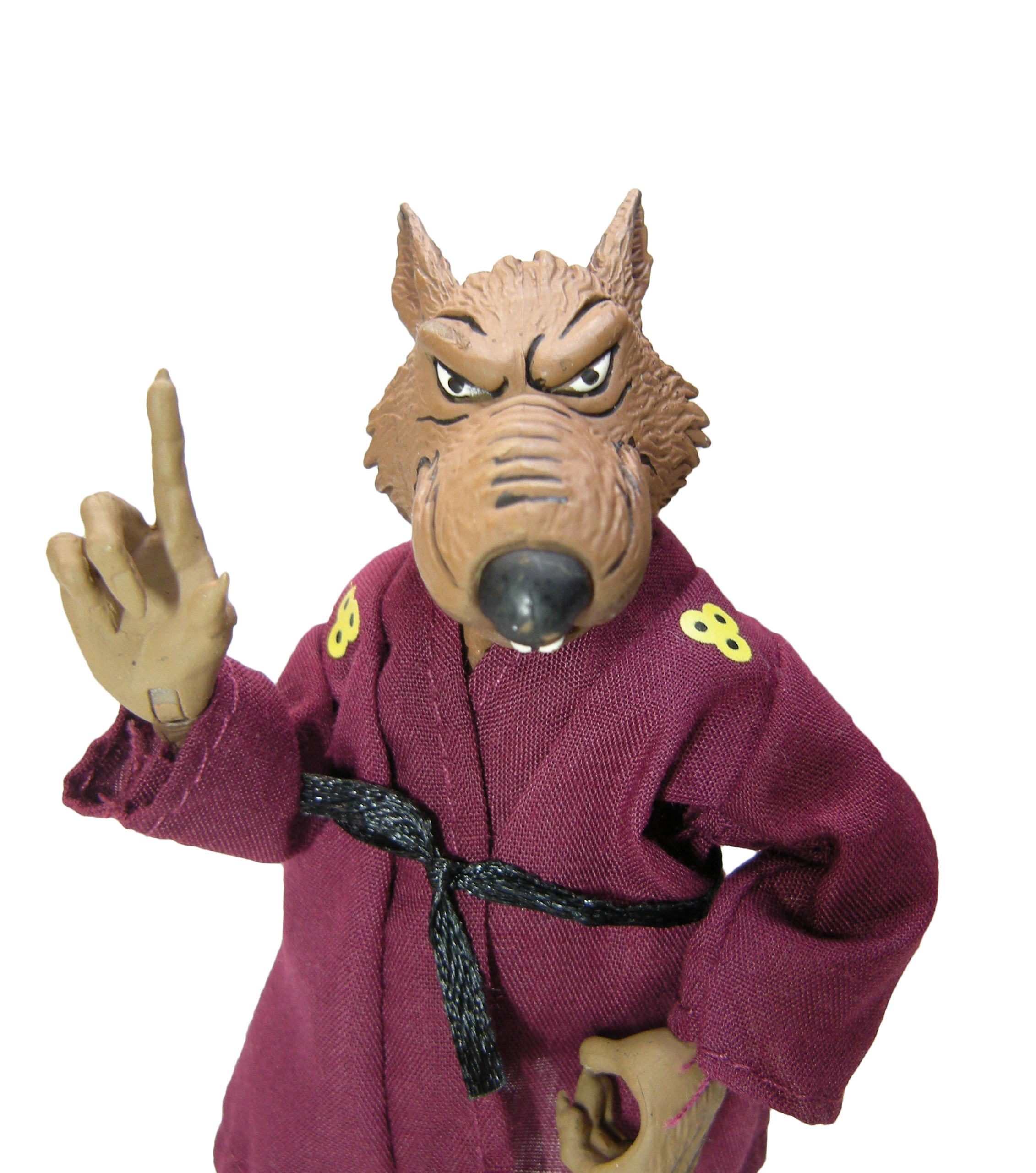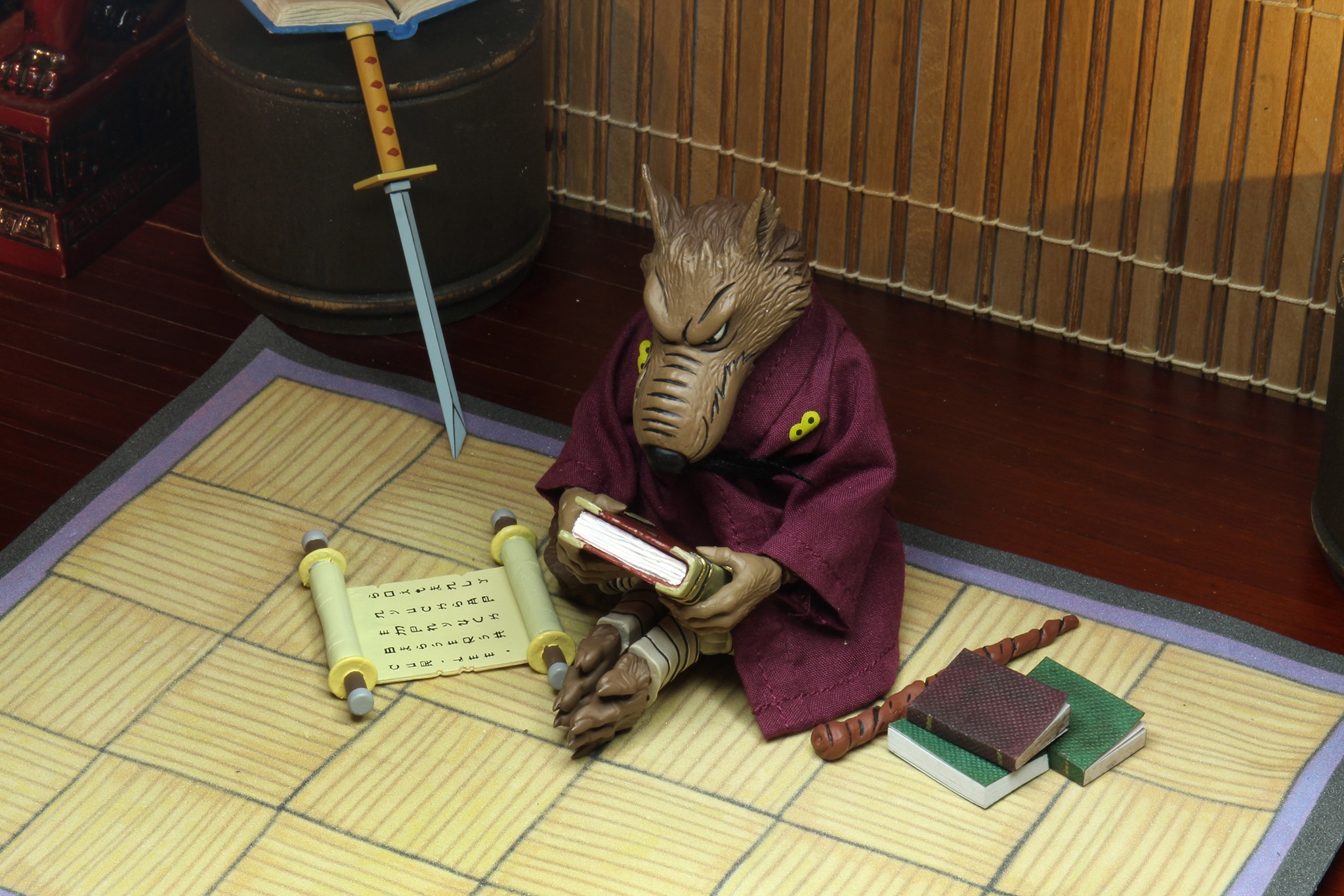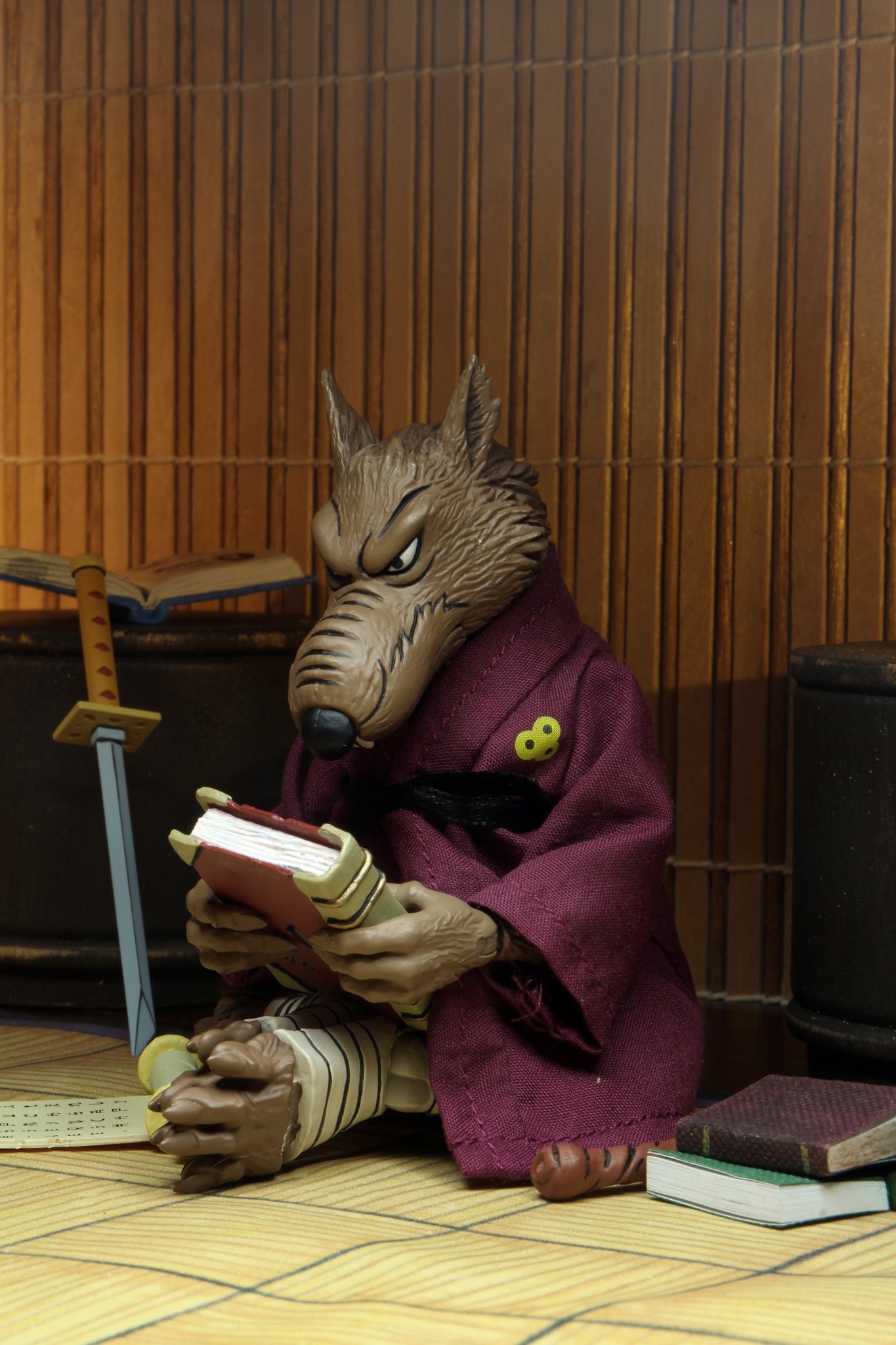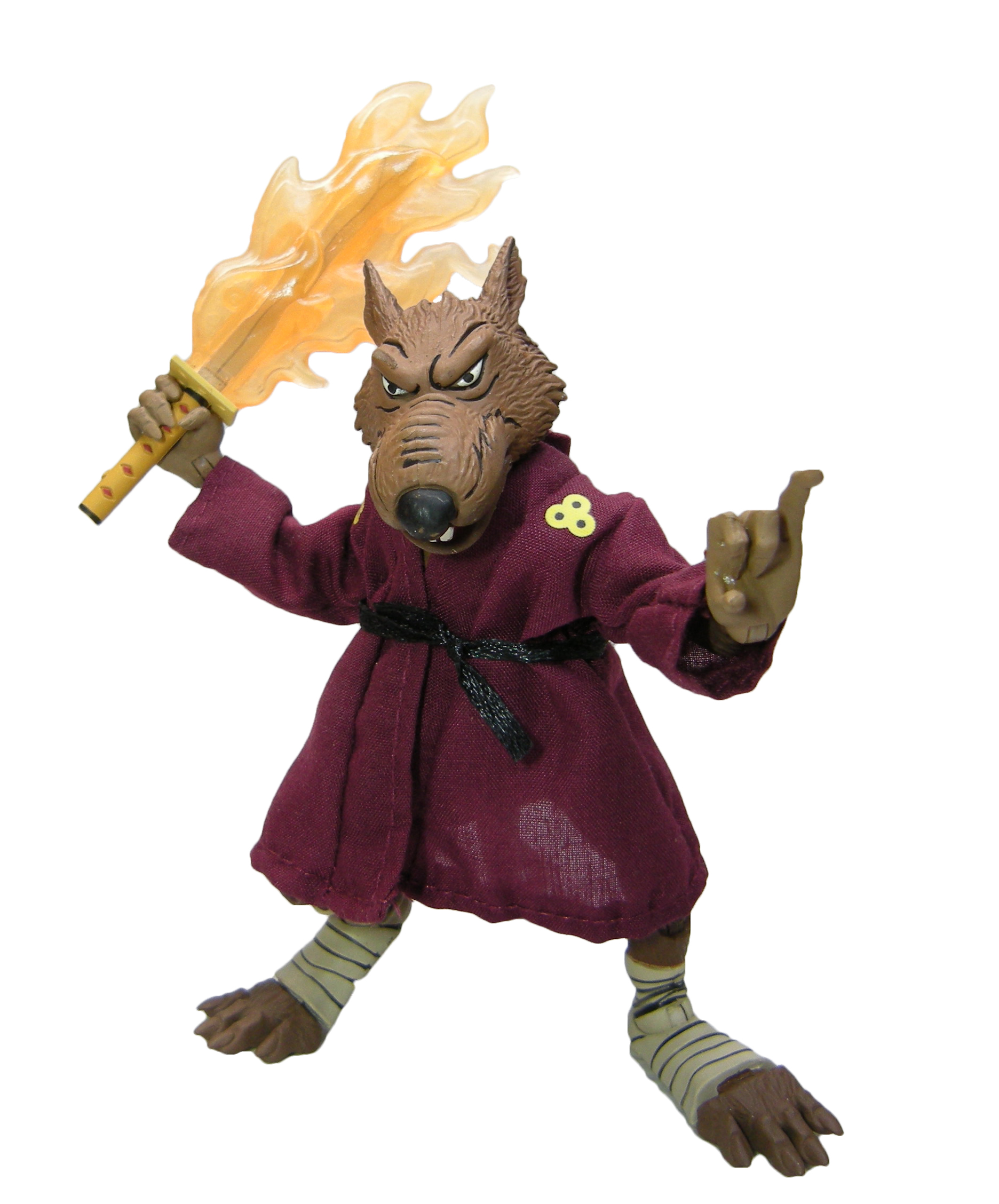 Au moment de sa sortie, Splinter était clairement la figurine munie du plus d’accessoires de la gamme du dessin animé de 1987. Trois paires de mains interchangeables et une supplémentaire, un bâton, un sabre, un parchemin, une flamme, deux livres, un collier, un rat, un pistolet et un tapis pour orner le dojo. Rien que ça ! Sans oublier sa robe et sa ceinture, qui peuvent être retirées.